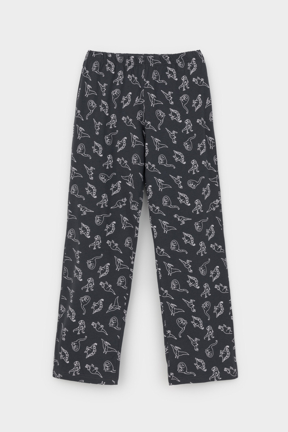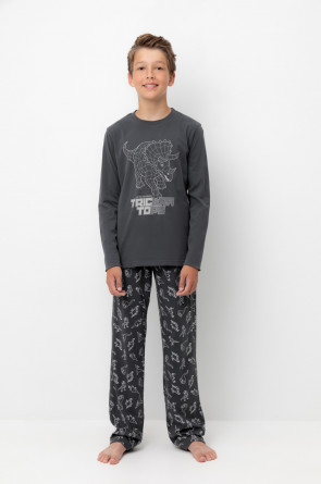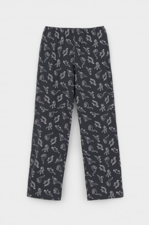 Трикотажный пижамный комплект из натурального хлопка. У джемпера длинные втачные рукава. Брюки с удобным поясом на резинке и утягивающим плетеным шнуром. Оригинальная набивка выполнена из стойких, гипоаллергенных текстильных красителей. Все трикотажные полотна производятся в соответствии с нормами Швейцарского сертификата ЭкоТекс.