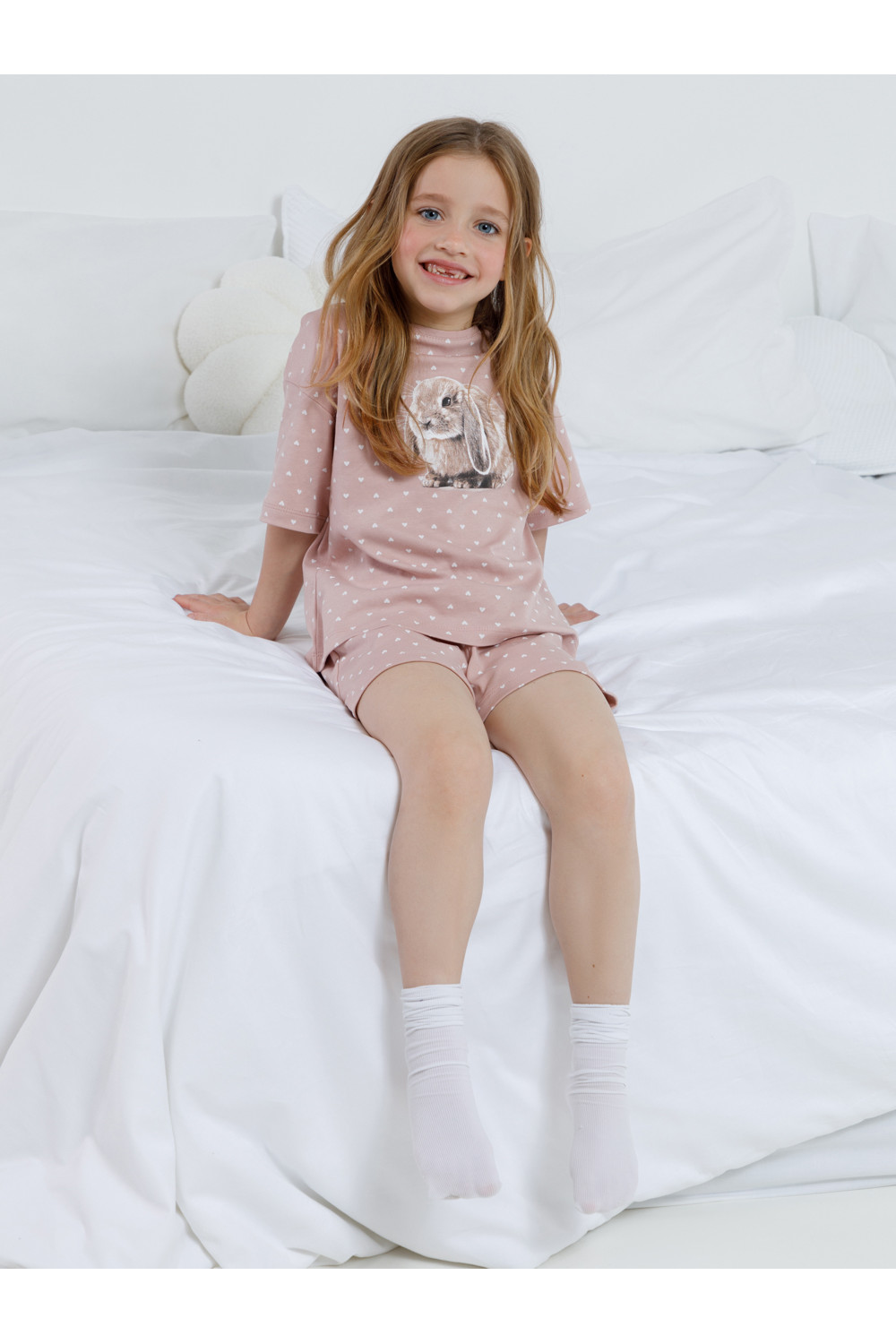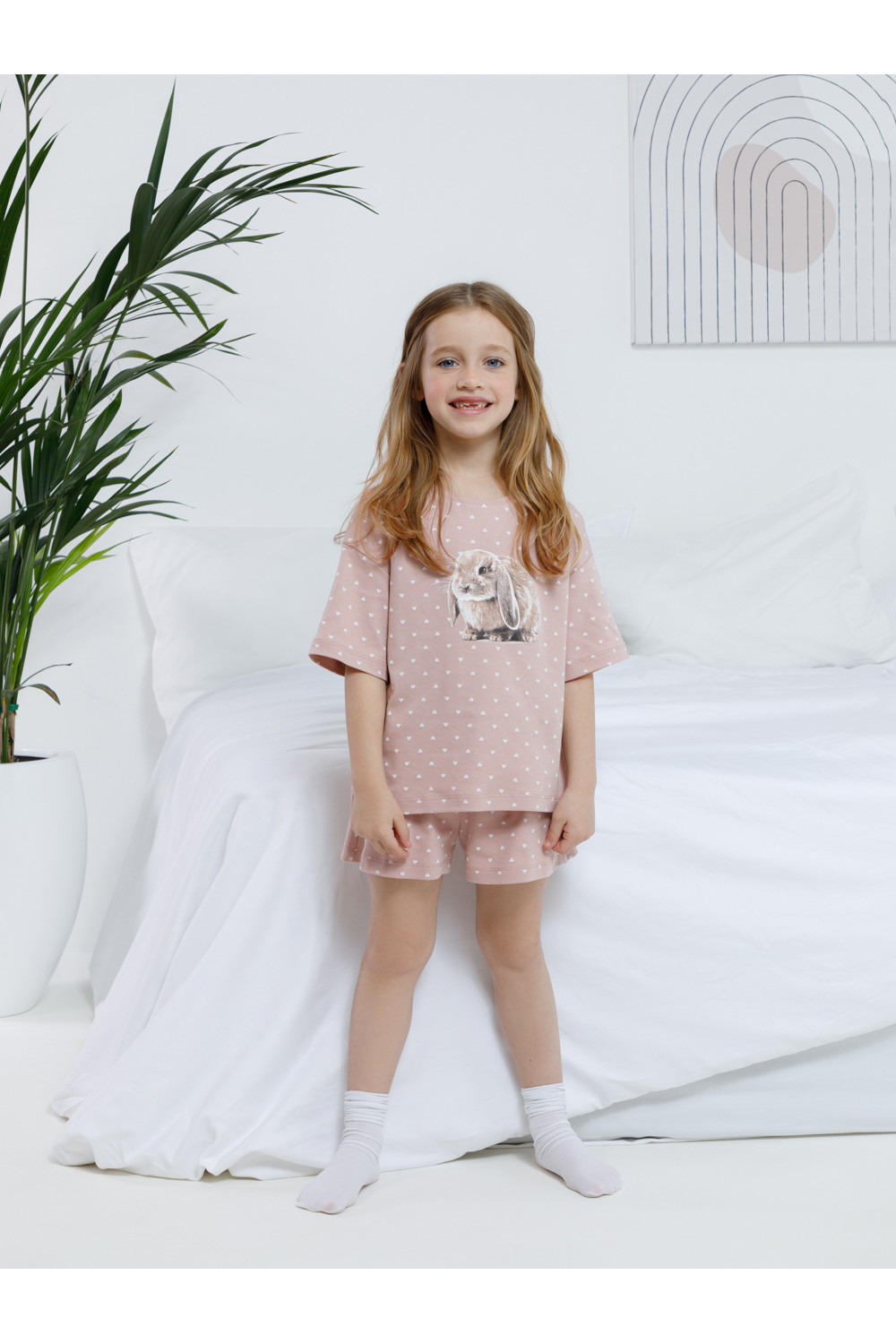 Трикотажная пижама из натурального хлопка для комфортного сна и отдыха. Футболка с короткими спущенными рукавами и шорты с мягкой эластичной резинкой в поясе. Оригинальная набивка и принт выполнены из стойких текстильных гипоаллергенных красителей. Изделие сохраняет цвет и форму после многократных стирок. Все трикотажные полотна производятся в соответствии с нормами швейцарского сертификата ЭкоТекс.