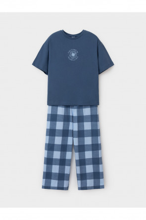 Трикотажная пижама из натурального хлопка для комфортного сна и отдыха. Футболка с короткими спущенными рукавами и прямые брюки с мягкой эластичной резинкой в поясе изготовлены из гладкого трикотажа супрем. Оригинальная набивка и принт выполнены из стойких текстильных гипоаллергенных красителей. Изделие сохраняет цвет и форму после многократных стирок. Все трикотажные полотна производятся в соответствии с нормами швейцарского сертификата ЭкоТекс.