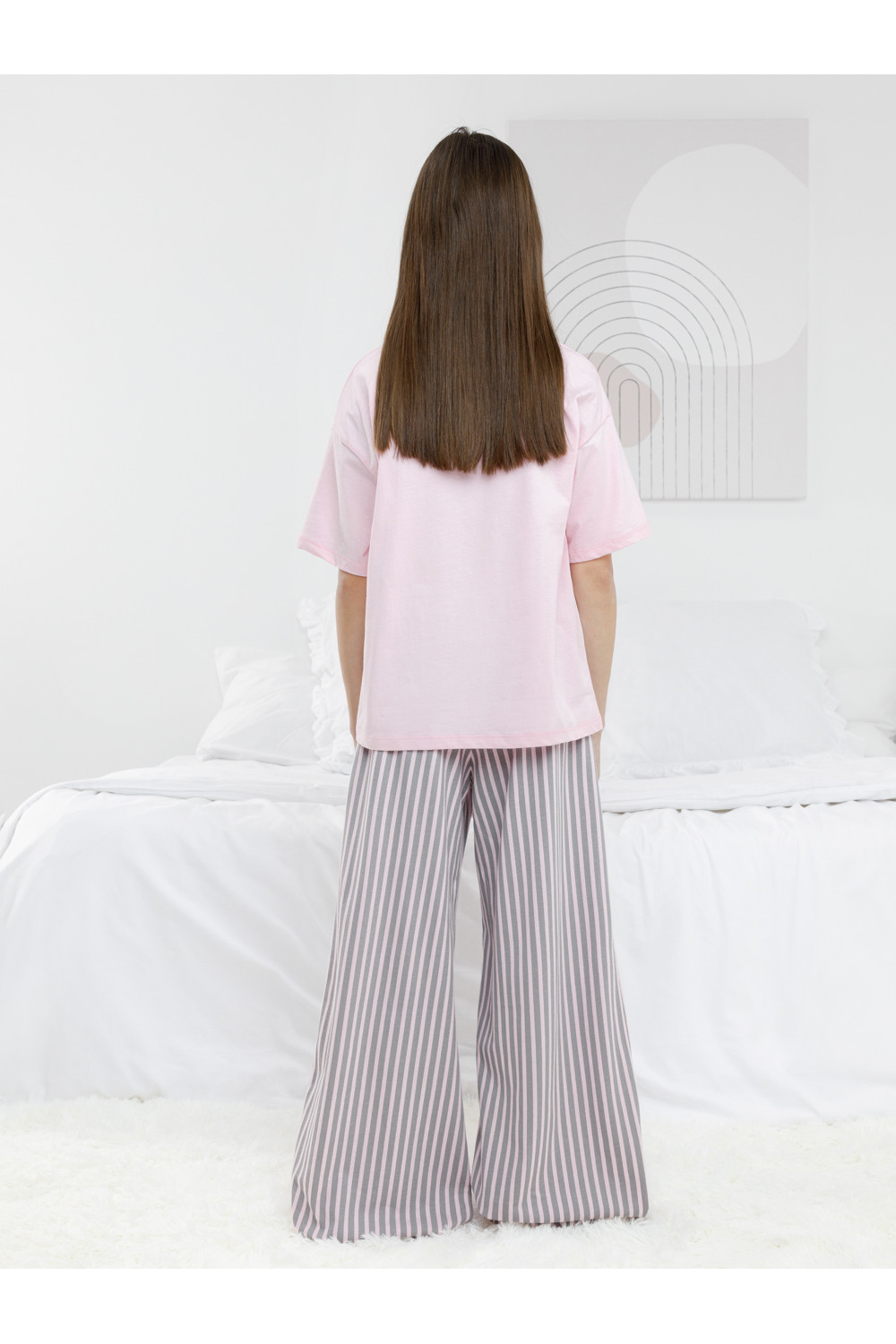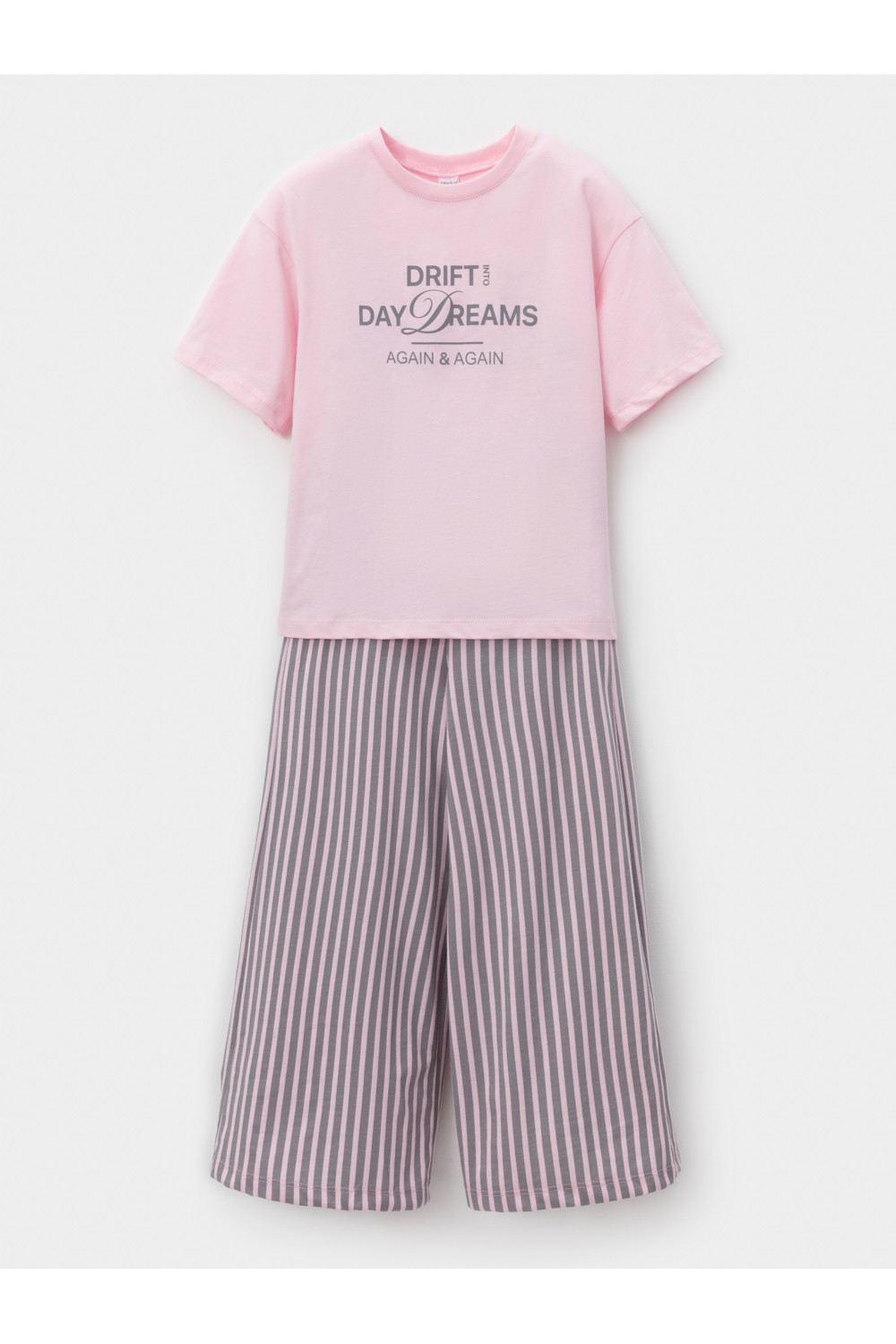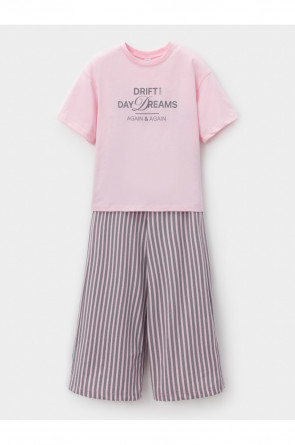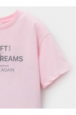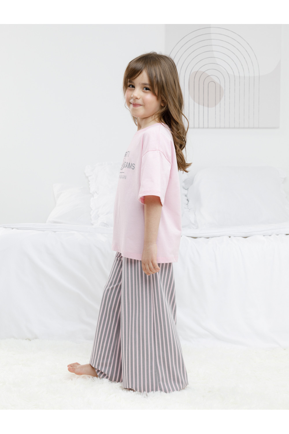 Трикотажная пижама из натурального хлопка для комфортного сна и отдыха. Свободная футболка с короткими спущенными рукавами и широкие брюки с мягкой эластичной резинкой в поясе. Оригинальный принт и набивка выполнены из стойких текстильных гипоаллергенных красителей. Изделие сохраняет цвет и форму после многократных стирок. Все трикотажные полотна производятся в соответствии с нормами швейцарского сертификата ЭкоТекс.