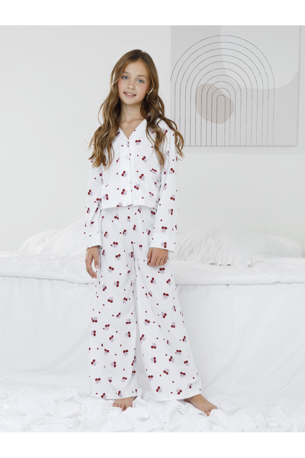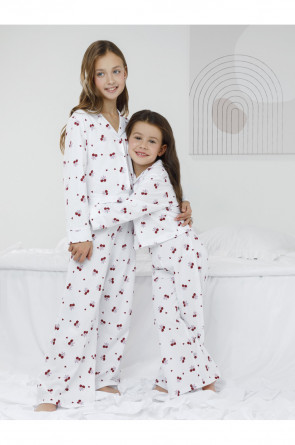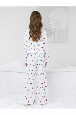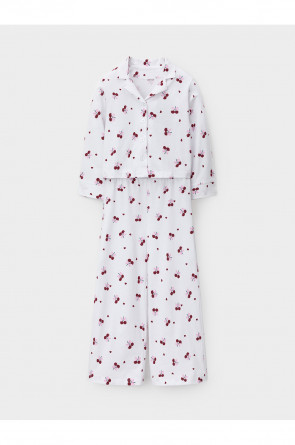 Трикотажная пижама из натурального хлопка для комфортного сна и отдыха. Рубашка на пуговицах с длинными рукавами и широкие брюки с мягкой эластичной резинкой в поясе. Набивной рисунок выполнен из стойких текстильных гипоаллергенных красителей. Изделие сохраняет цвет и форму после многократных стирок. Все трикотажные полотна производятся в соответствии с нормами швейцарского сертификата ЭкоТекс.