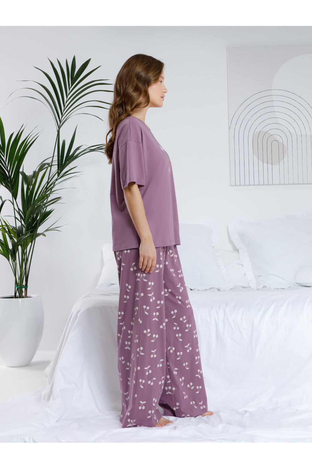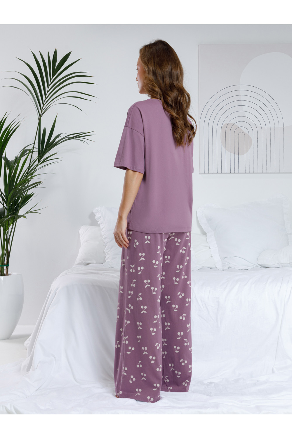 Комплект для комфортного сна и отдыха из гладкого трикотажного полотна. Футболка с короткими спущенными рукавами и прямые брюки с мягкой эластичной резинкой в поясе, которые удобно садятся по фигуре. Лёгкий материал приятен к телу, не теряет форму и позволяет коже дышать. Все трикотажные полотна производятся в соответствии с нормами швейцарского сертификата ЭкоТекс.