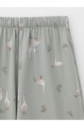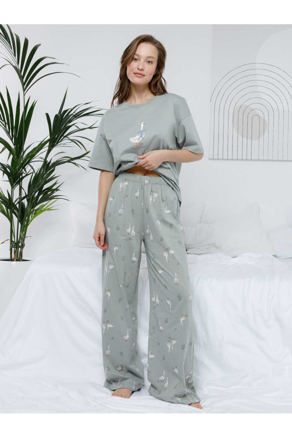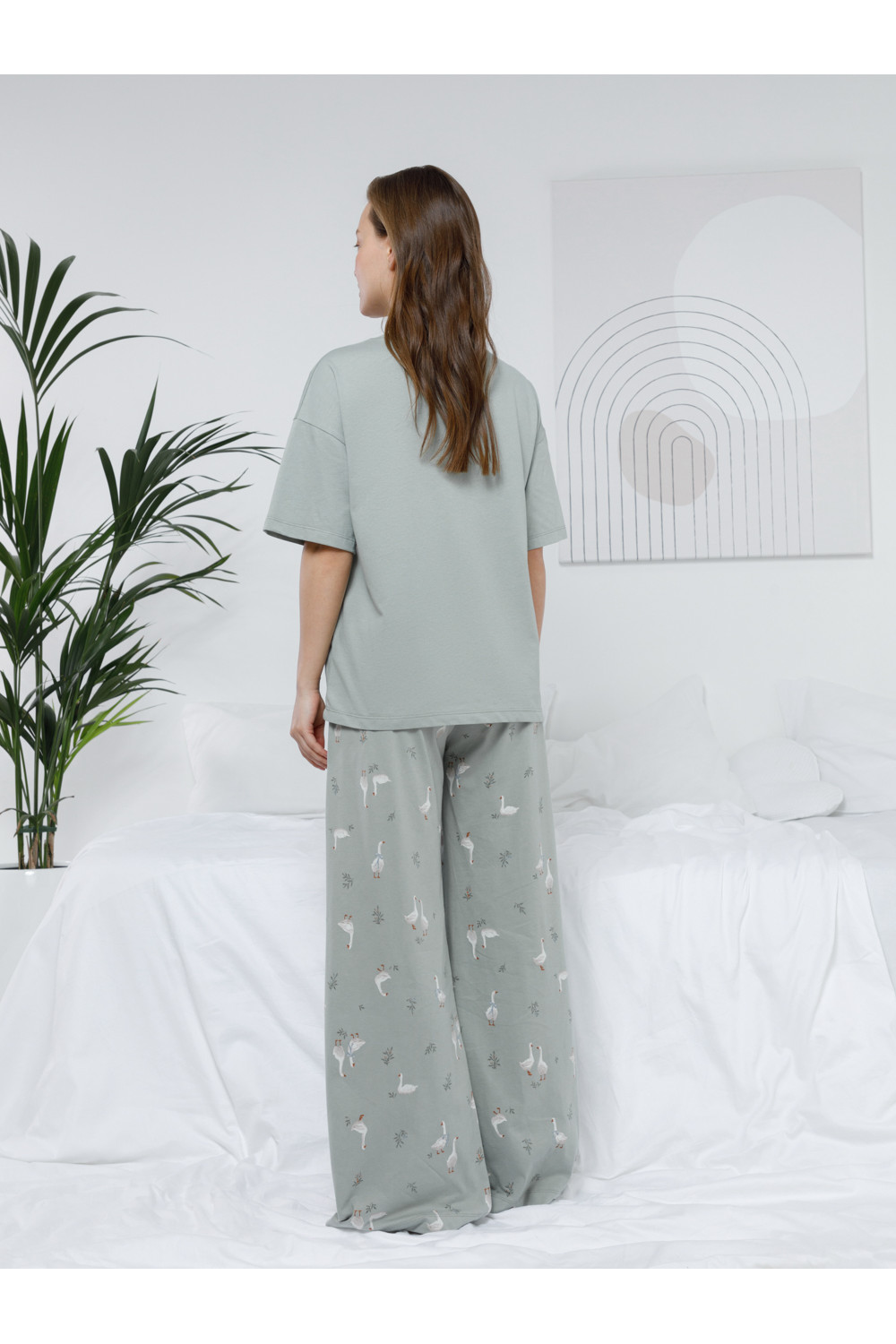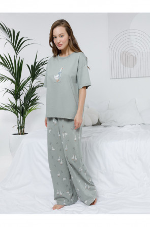 Комплект для комфортного сна и отдыха из гладкого трикотажного полотна. Футболка с короткими спущенными рукавами и прямые брюки с мягкой эластичной резинкой в поясе, которые удобно садятся по фигуре. Лёгкий материал приятен к телу, не теряет форму и позволяет коже дышать. Все трикотажные полотна производятся в соответствии с нормами швейцарского сертификата ЭкоТекс.