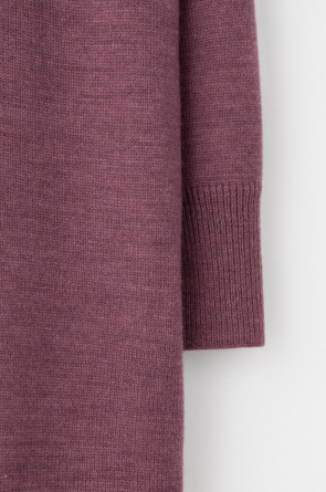Вязаное платье длины миди с длинными рукавами с рукавами реглан из полушерсти. Выполнено гладью. Прямой силуэт хорошо садится по фигуре. Манжеты и низ изделия вывязаны широкой резинкой, благодаря которой края не растягиваются.
