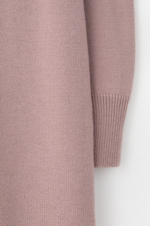 Вязаное платье длины миди с длинными рукавами с рукавами реглан из полушерсти. Выполнено гладью. Прямой силуэт хорошо садится по фигуре. Манжеты и низ изделия вывязаны широкой резинкой, благодаря которой края не растягиваются.