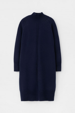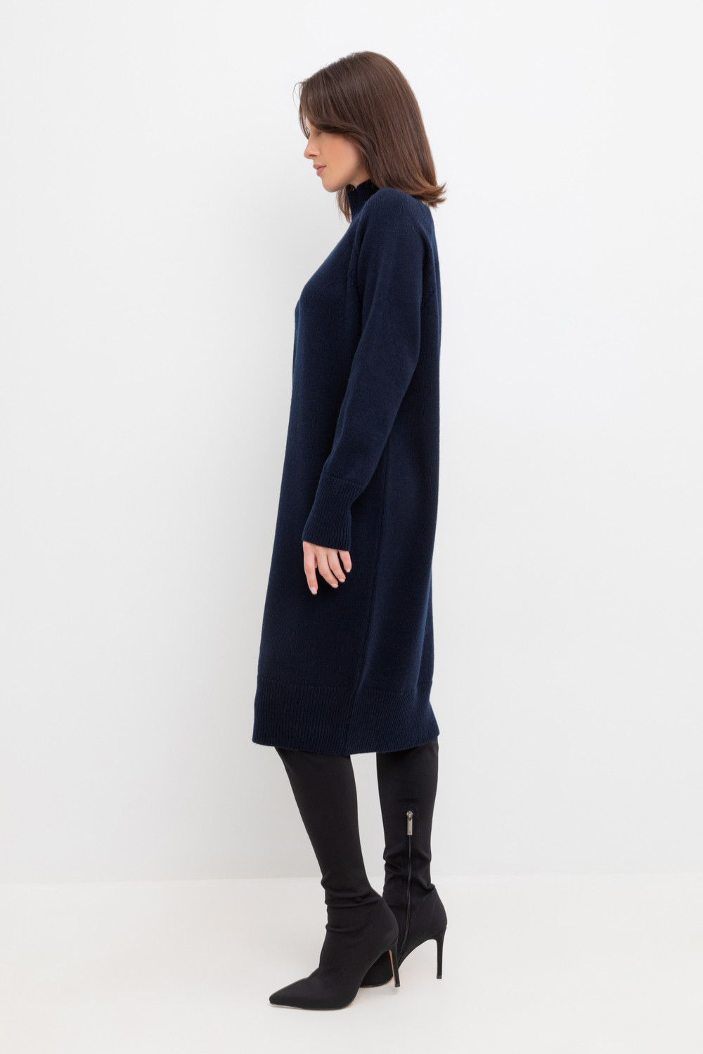 Вязаное платье длины миди с длинными рукавами реглан из полушерсти. Выполнено гладью. Прямой силуэт хорошо садится по фигуре. Манжеты и низ изделия вывязаны широкой резинкой, благодаря которой края не растягиваются.