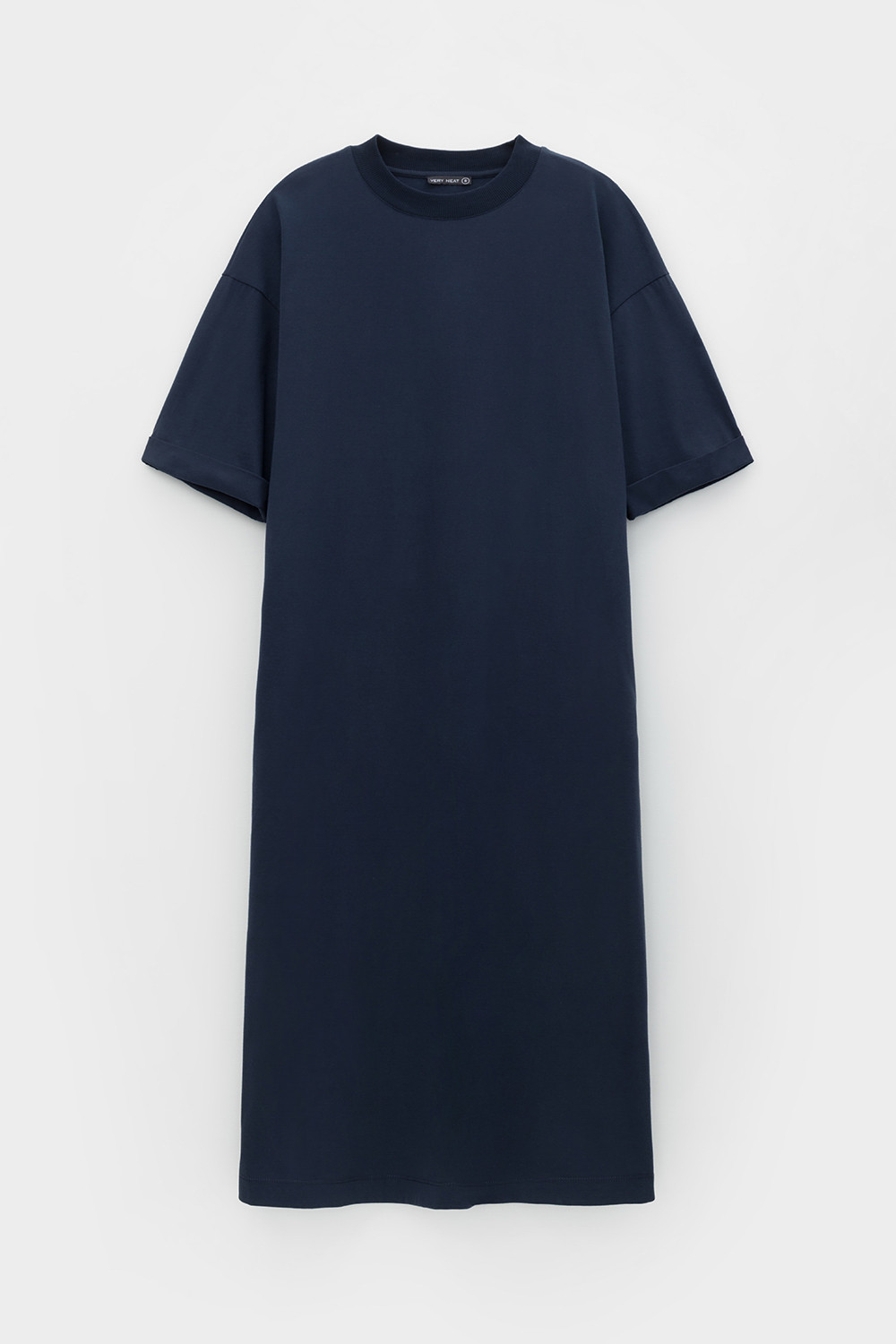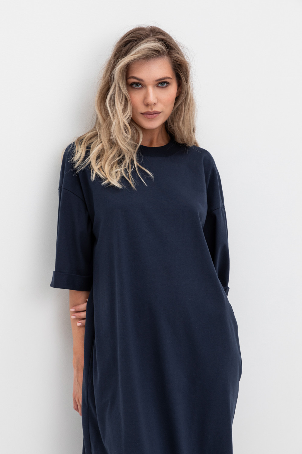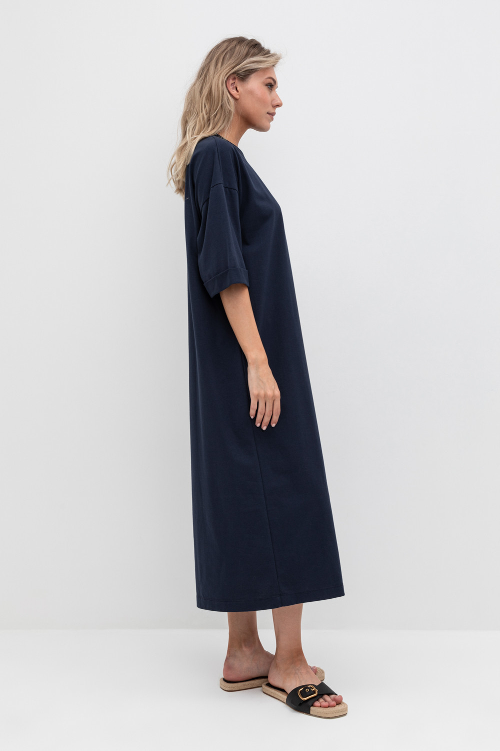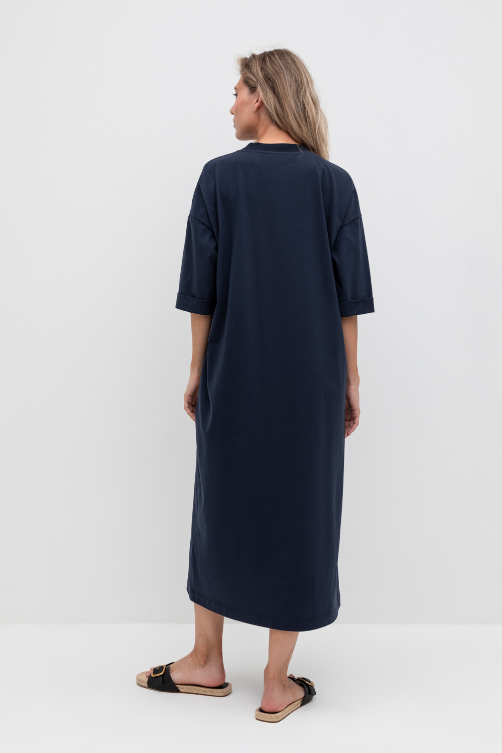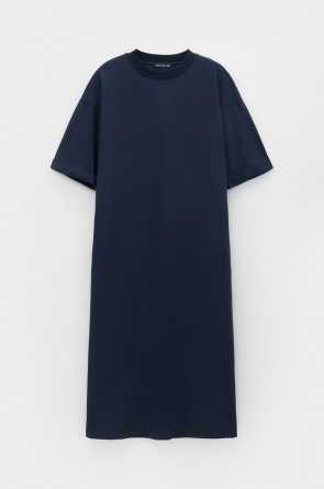 Удлиненное трикотажное платье из длинноволокнистого гребенного хлопка. Спущенное плечо придает изделию свободный силуэт.