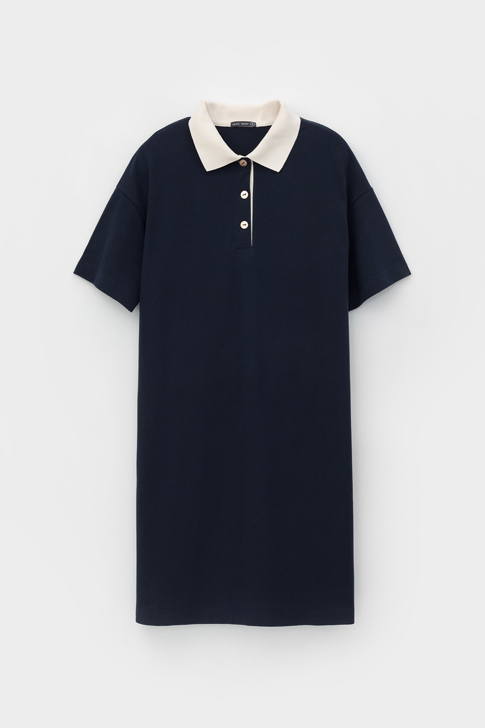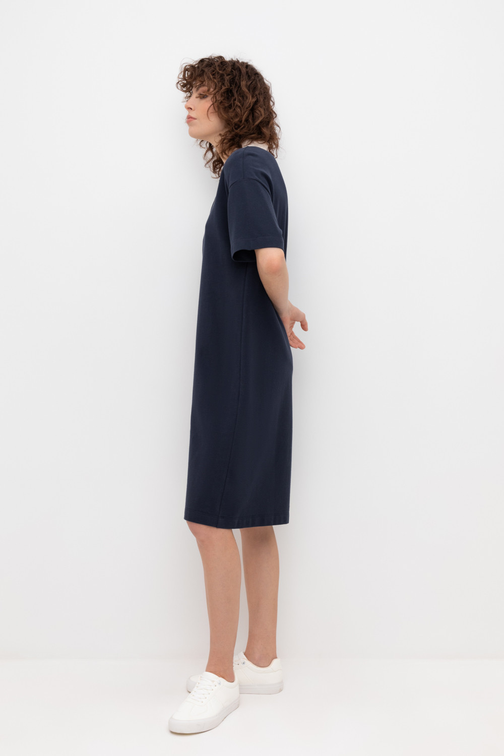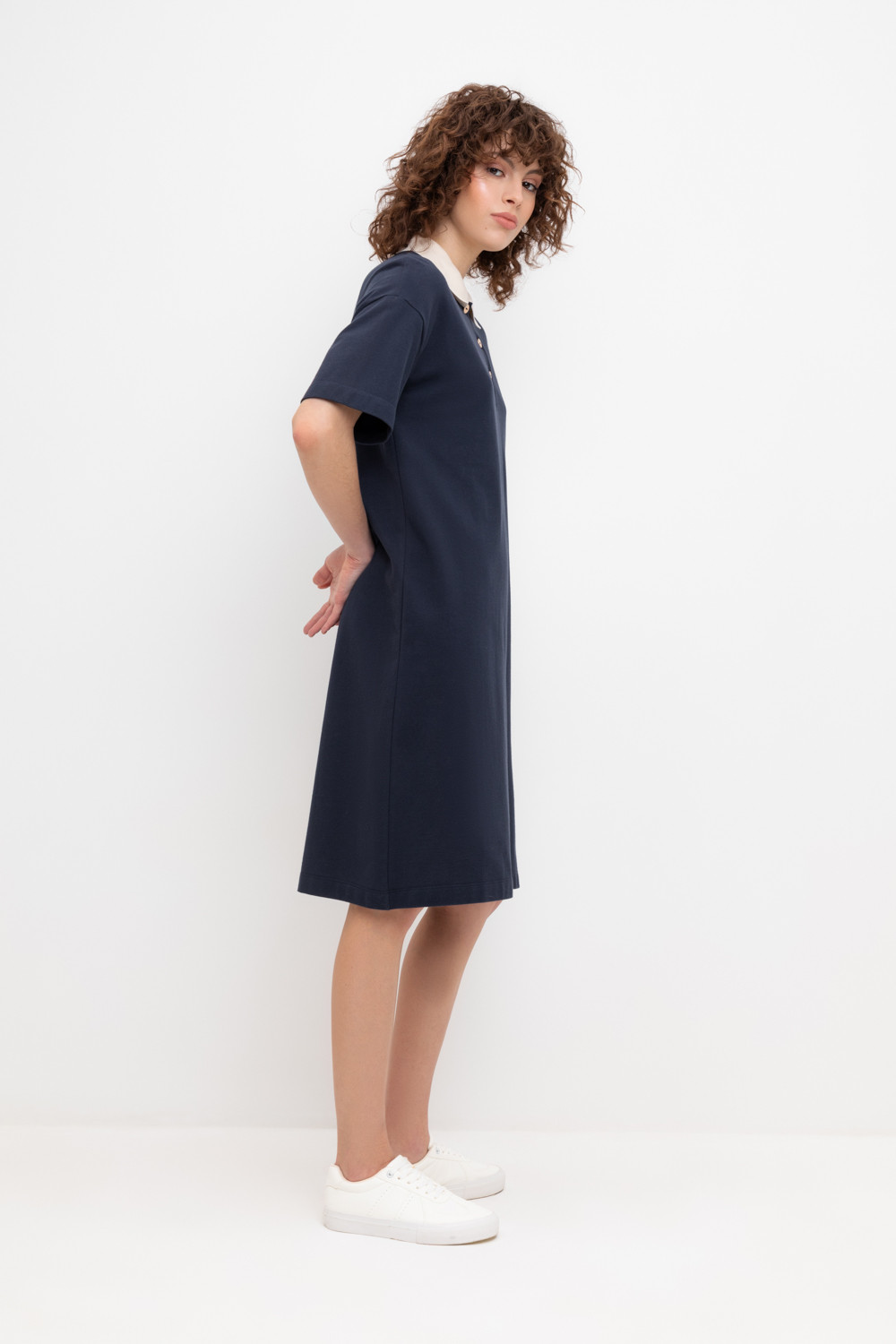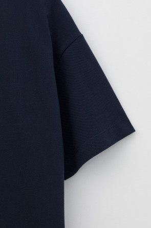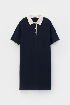 Трикотажное платье-поло из длинноволокнистого гребенного хлопка. Спущенное плечо придает изделию свободный силуэт.