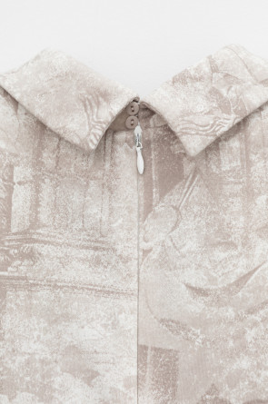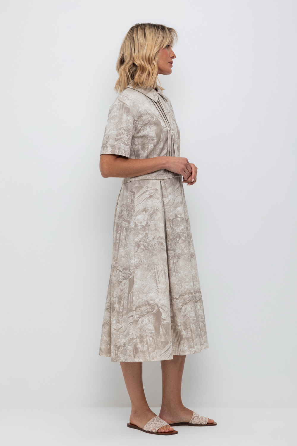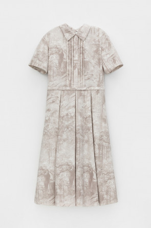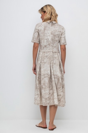Платье с воротником из плотного набивного трикотажа интерлок. Модель с короткими рукавами, юбкой в складку и декоративными застроченными складками по груди.