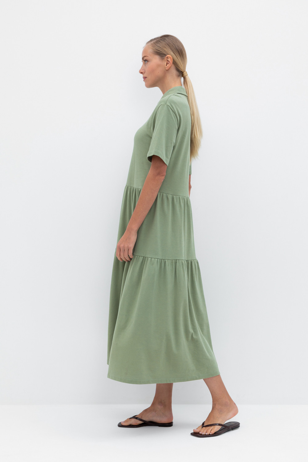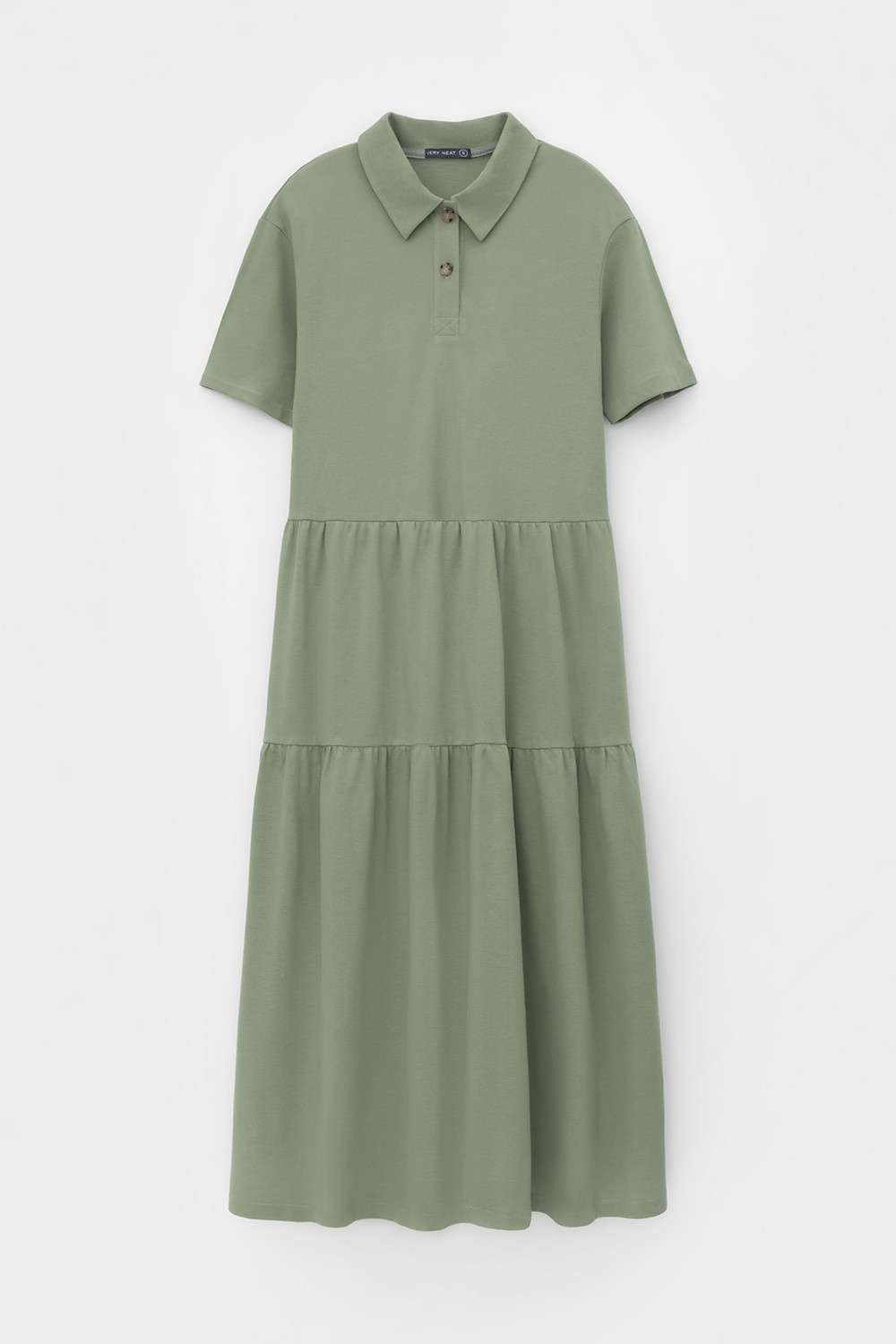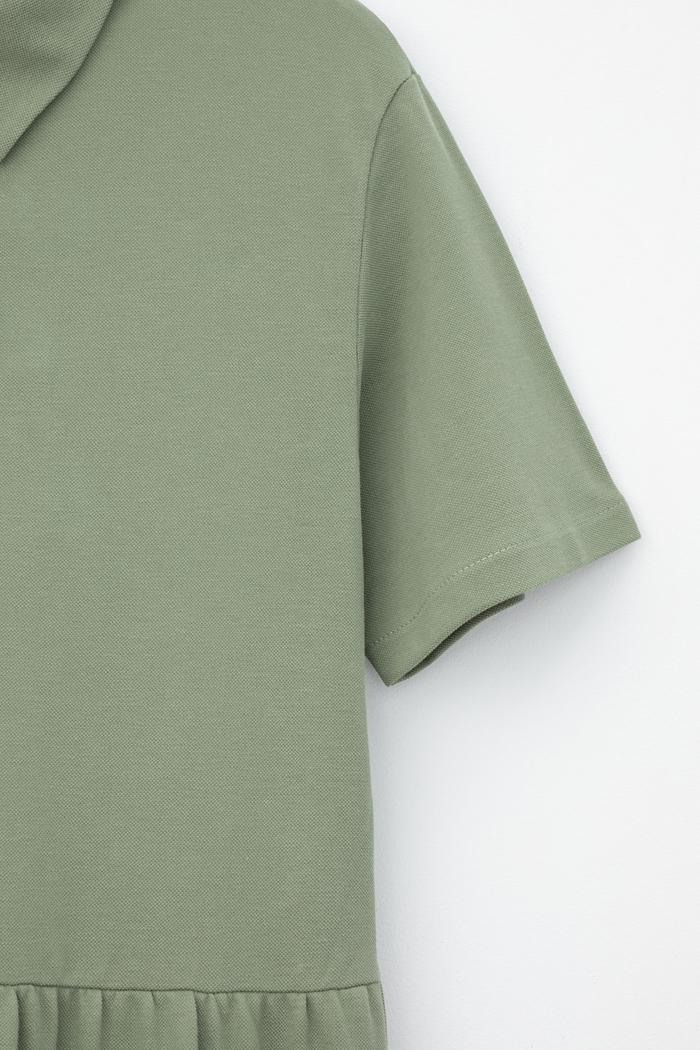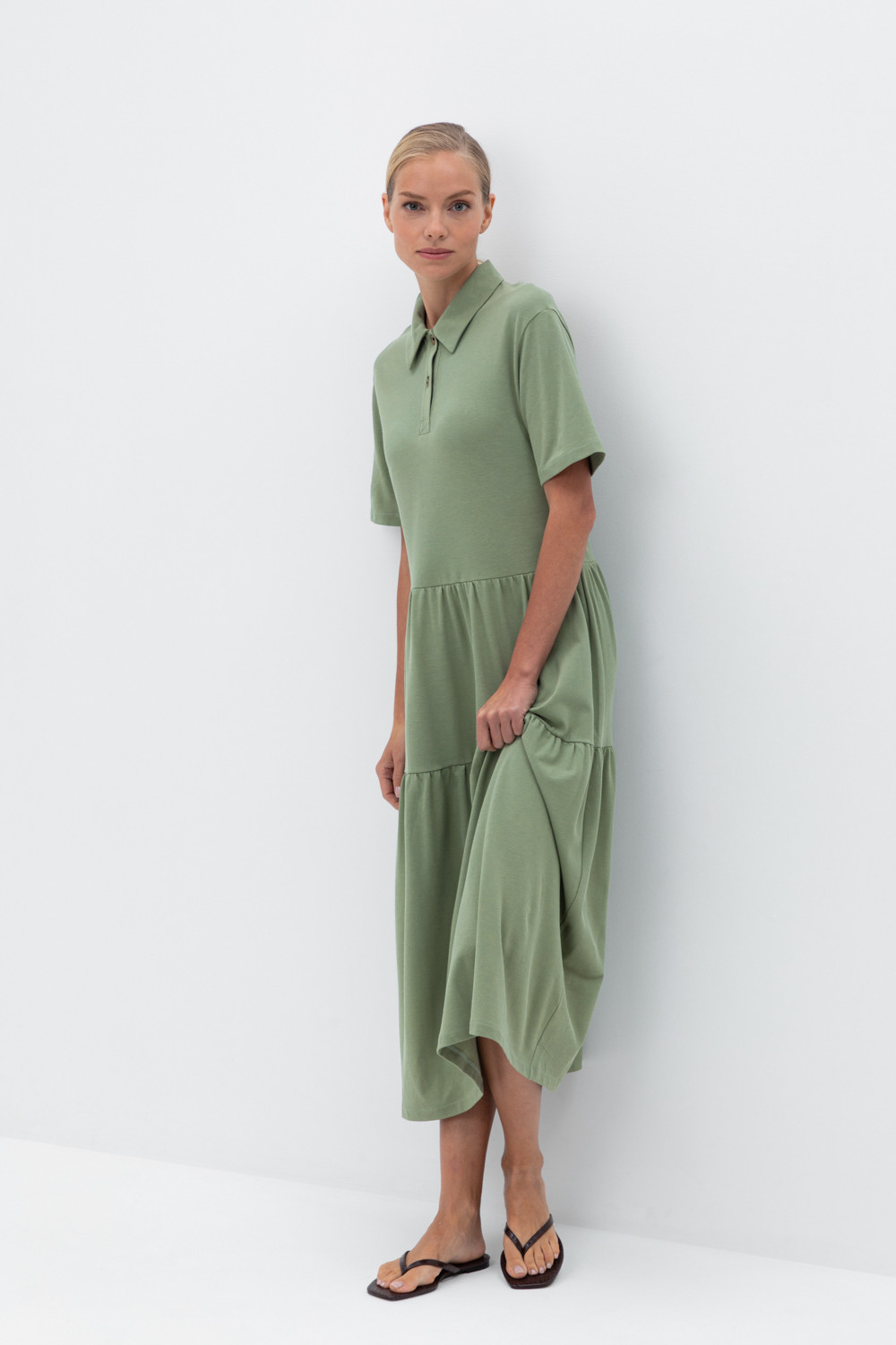 Женское платье из однотонного пике с воротником поло, короткими рукавами и широкими оборками . Все трикотажные полотна производятся в соответствии с нормами Швейцарского сертификата ЭкоТекс. Сделано в России