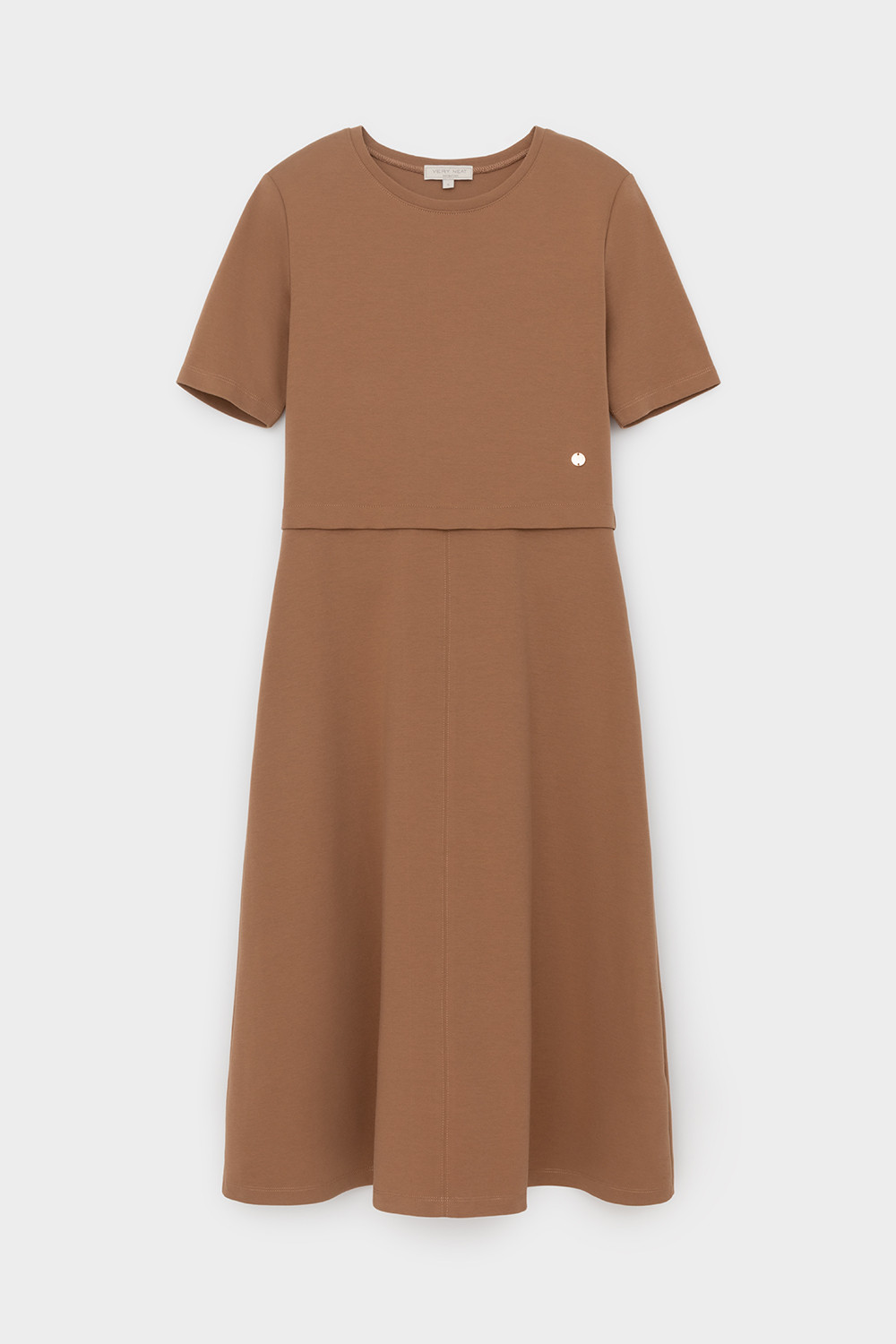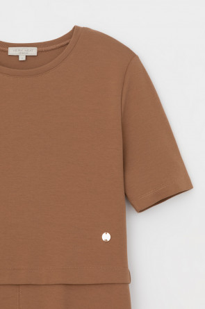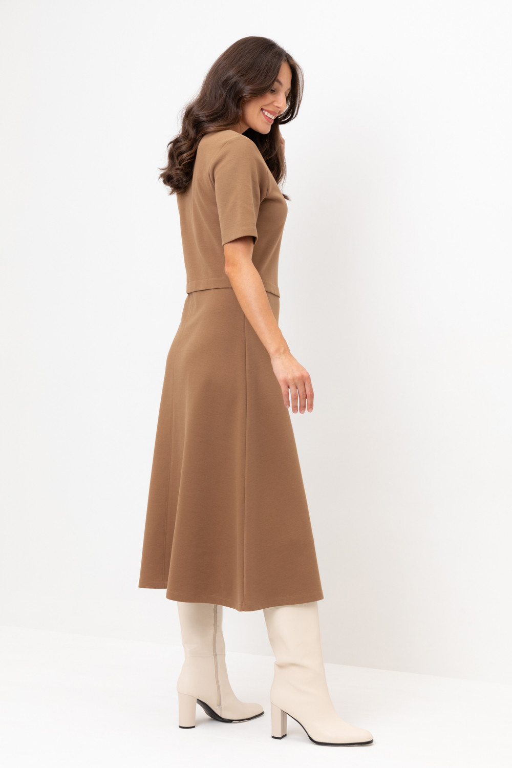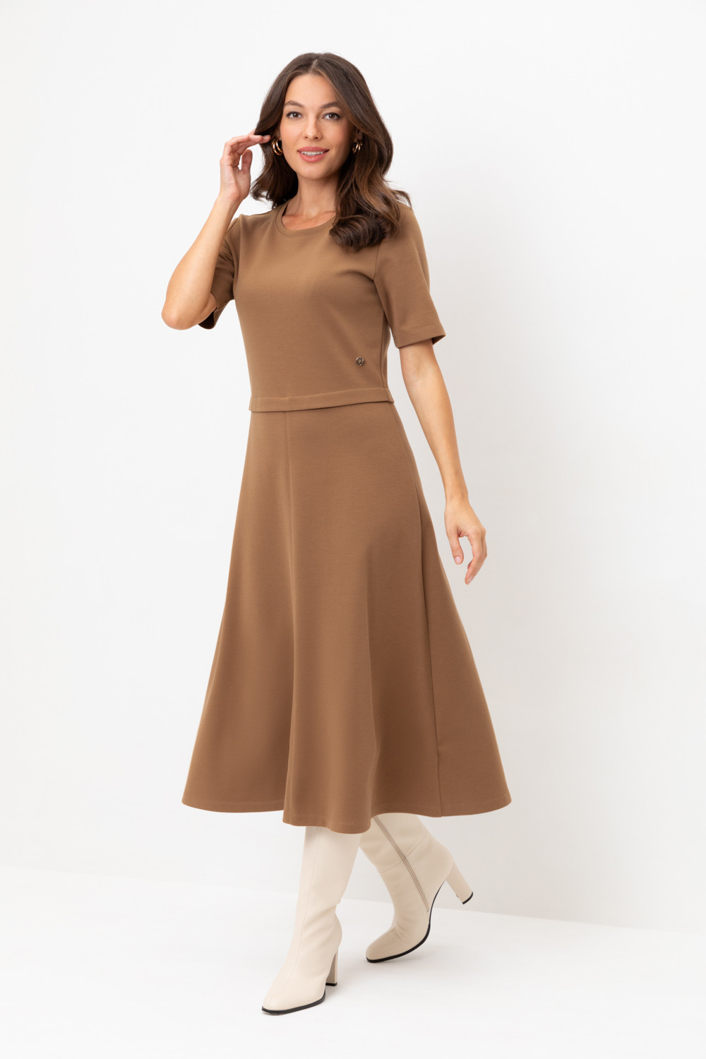 Платье с круглым вырезом и короткими рукавами из плотного трикотажа интерлок. Модель с трапециевидной юбкой.