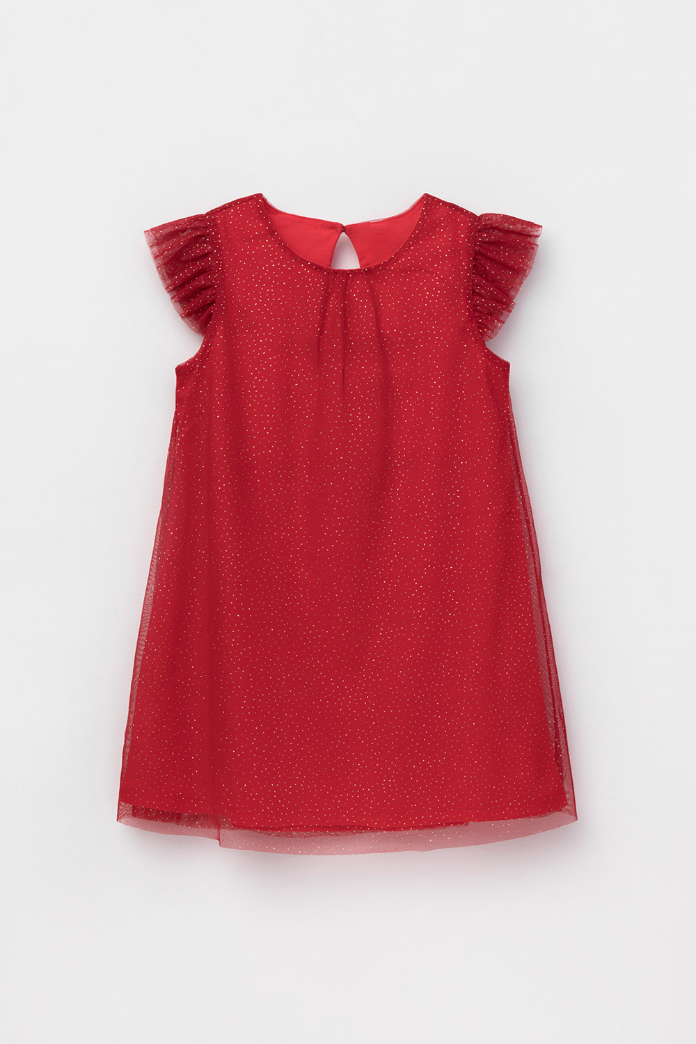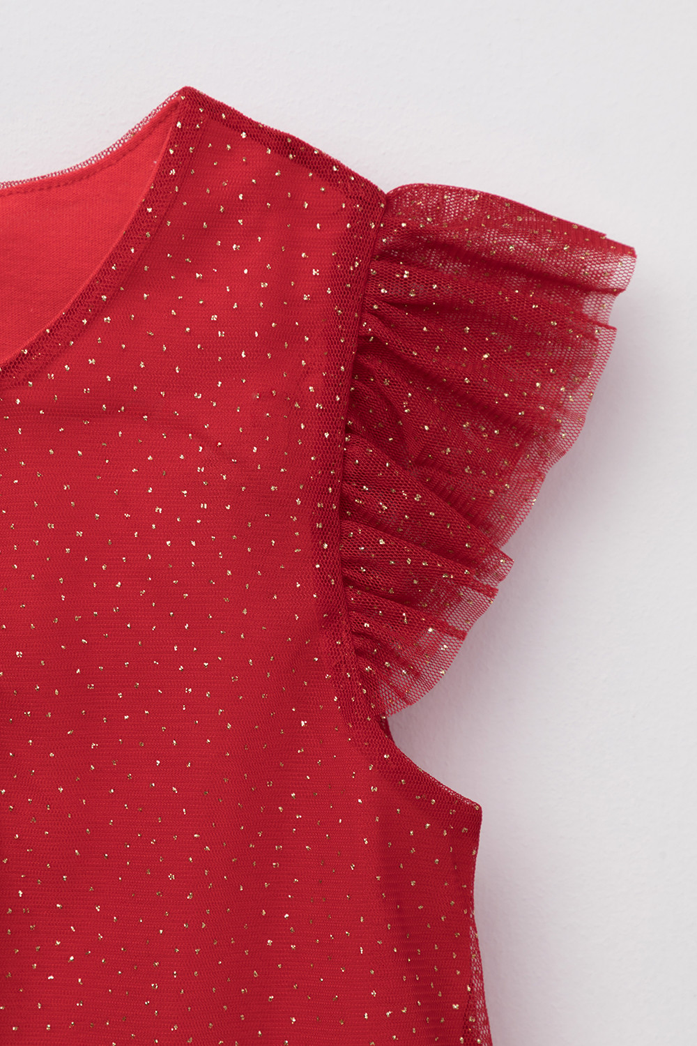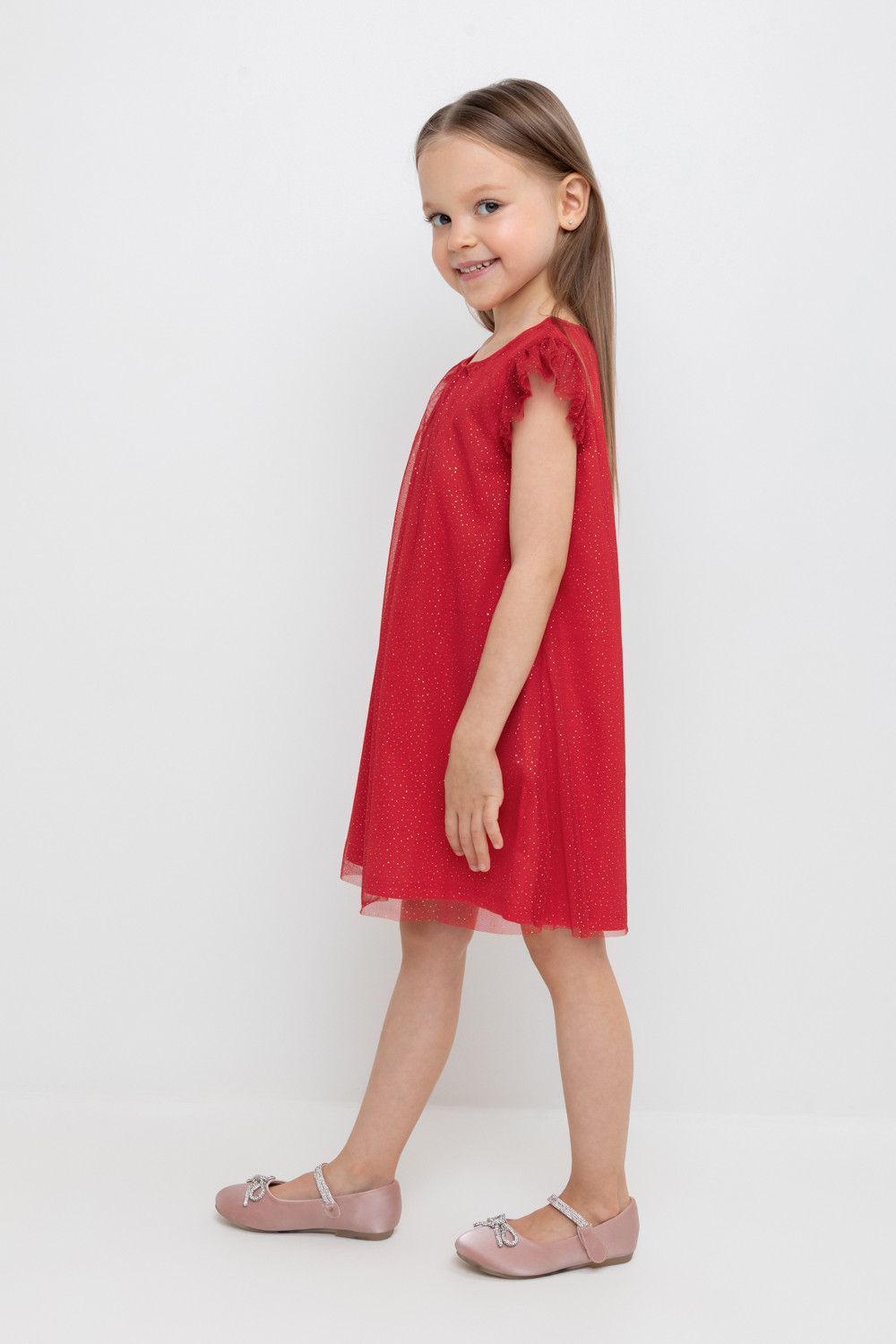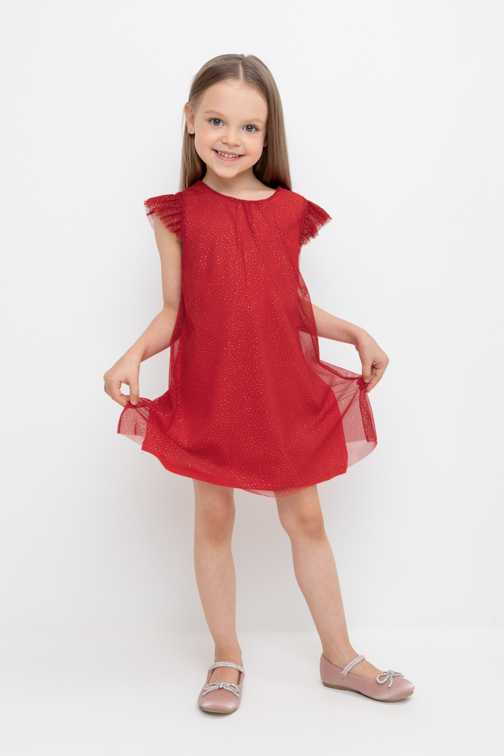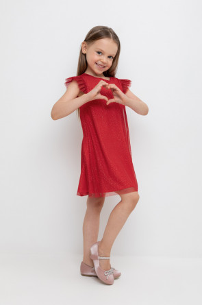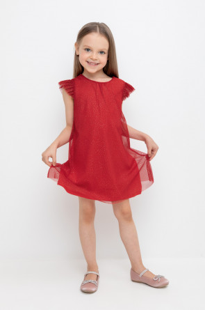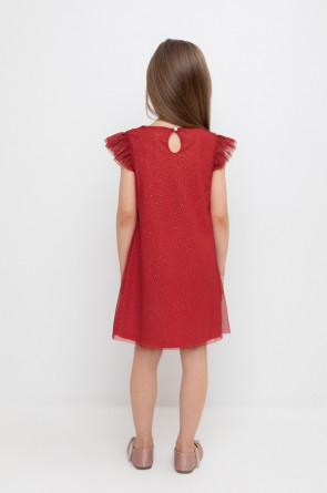 Нарядное платье для девочки из высококачественного трикотажа супрем с лёгким слоем из сетки с блёстками. Лиф украшен изящными крылышками из сетки. Для удобства одевания платье застёгивается на пуговицу на спинке. Платье сохраняет форму и стойкий цвет после многочисленных стирок и идеально подходит для праздников и фотосессий.