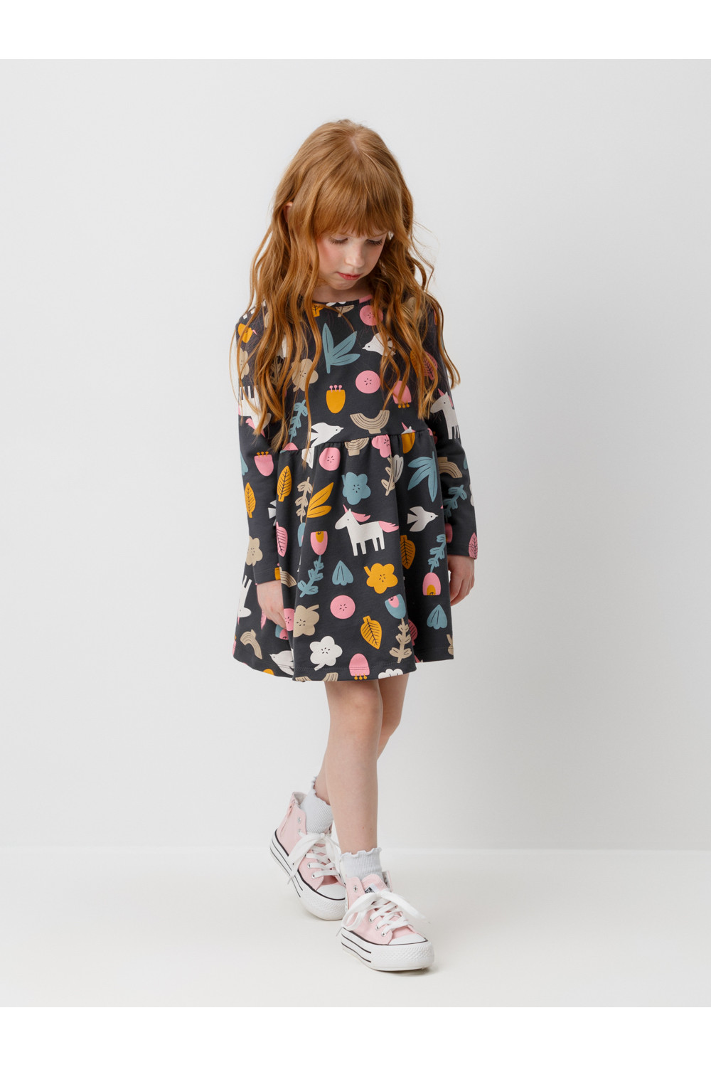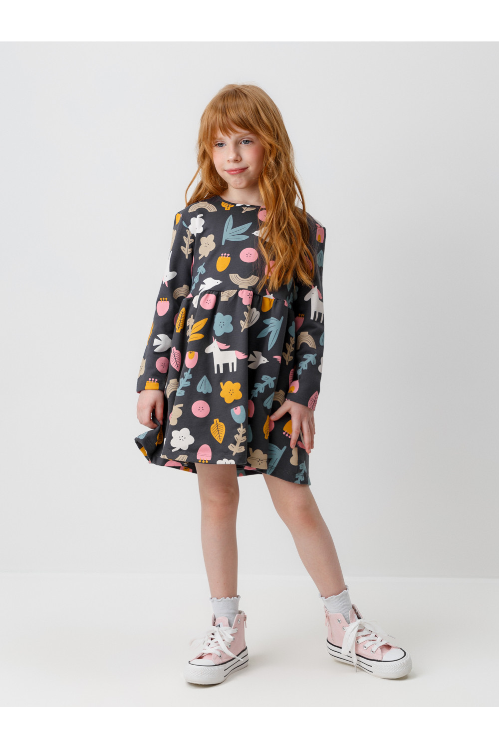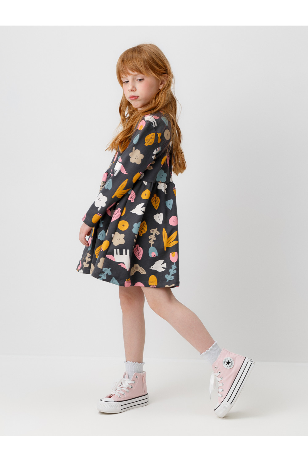 Платье для девочки в цветочный набивной рисунок из петельчатого футера, произведенного из натурального хлопка. У изделия длинные рукава и сборка по талии. Для удобства в размерах 92 и 98 имеется застежка на кнопки на спинке. Оригинальная набивка выполнена из стойких текстильных красителей. Платье сохраняет цвет и форму после многократных стирок. Платье с цветочной набивкой идеально подходит на каждый день.