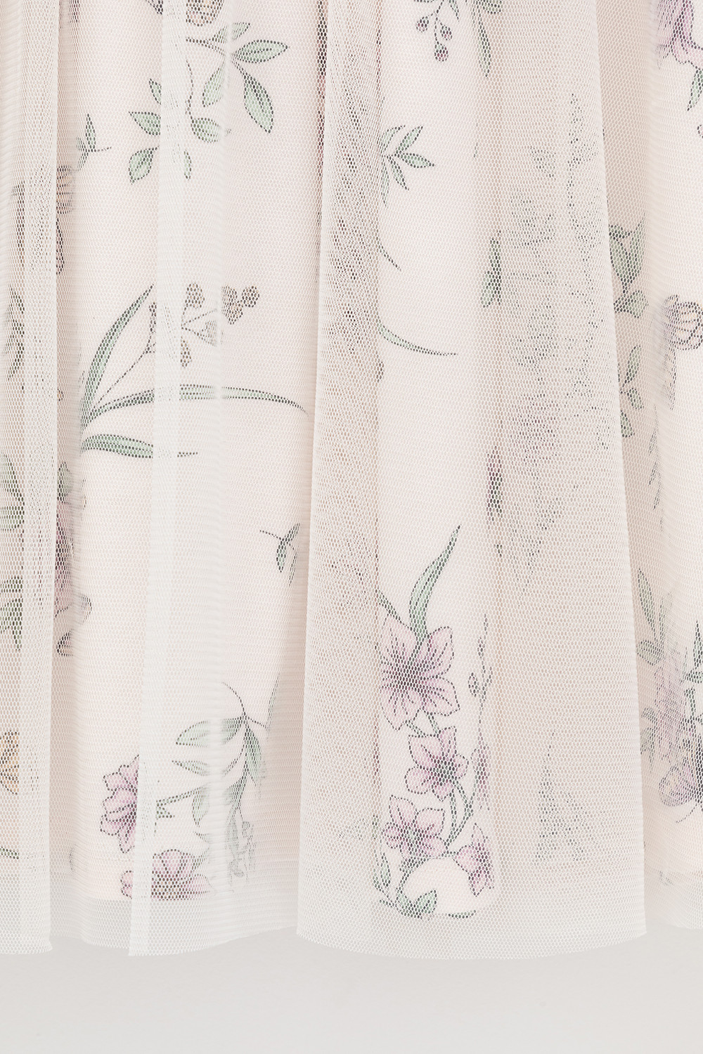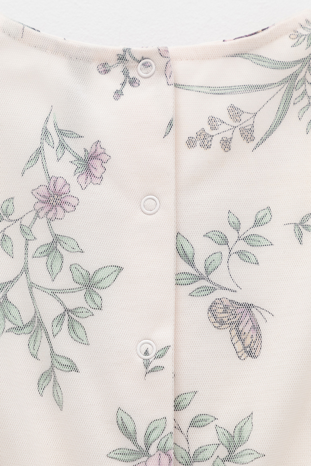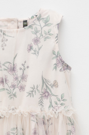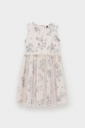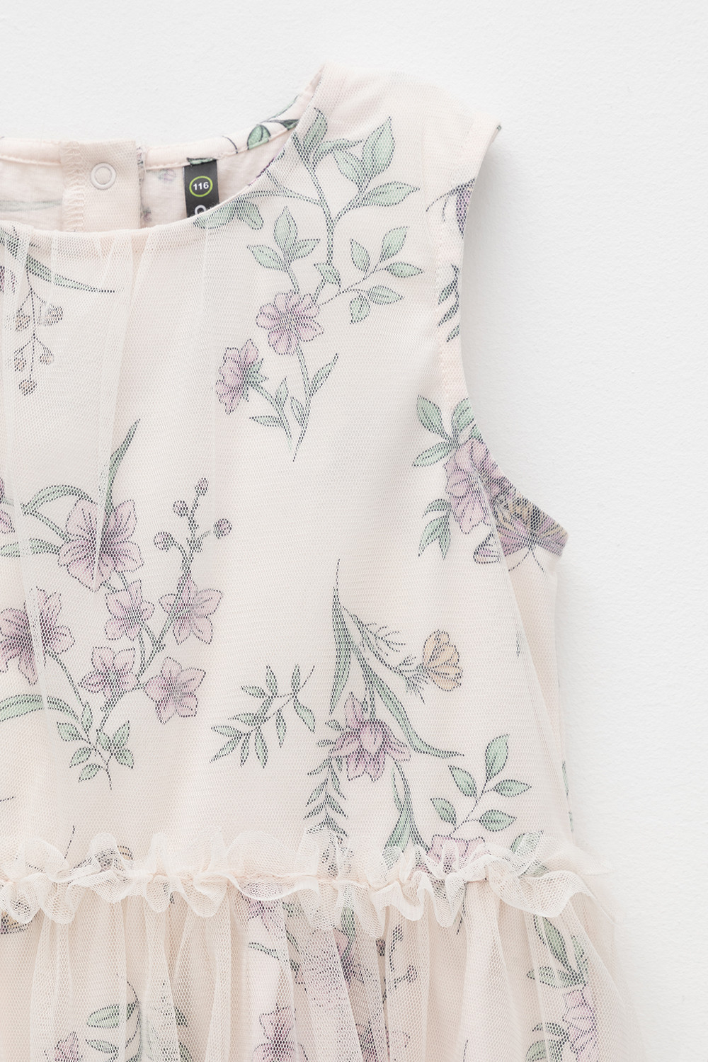 Легкое нарядное платье для девочки из высококачественного трикотажа, верхний слой - из сетки. Застёгивается на спинке с помощью кнопок. Оригинальная набивка выполнена из стойких текстильных гипоаллергенных красителей. Изделие сохраняет цвет и форму после многократных стирок.