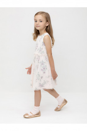 Легкое нарядное платье для девочки из высококачественного трикотажа, верхний слой - из сетки. Застёгивается на спинке с помощью кнопок. Оригинальная набивка выполнена из стойких текстильных гипоаллергенных красителей. Изделие сохраняет цвет и форму после многократных стирок.