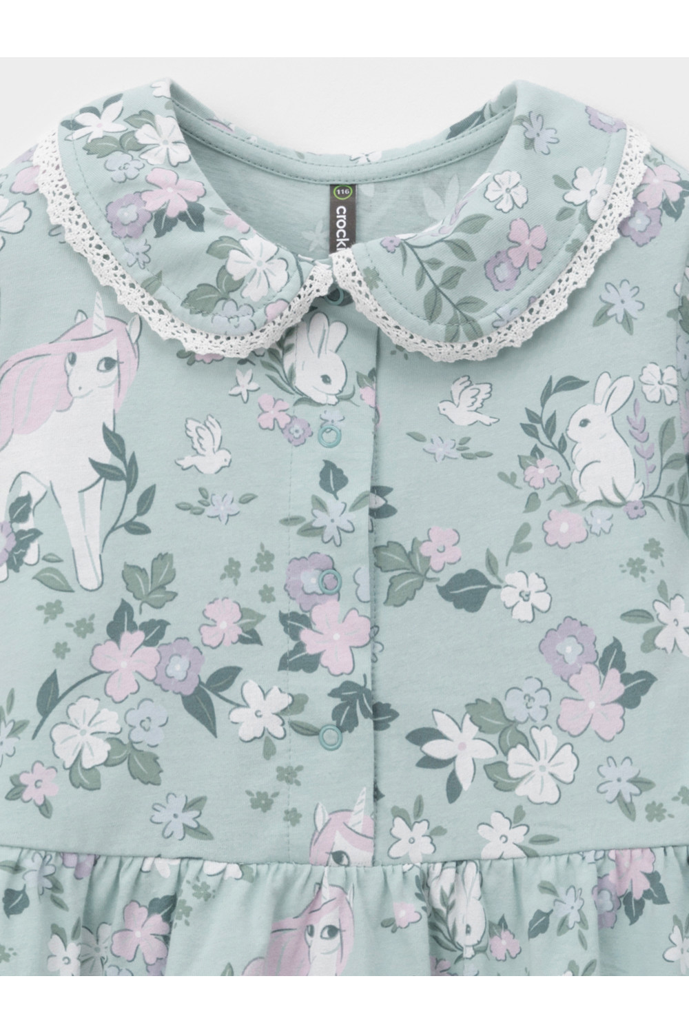 Платье с кружевом для девочки из высококачественного трикотажа, изготовленного из натурального хлопка. Застёгивается на пуговицы спереди. Платье сохраняет форму и стойкий цвет после многочисленных стирок и идеально подходит на каждый день. Все трикотажные полотна производятся в соответствии с нормами швейцарского сертификата ЭкоТекс.