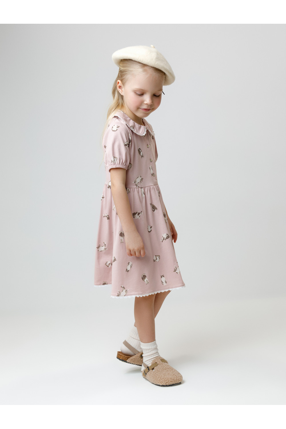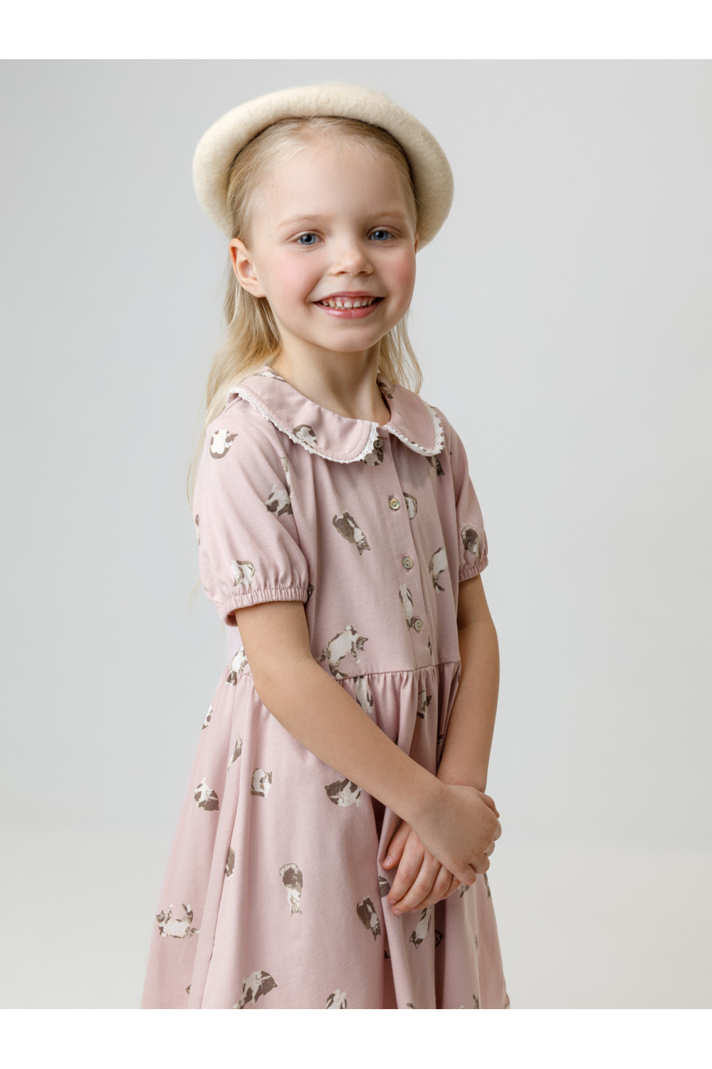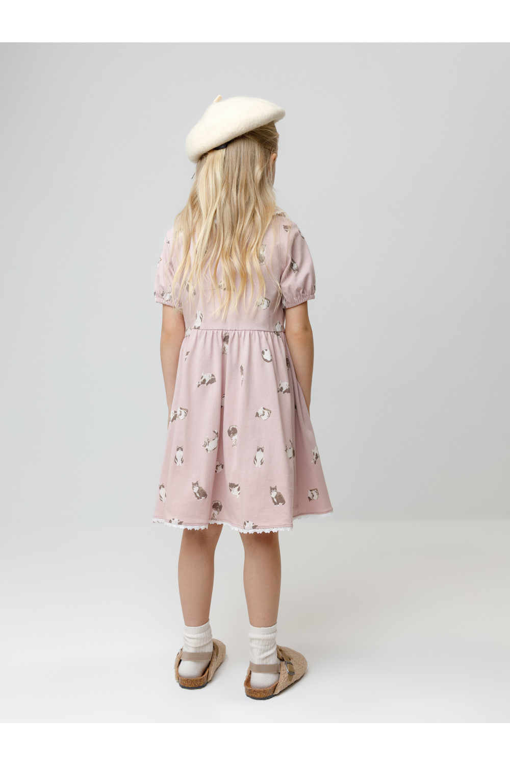 Платье для девочки с короткими рукавами из высококачественного гладкого трикотажа. Для удобства одевания платье застёгивается на пуговицы спереди. Украшено кружевом. Платье сохраняет форму и стойкий цвет после многочисленных стирок и идеально подходит на каждый день. Все трикотажные полотна производятся в соответствии с нормами швейцарского сертификата ЭкоТекс.