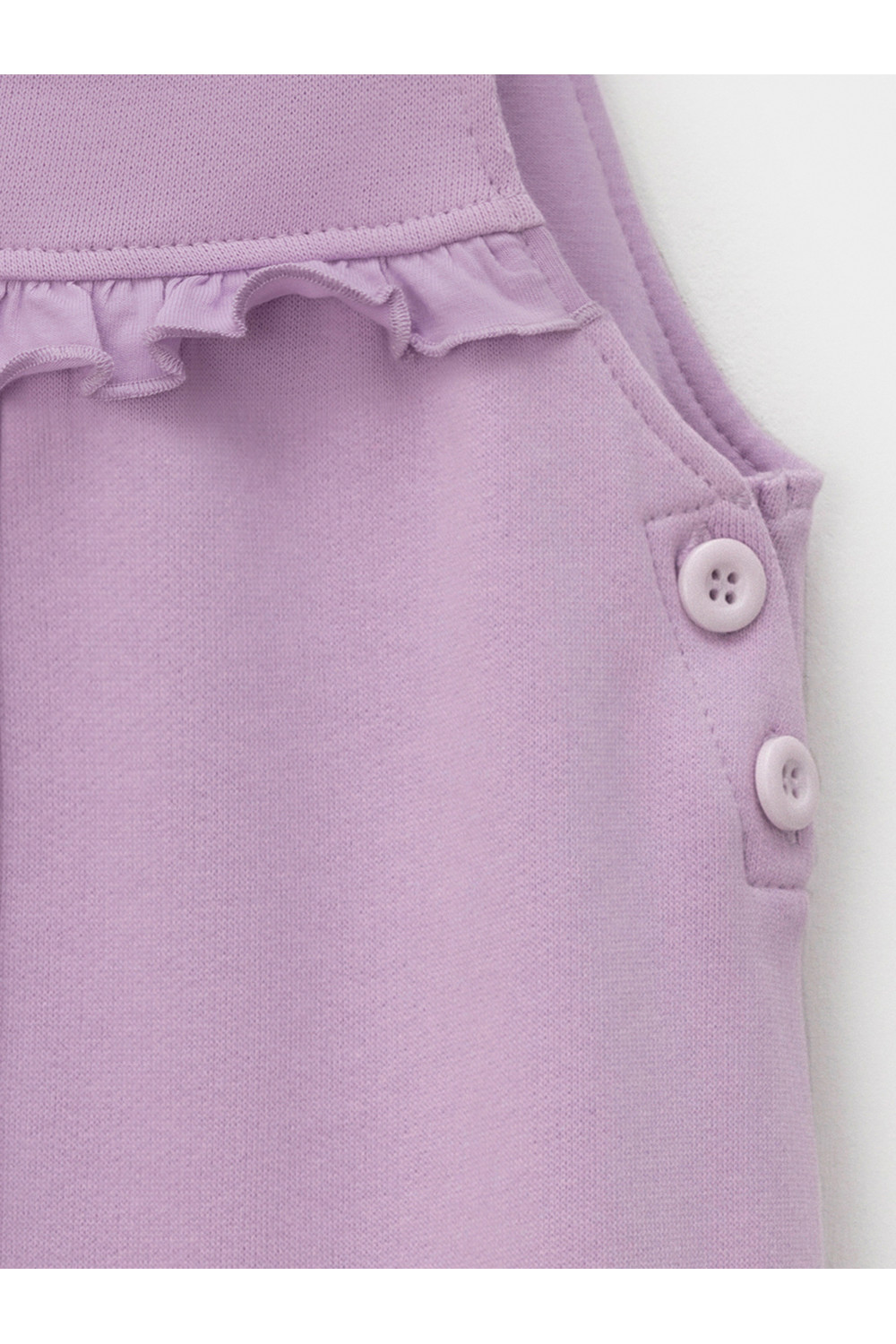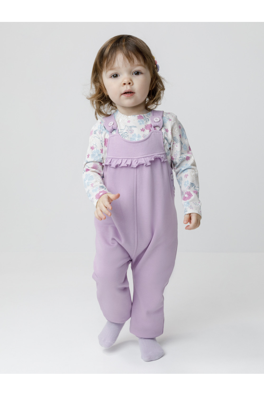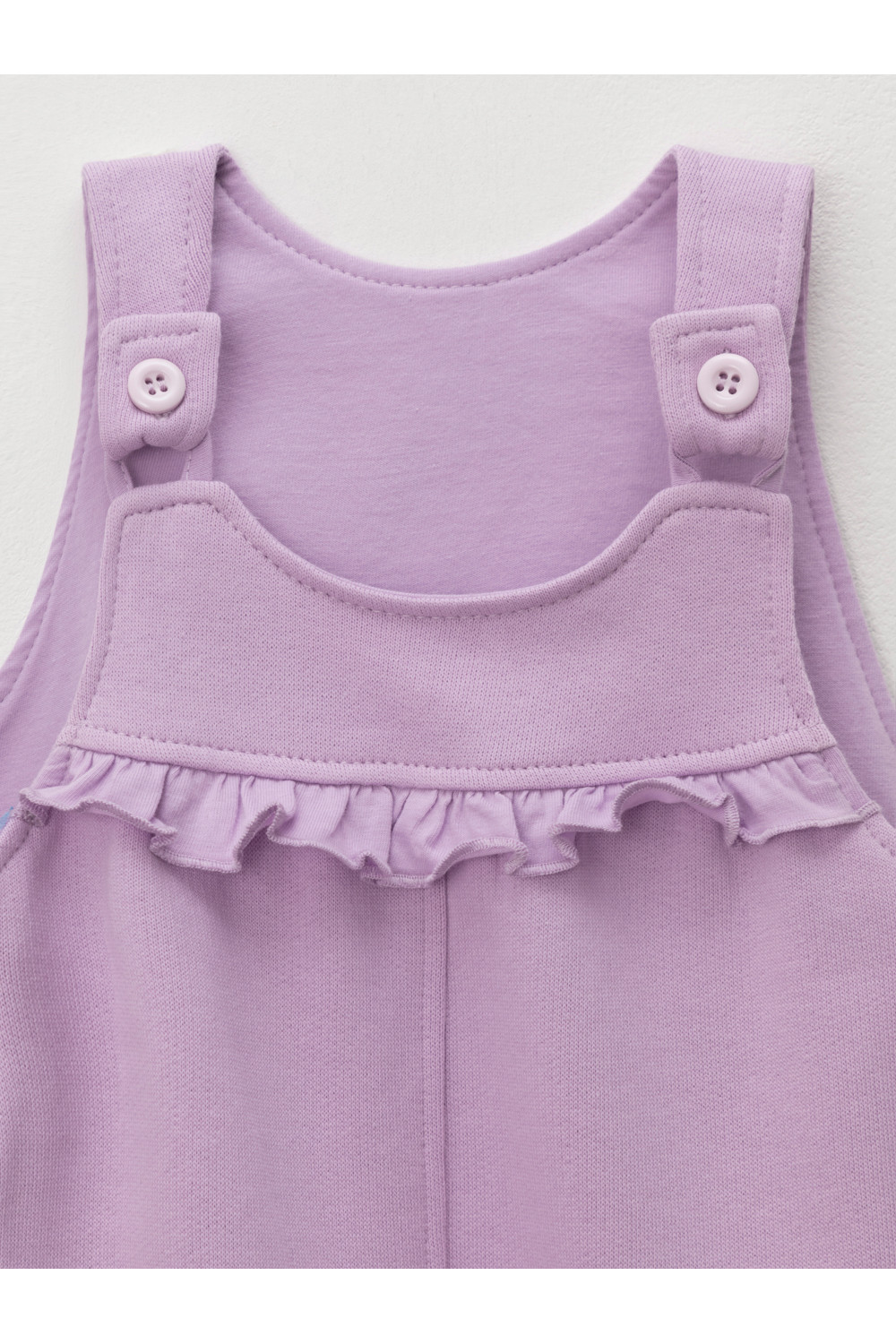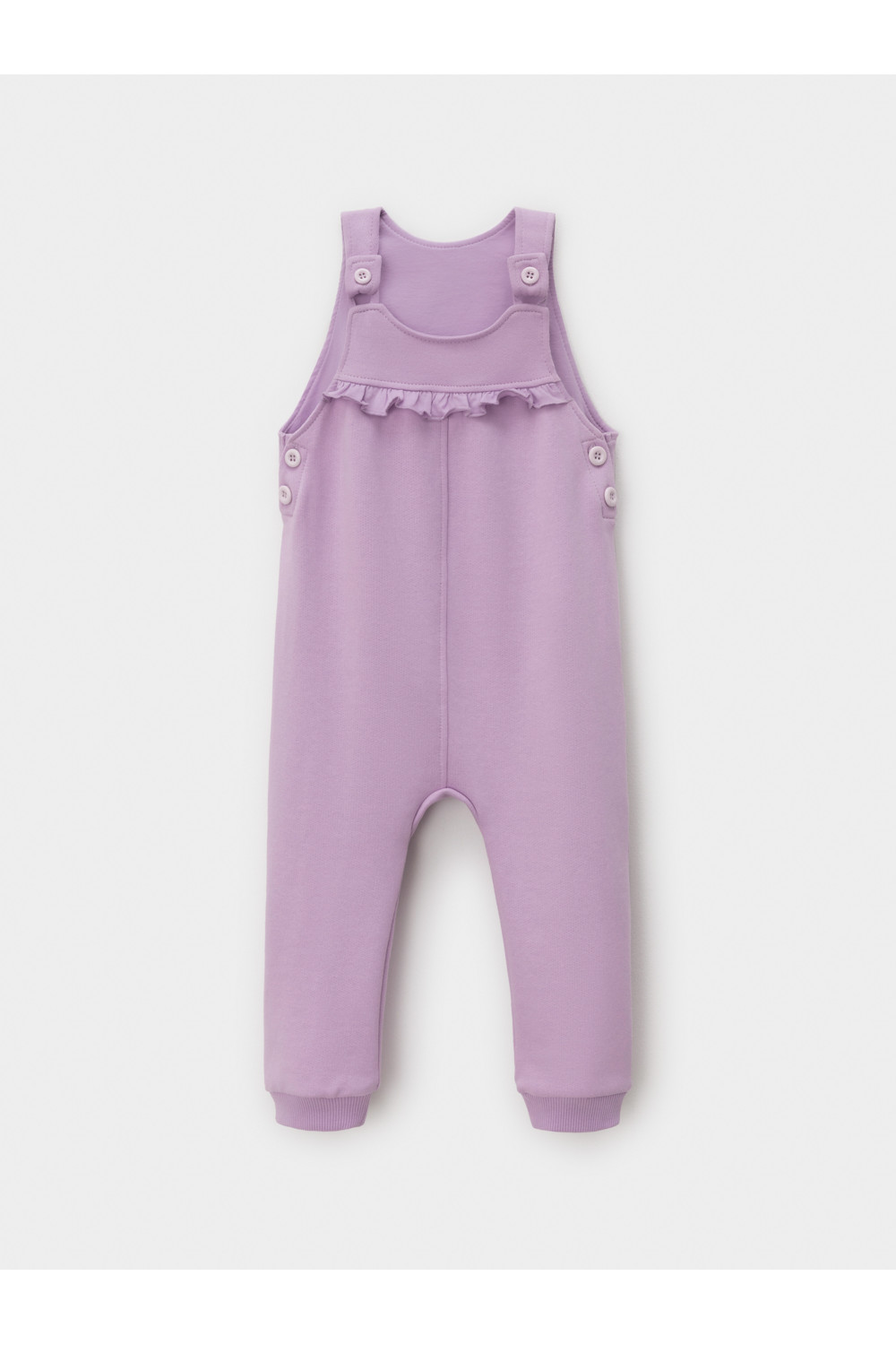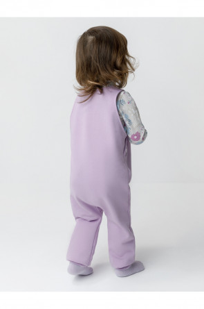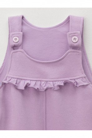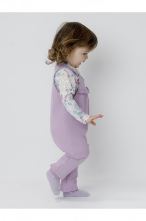 Полукомбинезон на лямках из мягкого петельчатого футера для девочки. Застёгивается на пуговицы. В размерах 74 и 80 предусмотрена пошаговая застёжка на кнопки. Низ на манжетах. Изделие сохраняет цвет и форму после многократных стирок. Все трикотажные полотна производятся в соответствии с нормами швейцарского сертификата ЭкоТекс.