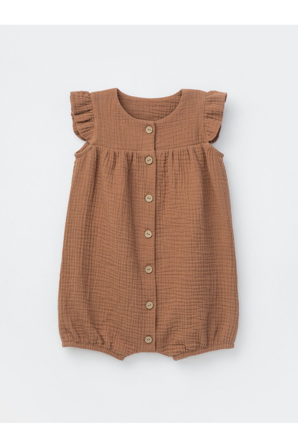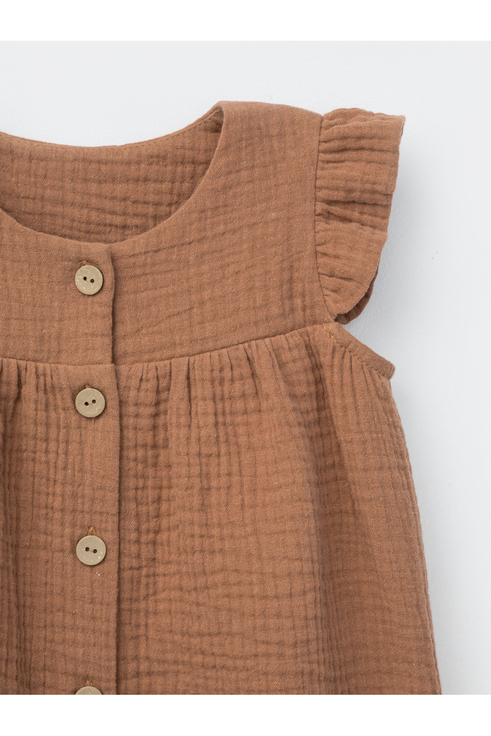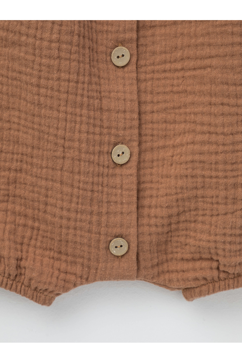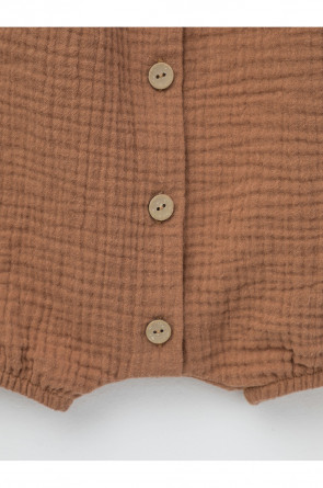 Легкий песочник для девочки из мягкого хлопокового муслина с застежкой на пуговицы. Изделие сохраняет цвет, форму и фактуру жатости после многократных стирок.
