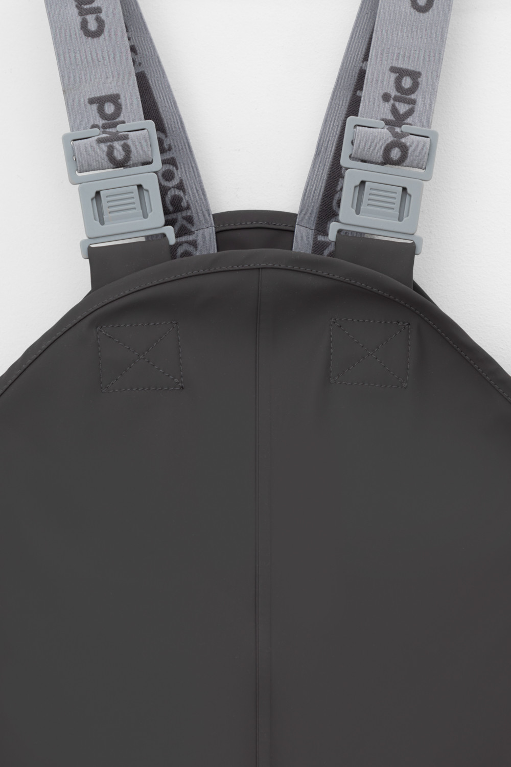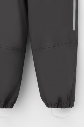 Полукомбинезон без подкладки, непромокаемый, на эластичных бретелях с регулировкой длины при помощи фастекса, сбоку под проймой кнопки для регулировки объема, низ брючин с эластичной резинкой. Для фиксации полукомбинезона используются съемные силиконовые штрипки. Светоотражающий принт в виде полосы сбоку.