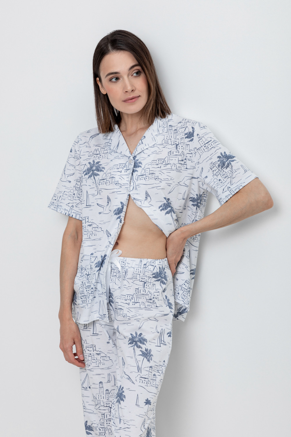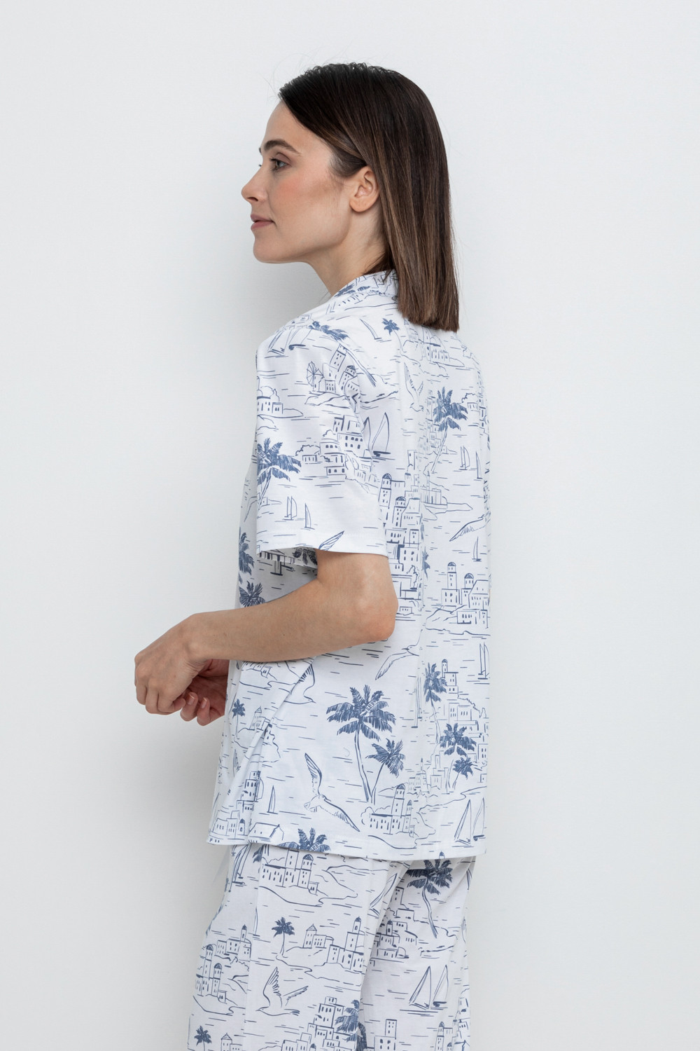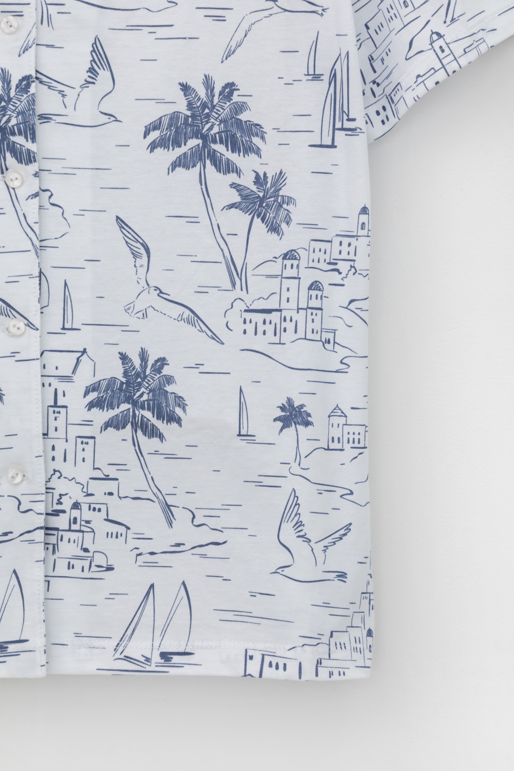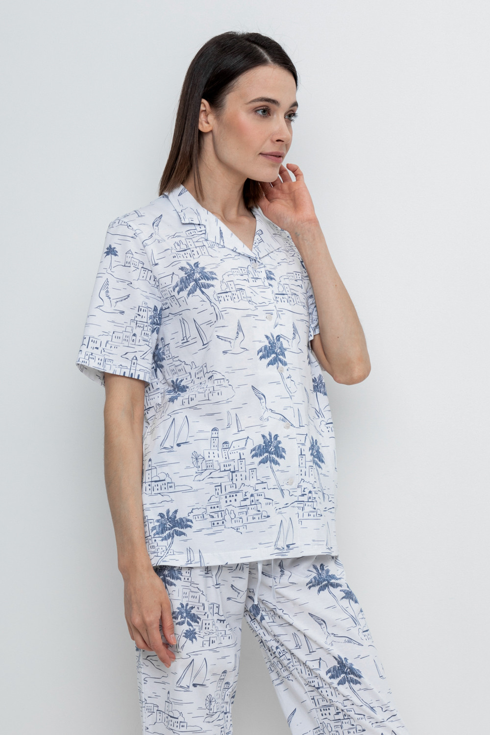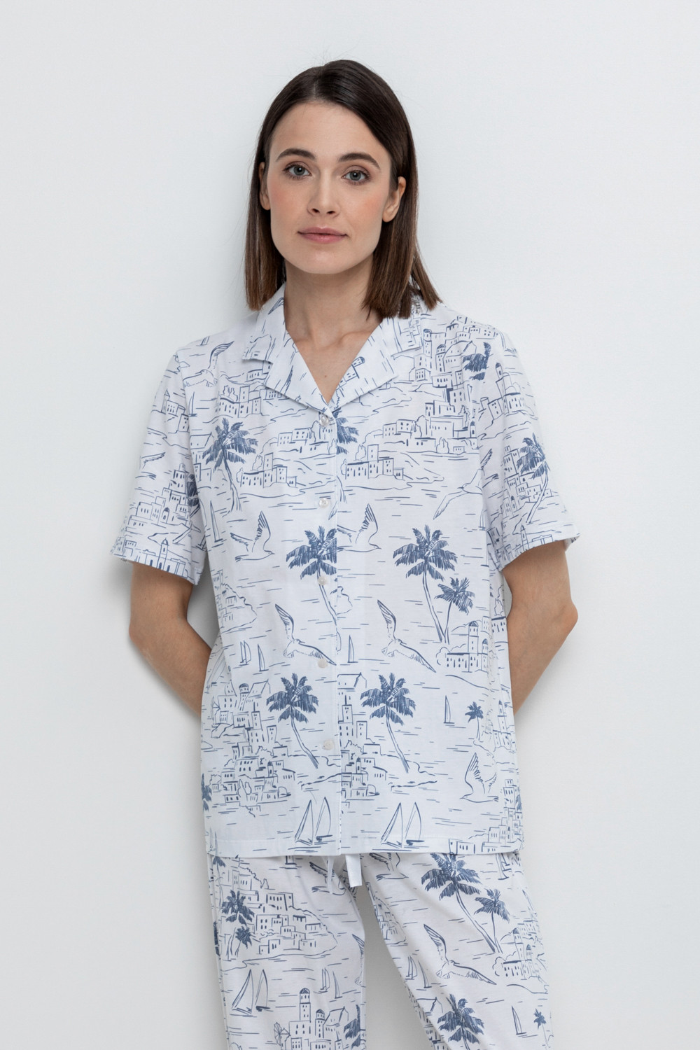 Легкая рубашка с короткими рукавами на пуговицах из набивного трикотажа. Гладкий материал приятен к телу и позволяет коже дышать.