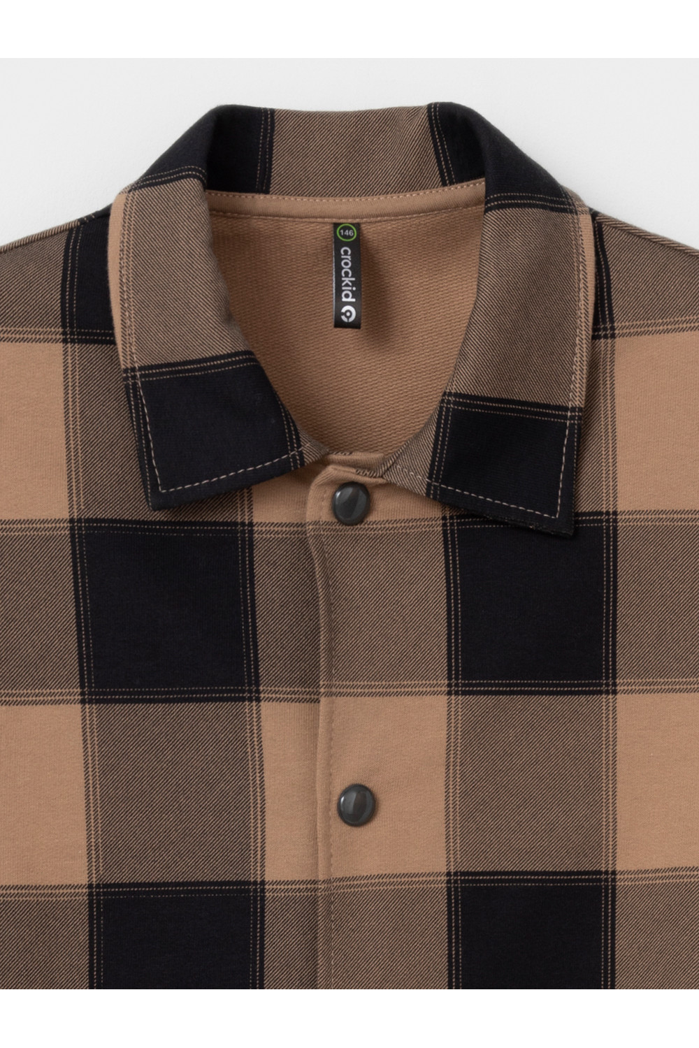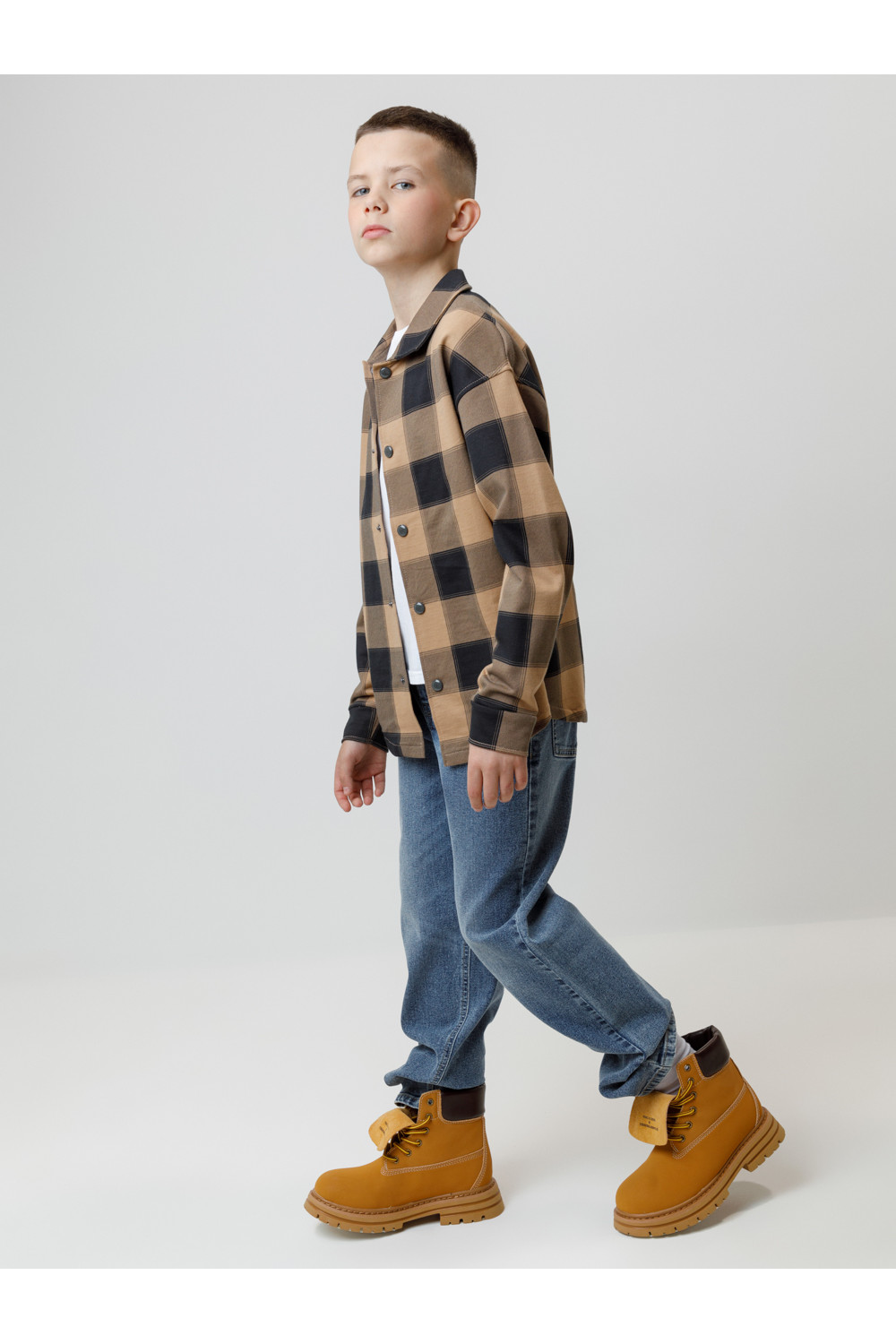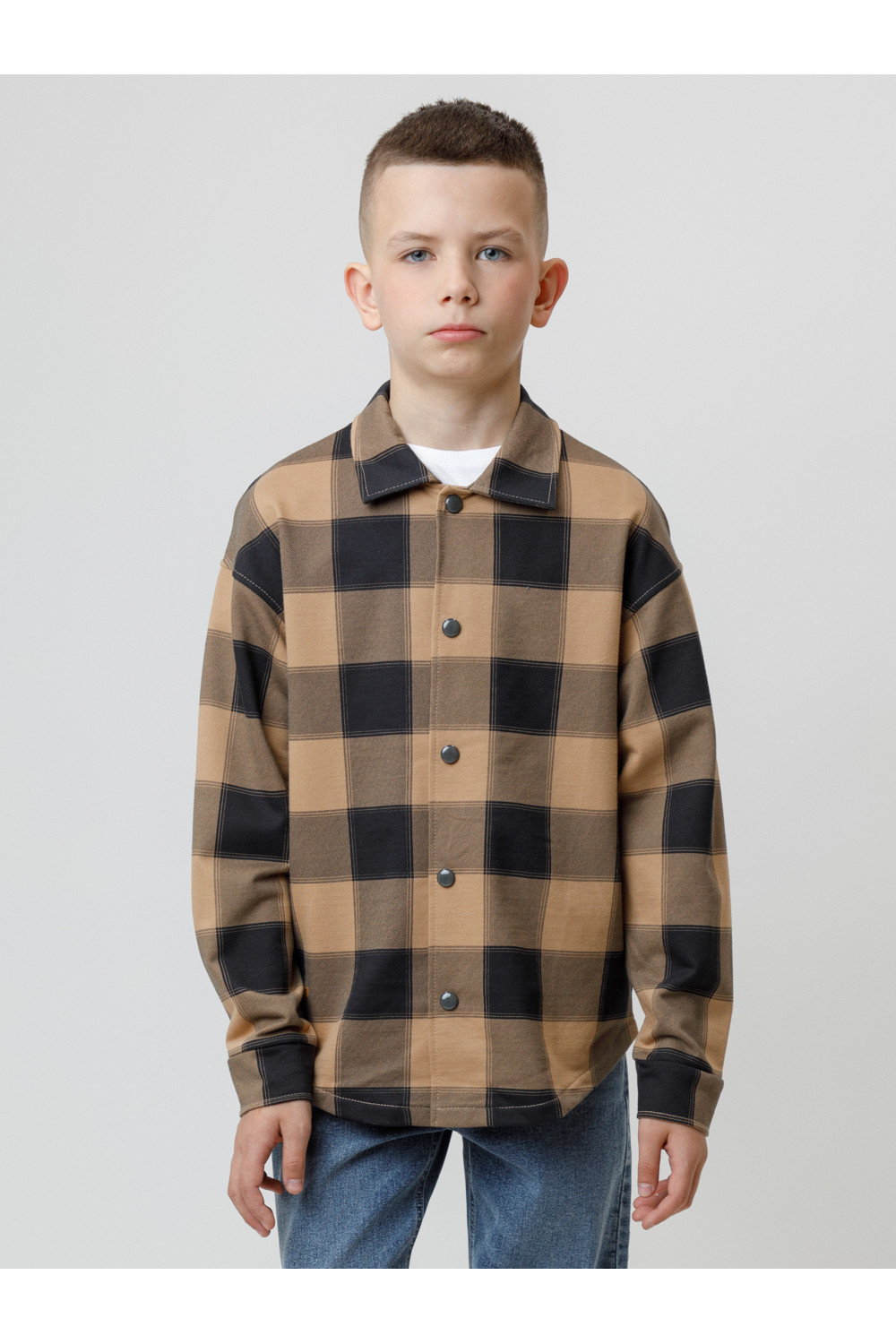 Свободная трикотажная рубашка для мальчика из мягкого петельчатого футера. Застёгивается на кнопки. Модель с закругленным низом и спущенным плечом. Рисунок в клетку выполнен из стойких текстильных гипоаллергенных красителей. Изделие сохраняет цвет и форму после многократных стирок. Все трикотажные полотна производятся в соответствии с нормами швейцарского сертификата ЭкоТекс.