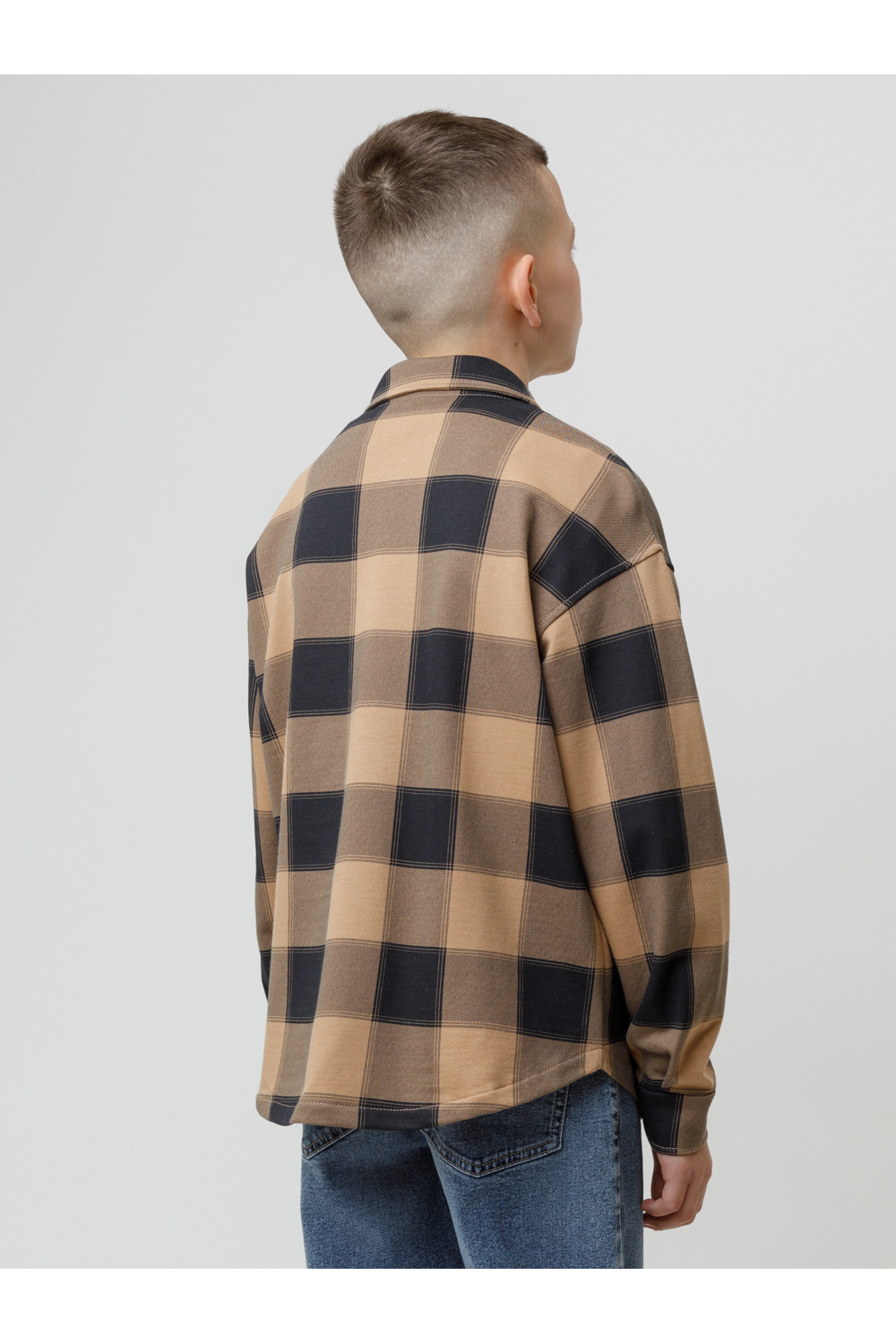 Свободная трикотажная рубашка для мальчика из мягкого петельчатого футера. Застёгивается на кнопки. Модель с закругленным низом и спущенным плечом. Рисунок в клетку выполнен из стойких текстильных гипоаллергенных красителей. Изделие сохраняет цвет и форму после многократных стирок. Все трикотажные полотна производятся в соответствии с нормами швейцарского сертификата ЭкоТекс.
