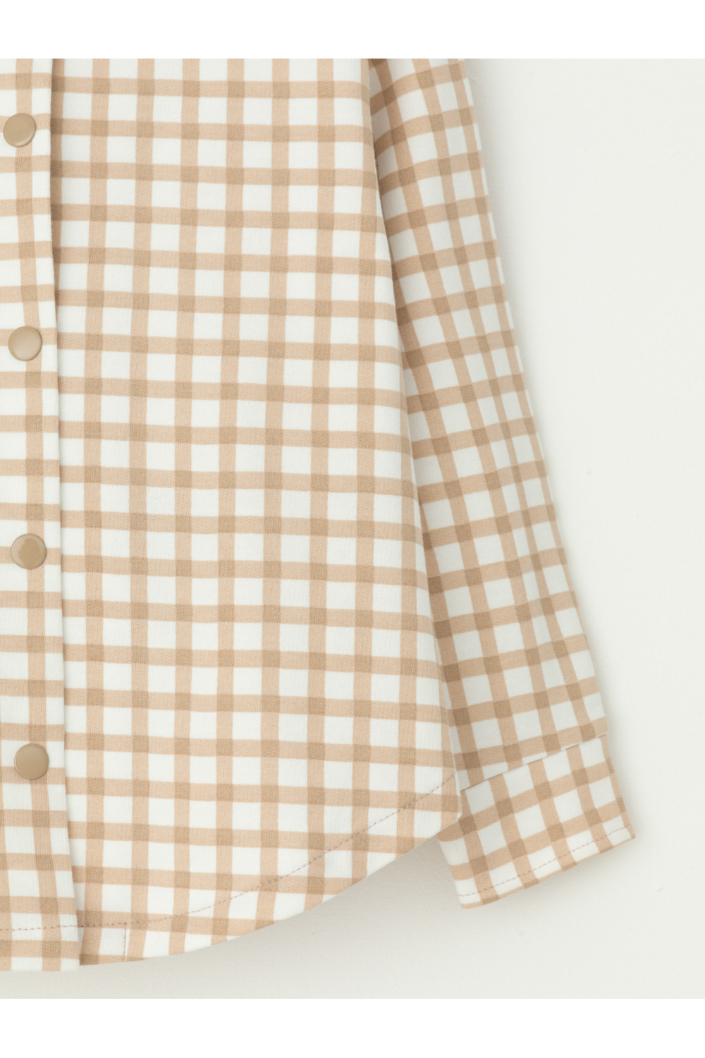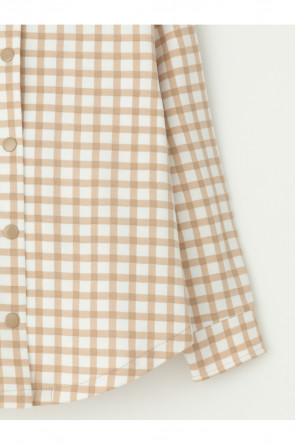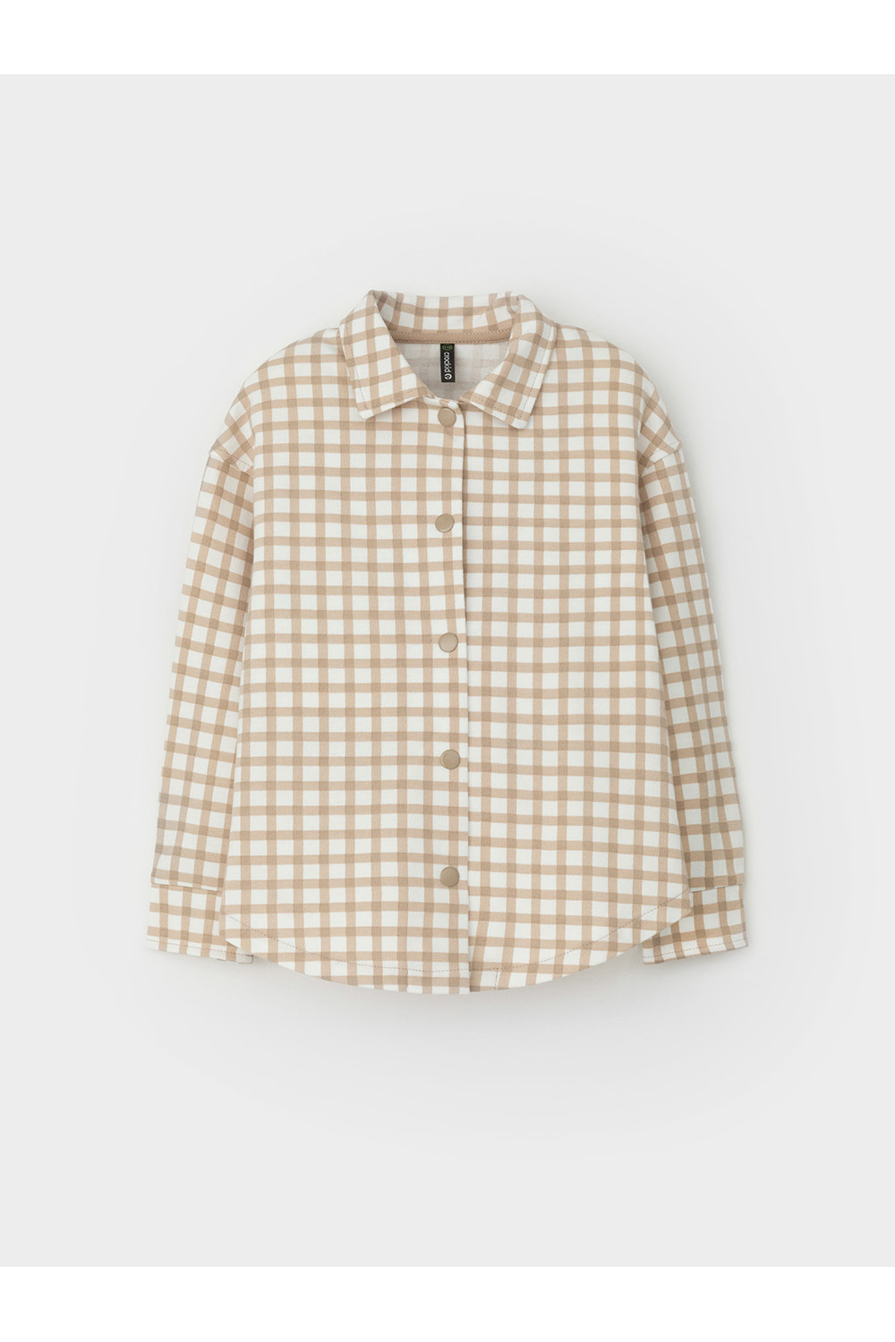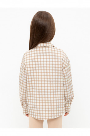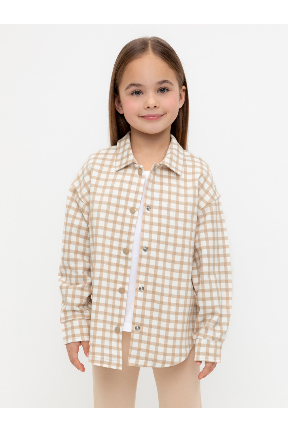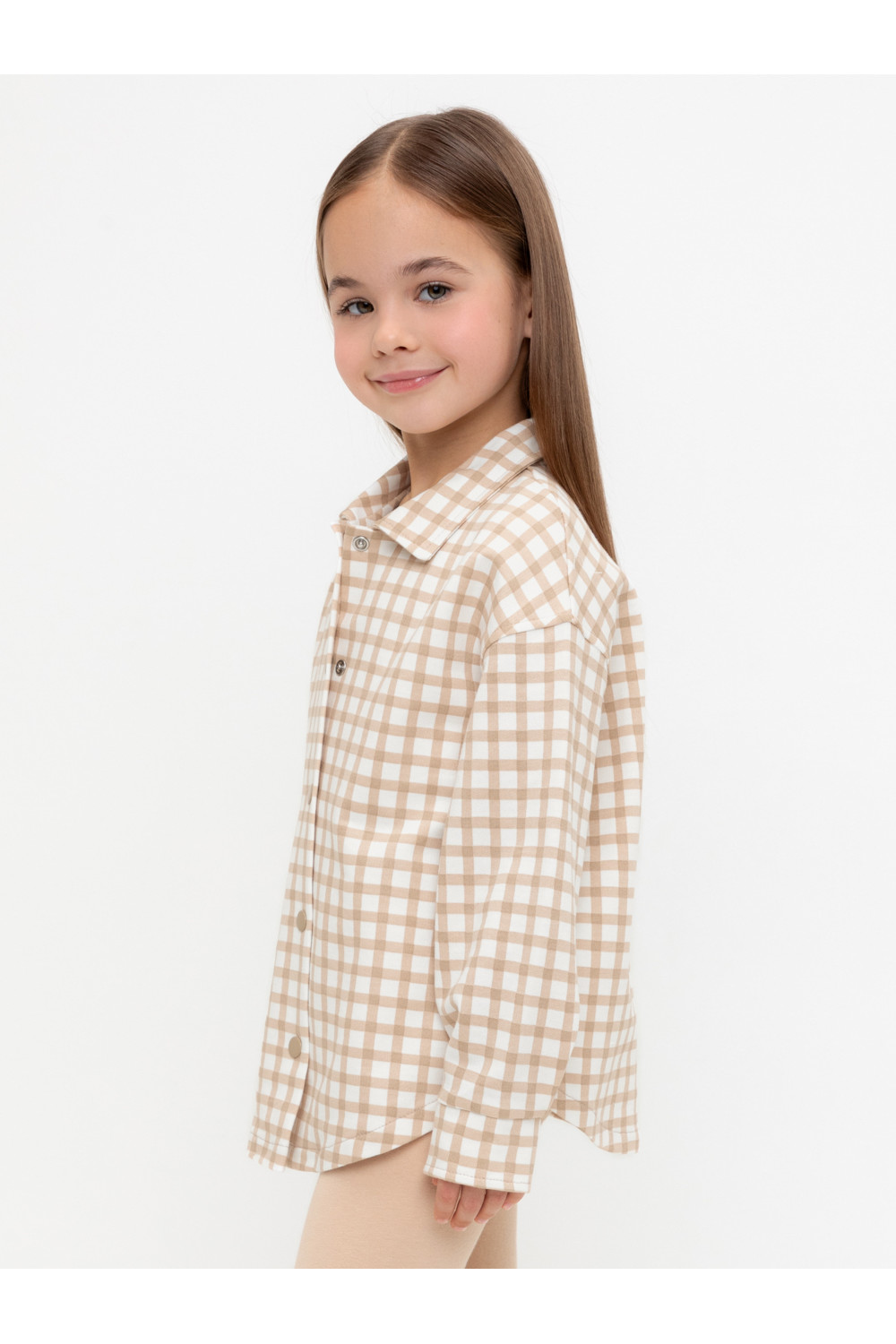 Свободная трикотажная рубашка для девочки из мягкого петельчатого футера. Застёгивается на кнопки. Модель с закругленным низом и спущенным плечом. Рисунок в клетку выполнен из стойких текстильных гипоаллергенных красителей.