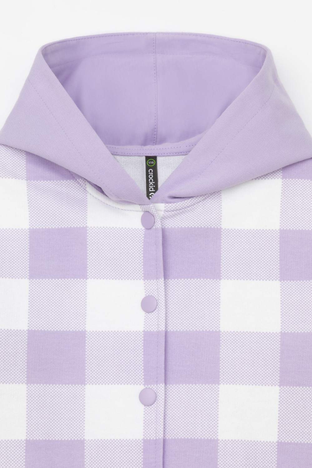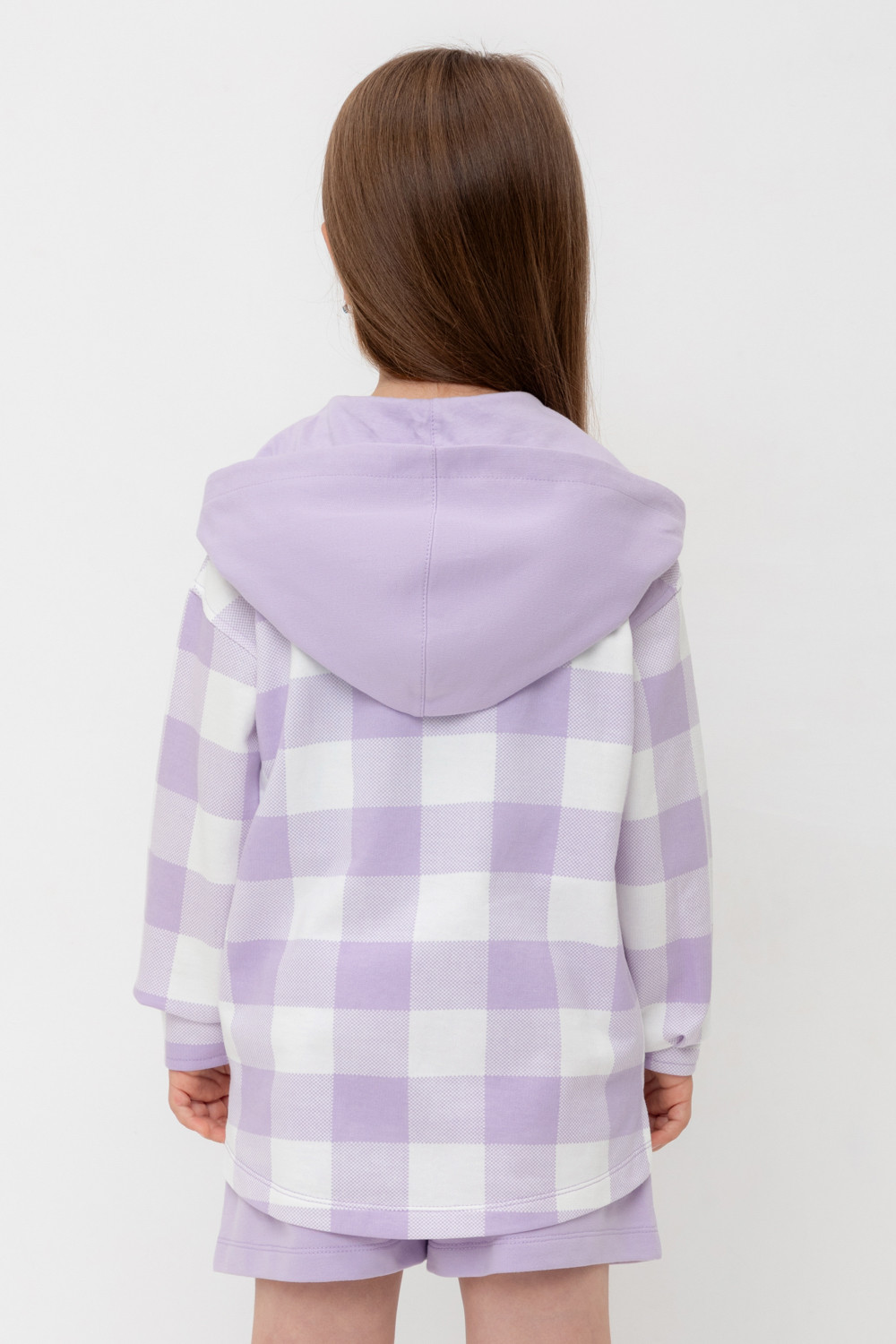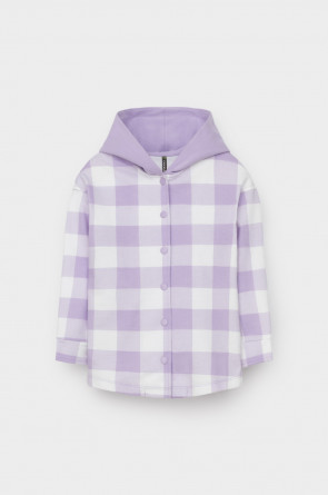 Свободная трикотажная рубашка для девочки с капюшоном. Выполнена из мягкого петельчатого футера. Застёгивается на кнопки. Модель с закругленным низом и спущенным плечом. По бокам разрезы.