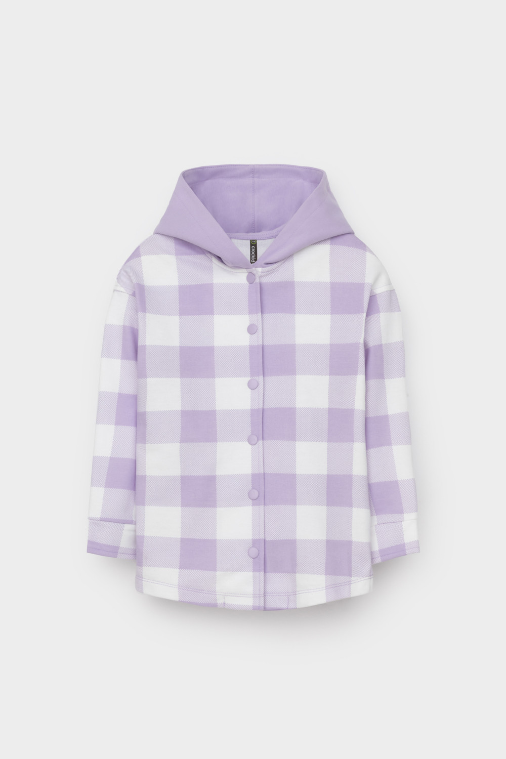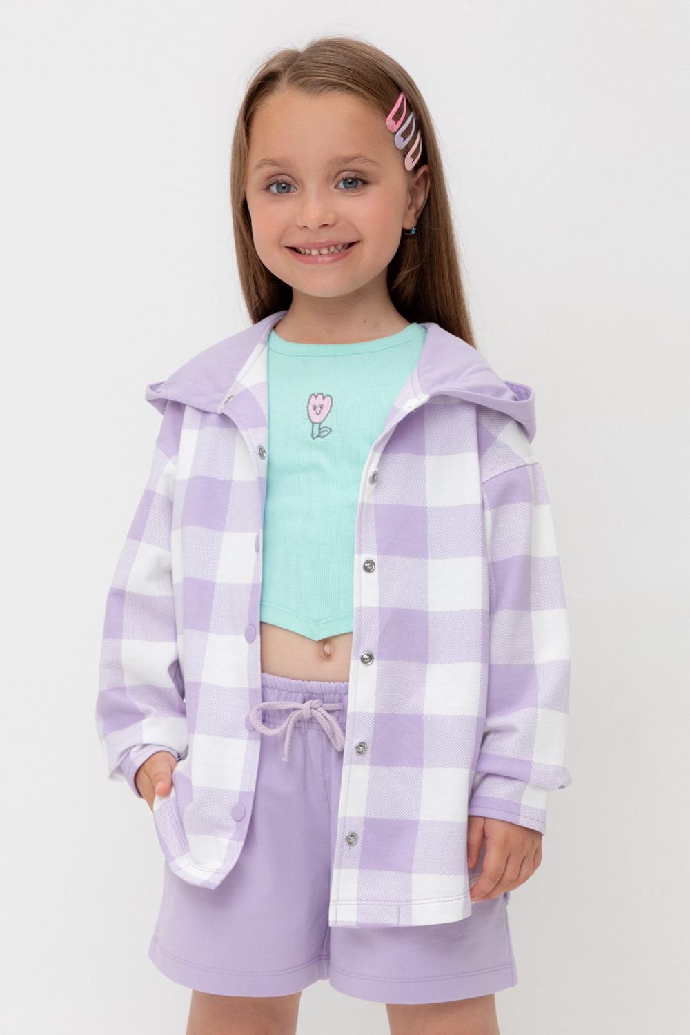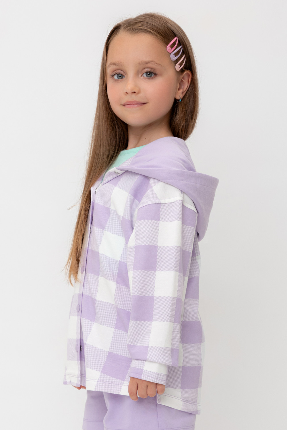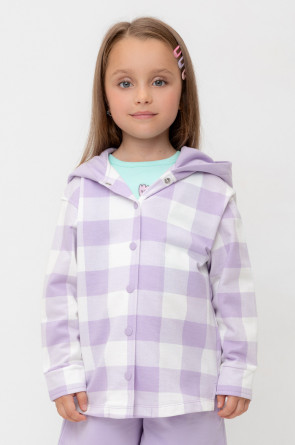 Свободная трикотажная рубашка для девочки с капюшоном. Выполнена из мягкого петельчатого футера. Застёгивается на кнопки. Модель с закругленным низом и спущенным плечом. По бокам разрезы.