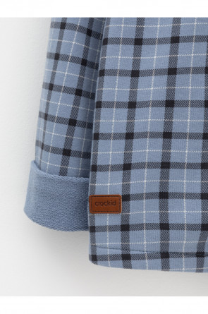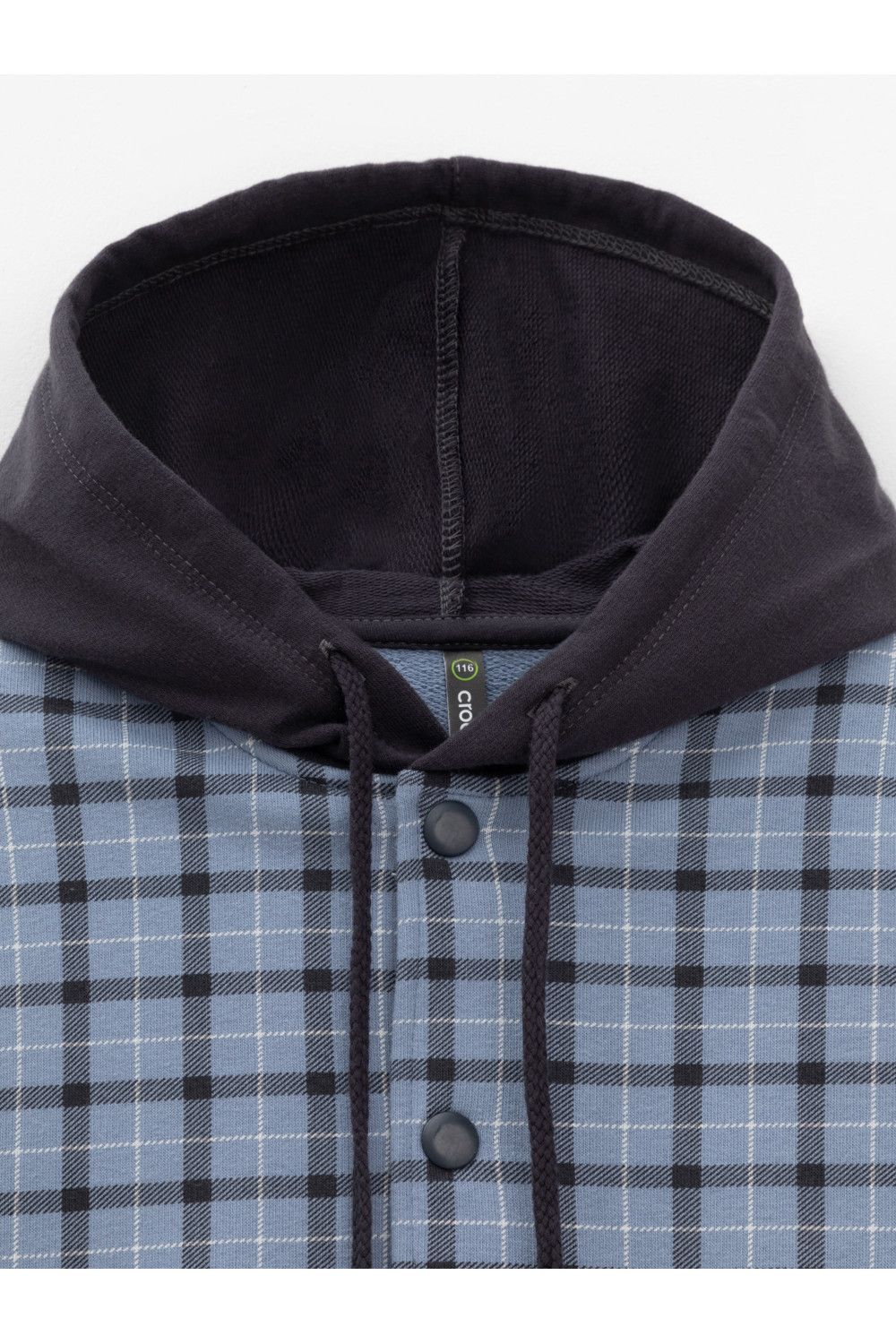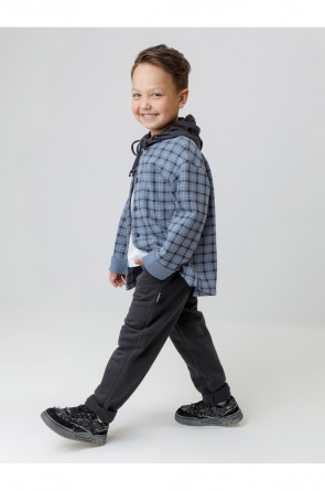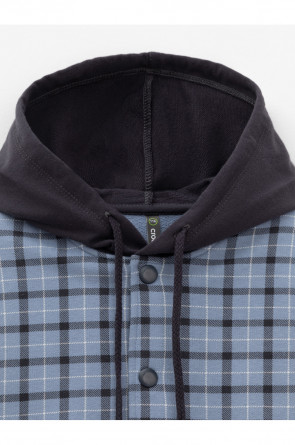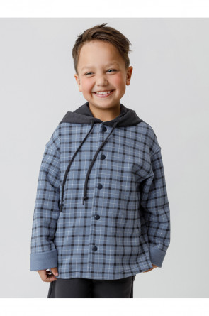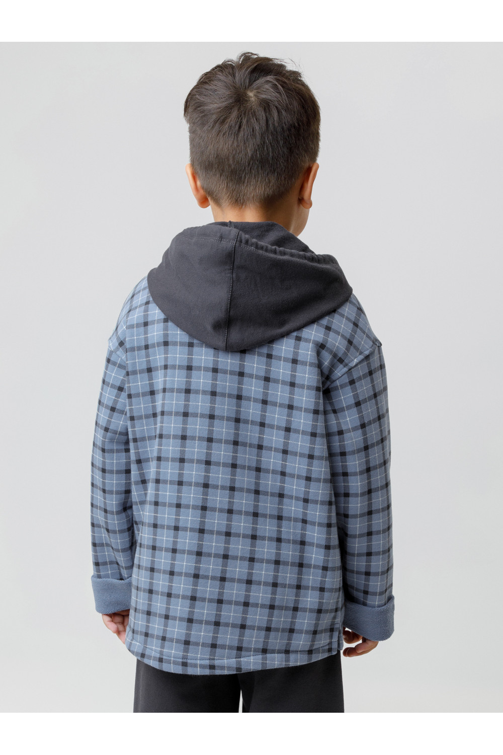 Свободная трикотажная рубашка для мальчика из мягкого петельчатого футера. В составе 80% натурального хлопка и 20% полиэстера, при этом полиэстер ввязан внутрь по особой технологии и не соприкасается с кожей. Застёгивается на кнопки. Модель с капюшоном и спущенным плечом. Рисунок в клетку выполнен из стойких текстильных гипоаллергенных красителей. Изделие сохраняет цвет и форму после многократных стирок. Все трикотажные полотна производятся в соответствии с нормами швейцарского сертификата ЭкоТекс.