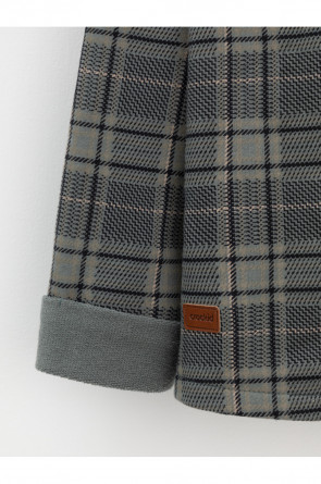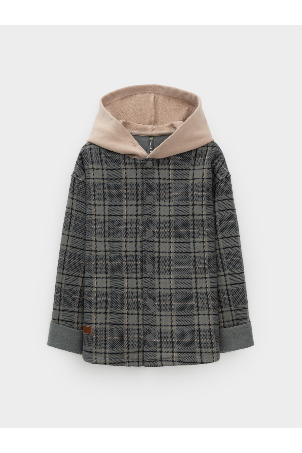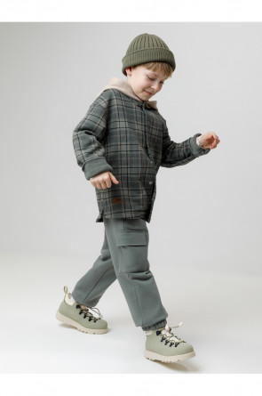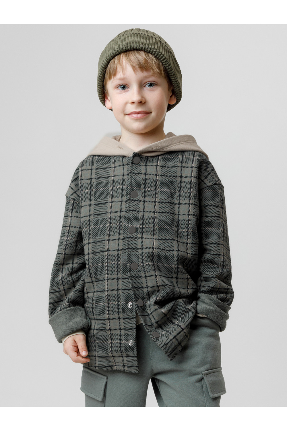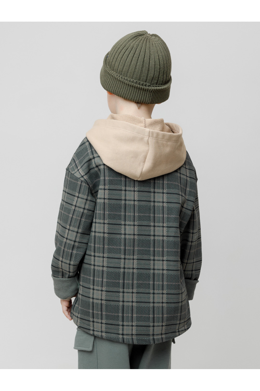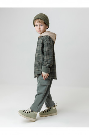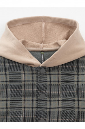 Свободная трикотажная рубашка с капюшоном для мальчика из мягкого петельчатого футера трёхнитки. В составе 80% натурального хлопка и 20% полиэстера, при этом полиэстер ввязан внутрь по особой технологии и не соприкасается с кожей. Застёгивается на кнопки. Рисунок в клетку выполнен из стойких текстильных гипоаллергенных красителей. Изделие сохраняет цвет и форму после многократных стирок. Все трикотажные полотна производятся в соответствии с нормами швейцарского сертификата ЭкоТекс.