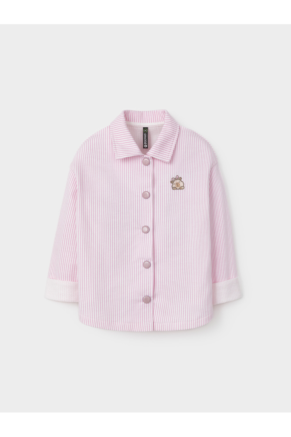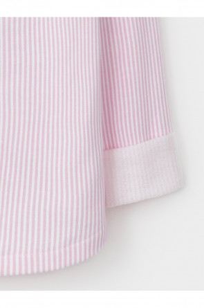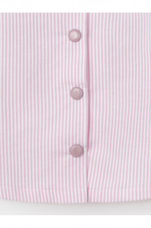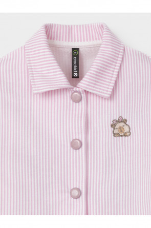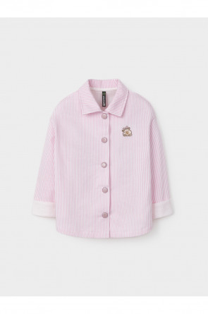 Свободная трикотажная рубашка для девочки из мягкого петельчатого футера. Застёгивается на кнопки. Модель с закруглённым низом и спущенным плечом. Рисунок в полоску выполнен из стойких текстильных гипоаллергенных красителей. Изделие сохраняет цвет и форму после многократных стирок. Все трикотажные полотна производятся в соответствии с нормами швейцарского сертификата ЭкоТекс.