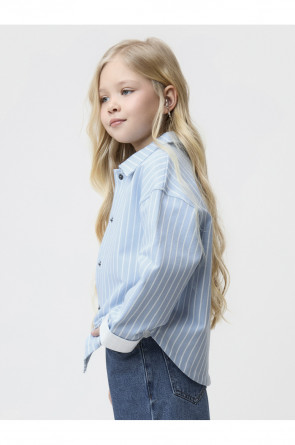 Свободная трикотажная рубашка для девочки из мягкого петельчатого футера. Застёгивается на кнопки. Модель с закруглённым низом и спущенным плечом. Рисунок в полоску выполнен из стойких текстильных гипоаллергенных красителей. Изделие сохраняет цвет и форму после многократных стирок. Все трикотажные полотна производятся в соответствии с нормами швейцарского сертификата ЭкоТекс.