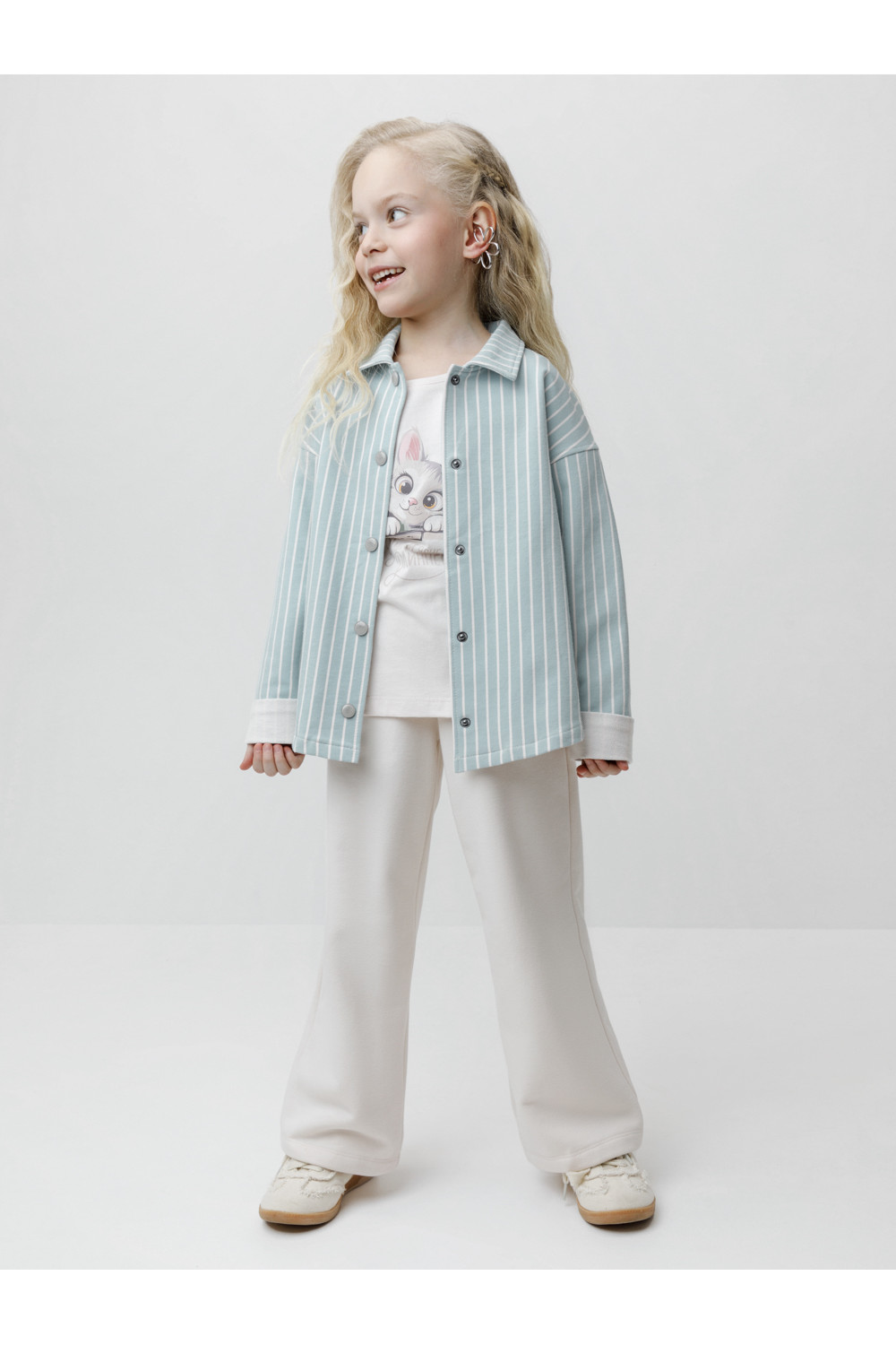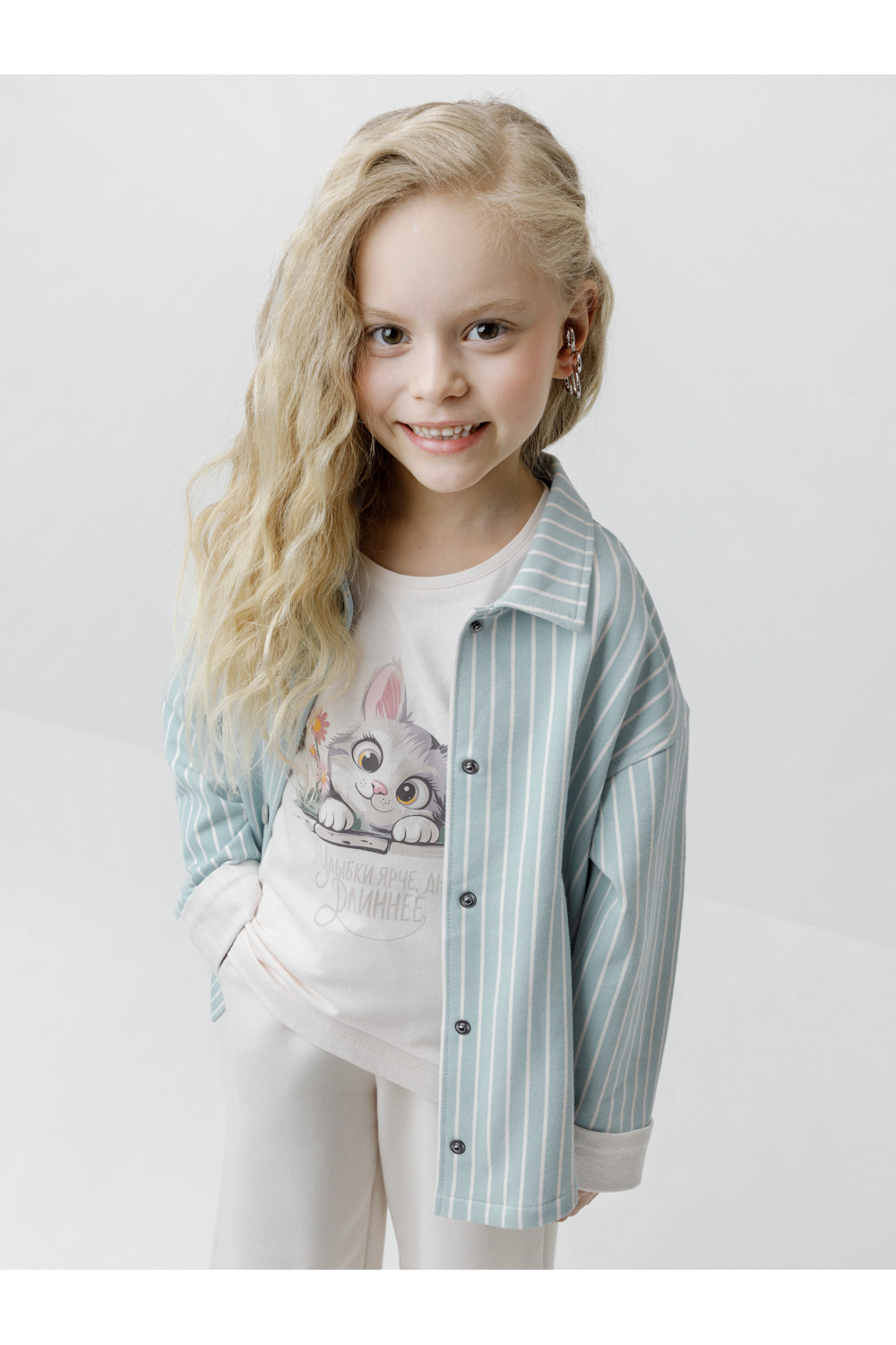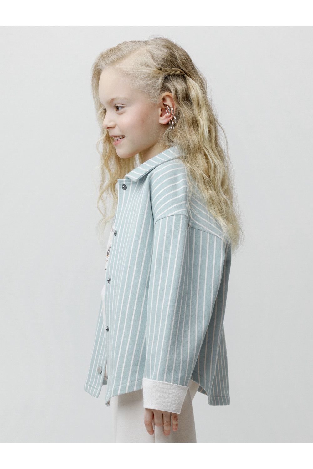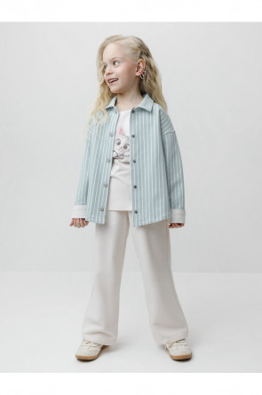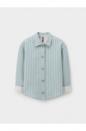 Свободная трикотажная рубашка для девочки из мягкого петельчатого футера. Застёгивается на кнопки. Модель с закруглённым низом и спущенным плечом. Рисунок в полоску выполнен из стойких текстильных гипоаллергенных красителей. Изделие сохраняет цвет и форму после многократных стирок. Все трикотажные полотна производятся в соответствии с нормами швейцарского сертификата ЭкоТекс.