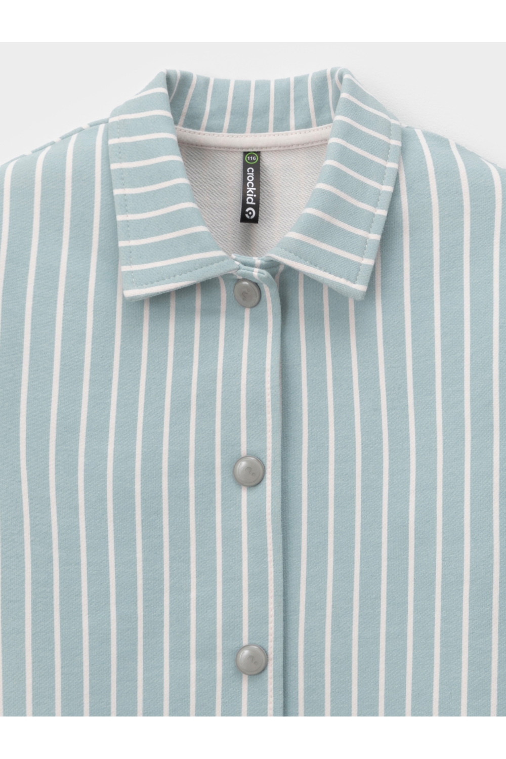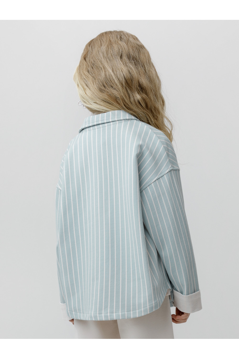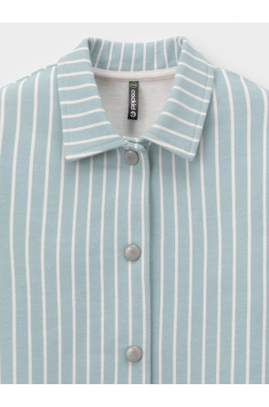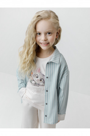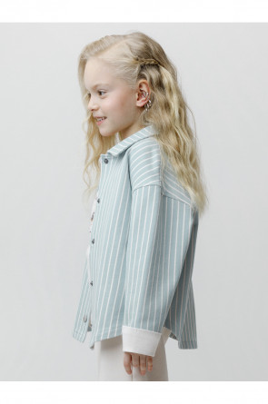 Свободная трикотажная рубашка для девочки из мягкого петельчатого футера. Застёгивается на кнопки. Модель с закруглённым низом и спущенным плечом. Рисунок в полоску выполнен из стойких текстильных гипоаллергенных красителей. Изделие сохраняет цвет и форму после многократных стирок. Все трикотажные полотна производятся в соответствии с нормами швейцарского сертификата ЭкоТекс.