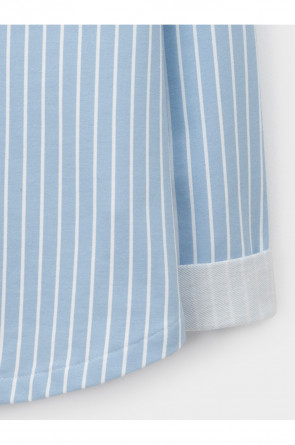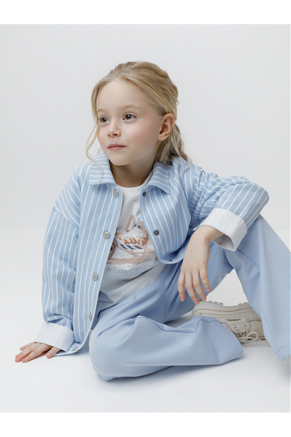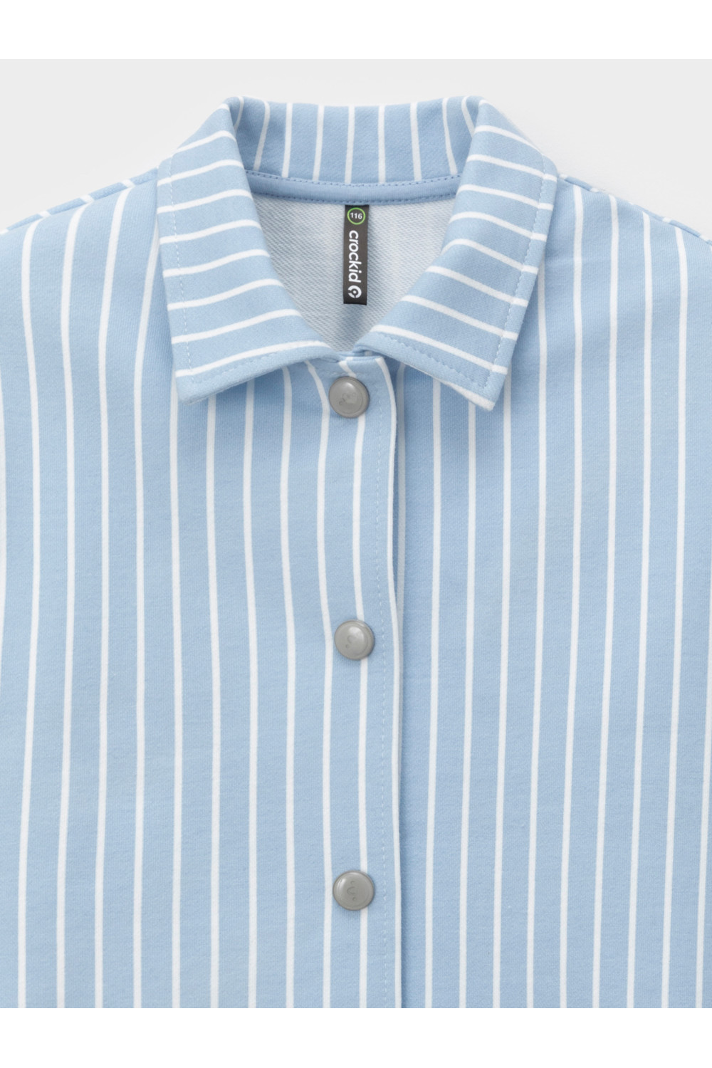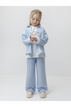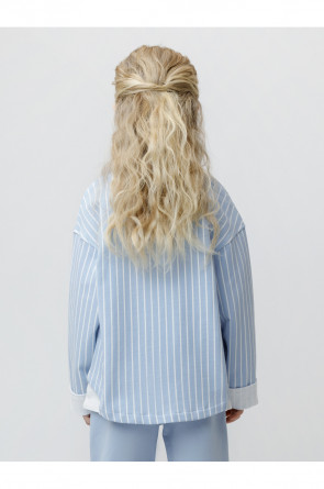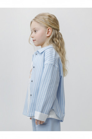Свободная трикотажная рубашка для девочки из мягкого петельчатого футера. Застёгивается на кнопки. Модель с закруглённым низом и спущенным плечом. Рисунок в полоску выполнен из стойких текстильных гипоаллергенных красителей. Изделие сохраняет цвет и форму после многократных стирок. Все трикотажные полотна производятся в соответствии с нормами швейцарского сертификата ЭкоТекс.