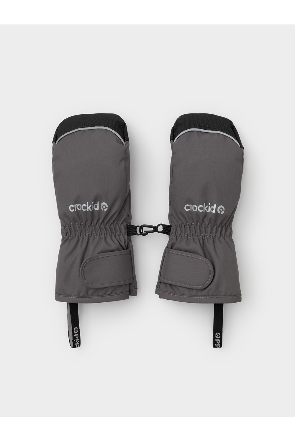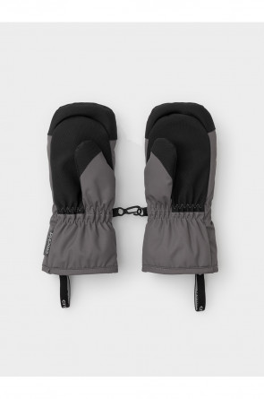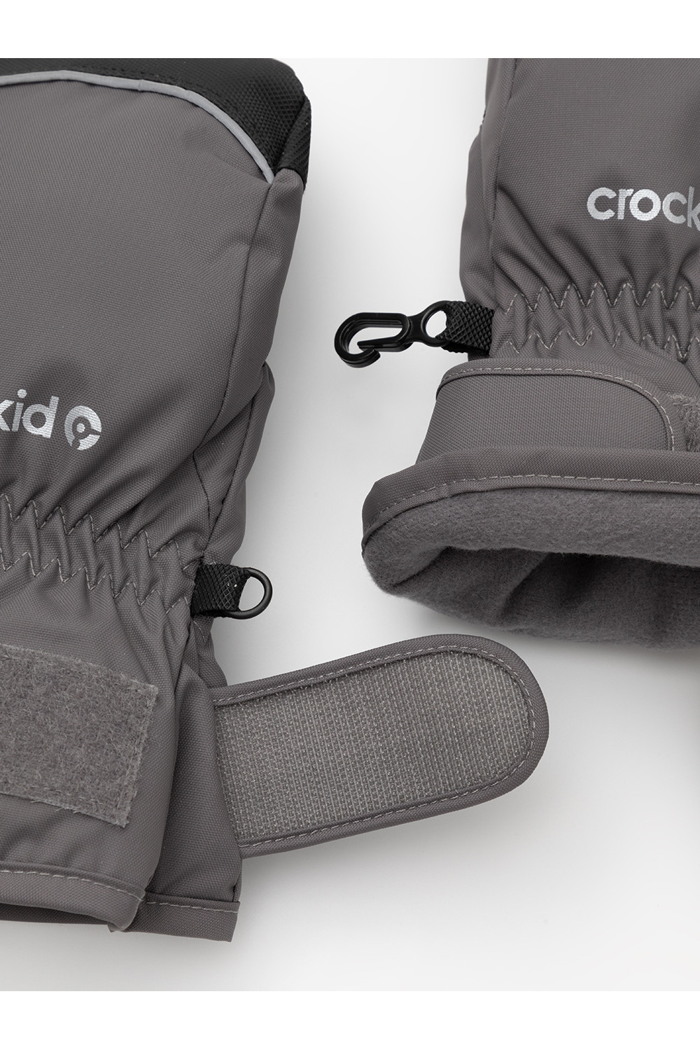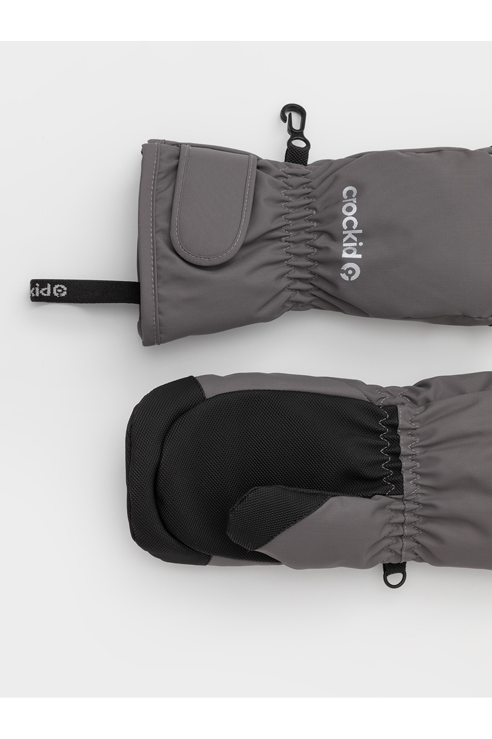 Детские утеплённые рукавицы из однотонной мембранной ткани со вставками из искусственной кожи. Удлинённые манжеты на молнии. Мягкий подклад из флиса. Пластиковый карабин для скрепления рукавиц между собой. Светоотражающие элементы.