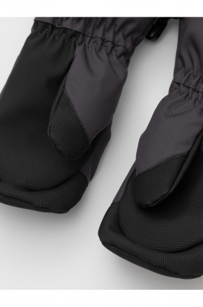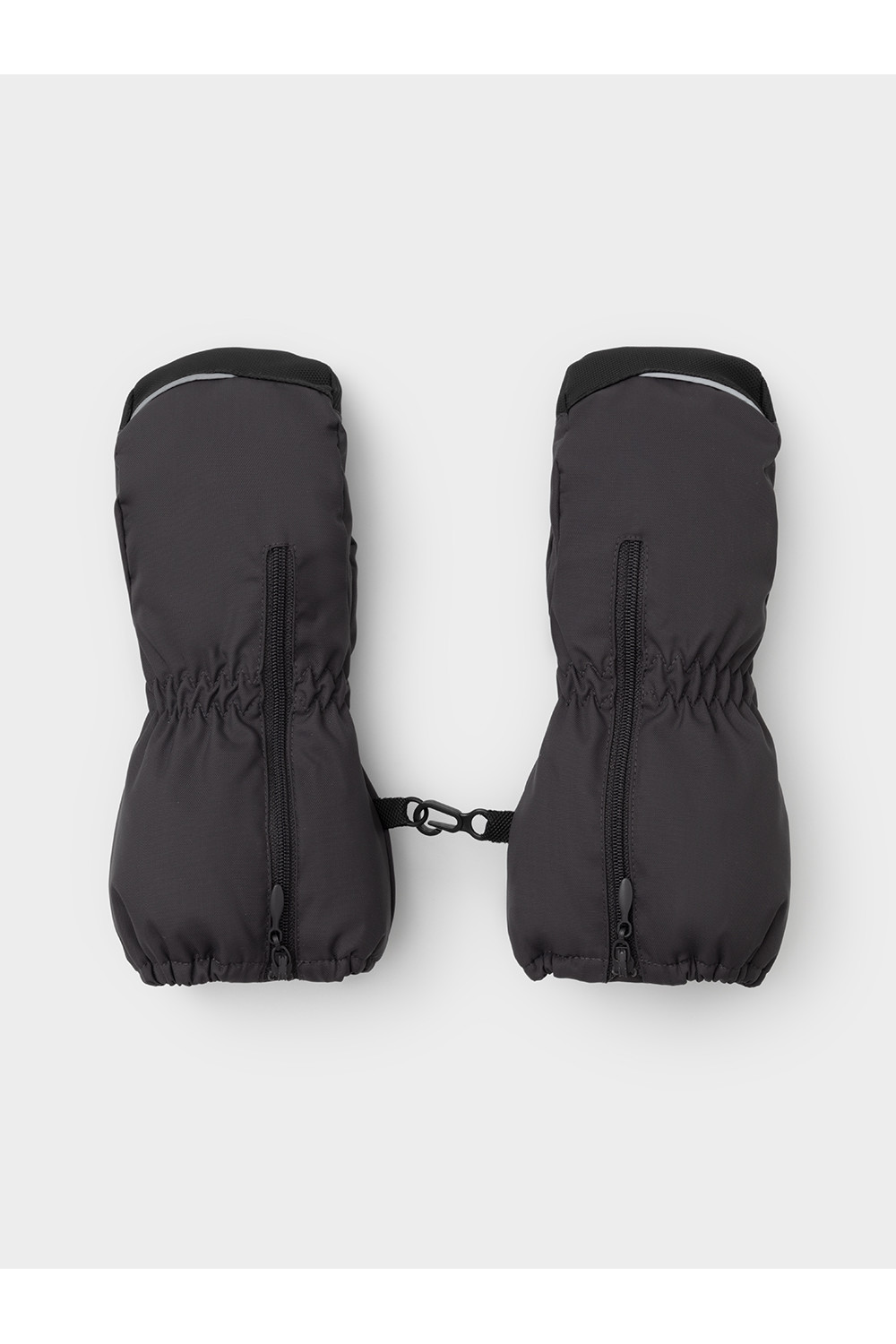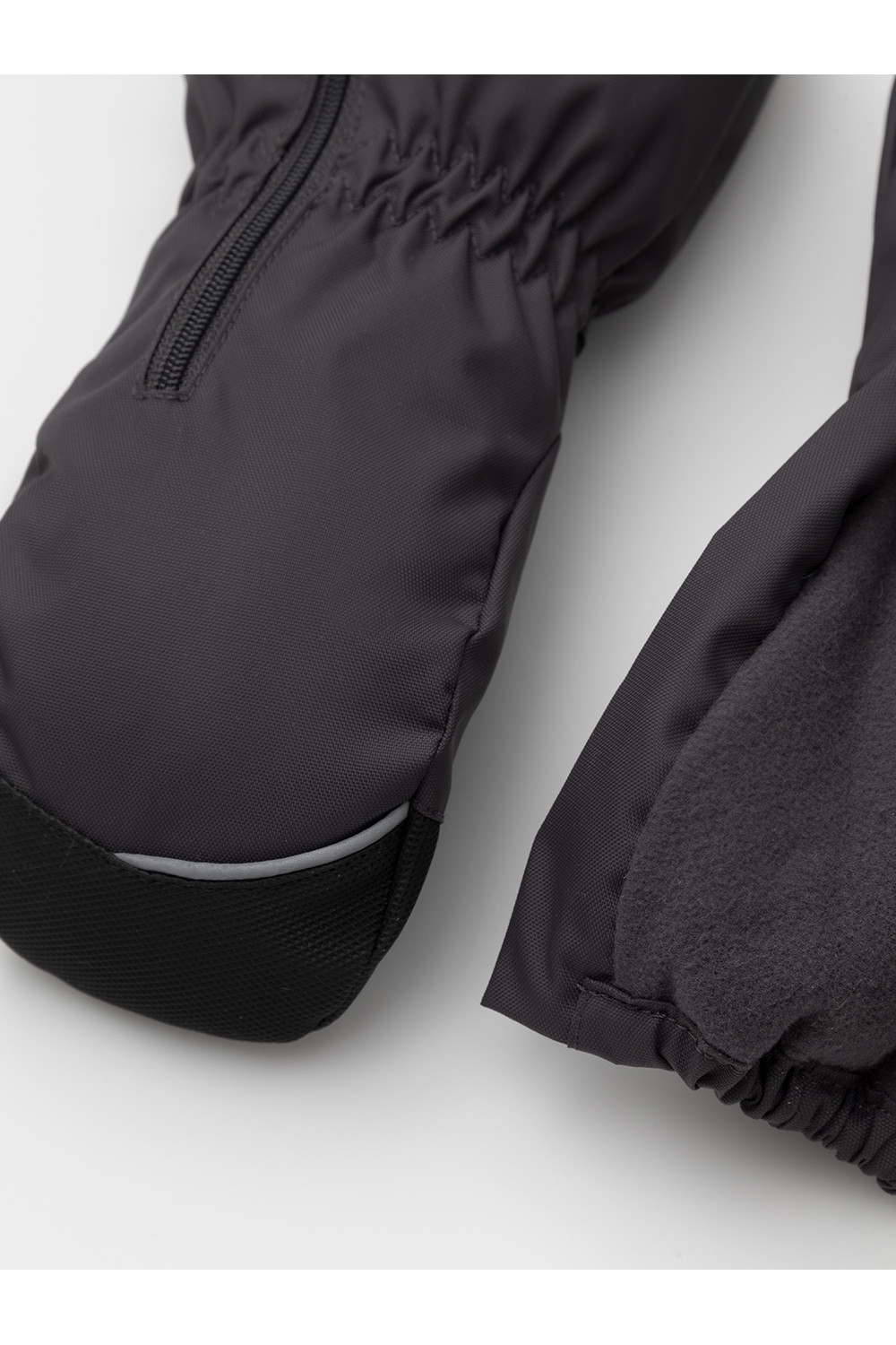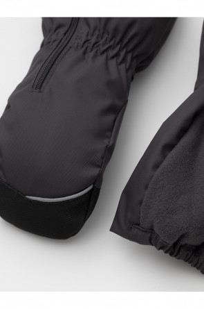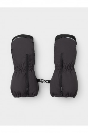 Детские утеплённые рукавицы из однотонной мембранной ткани со вставками из искусственной кожи. Удлинённые манжеты на молнии. Мягкий подклад из флиса. Пластиковый карабин для скрепления рукавиц между собой. Светоотражающие элементы.