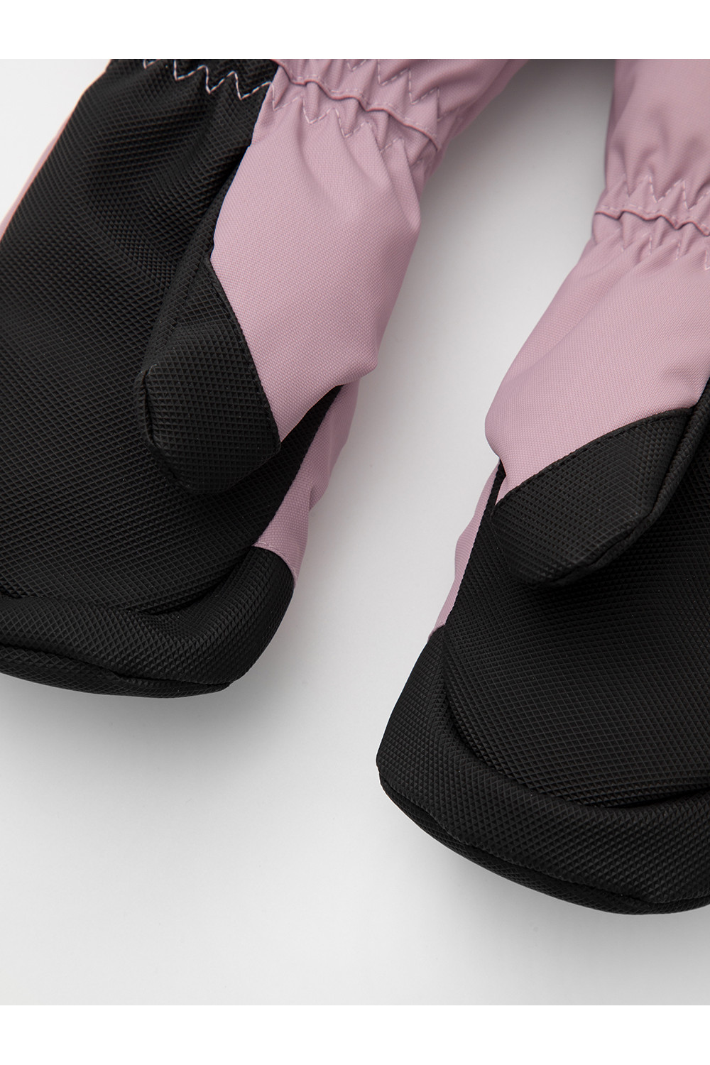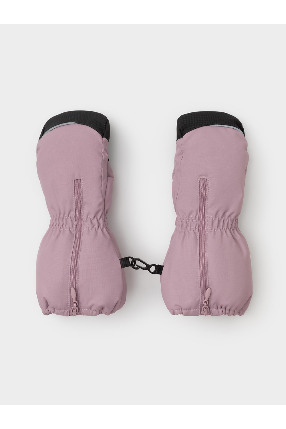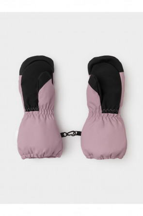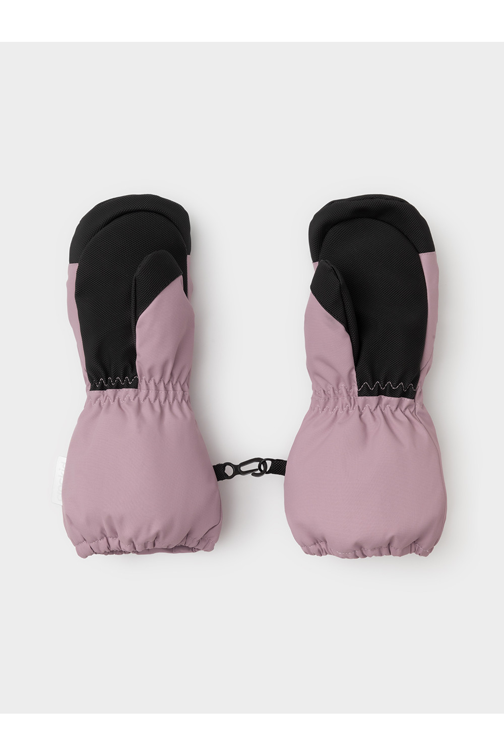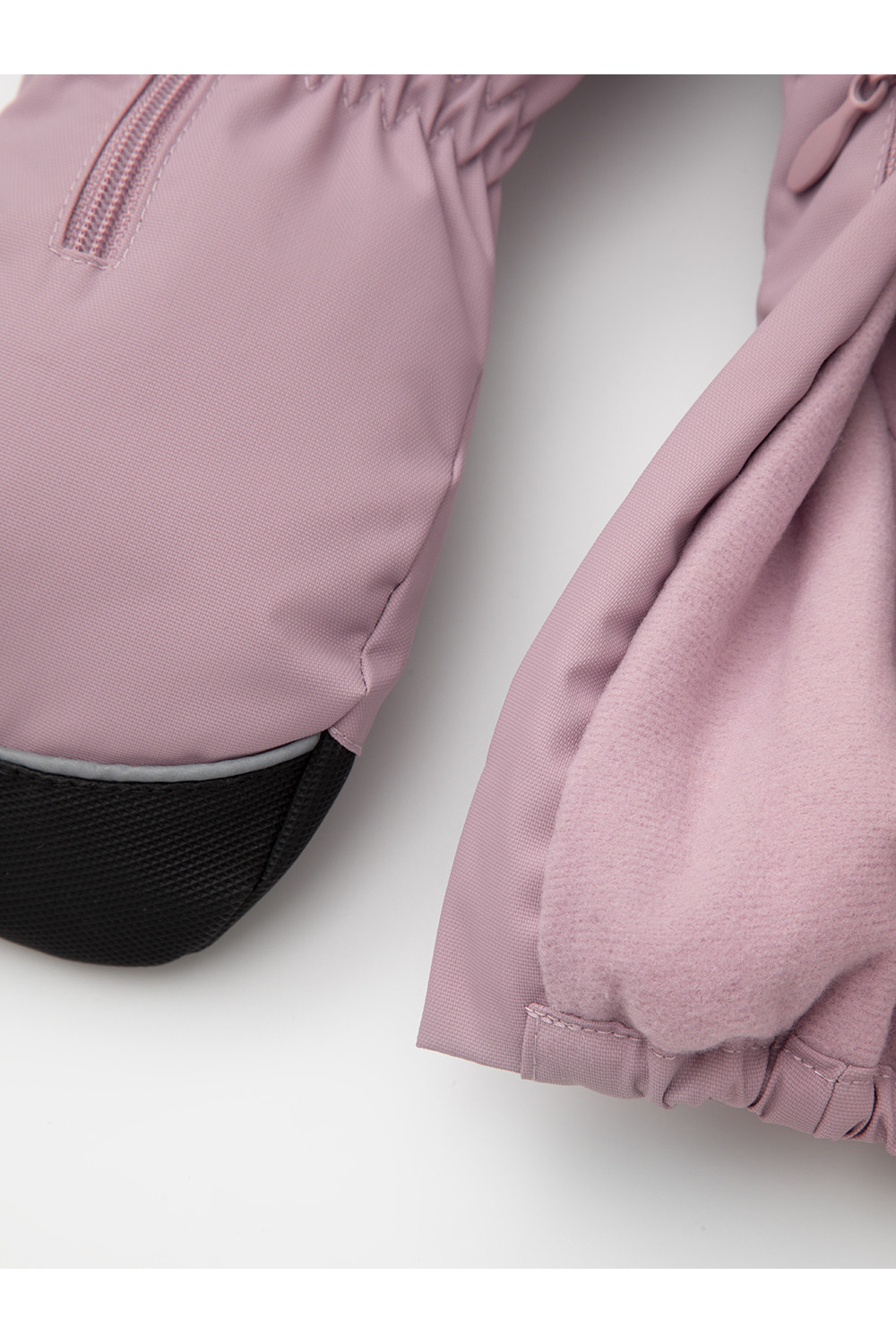 Детские утеплённые рукавицы из однотонной мембранной ткани со вставками из искусственной кожи. Удлинённые манжеты на молнии. Мягкий подклад из флиса. Пластиковый карабин для скрепления рукавиц между собой. Светоотражающие элементы.