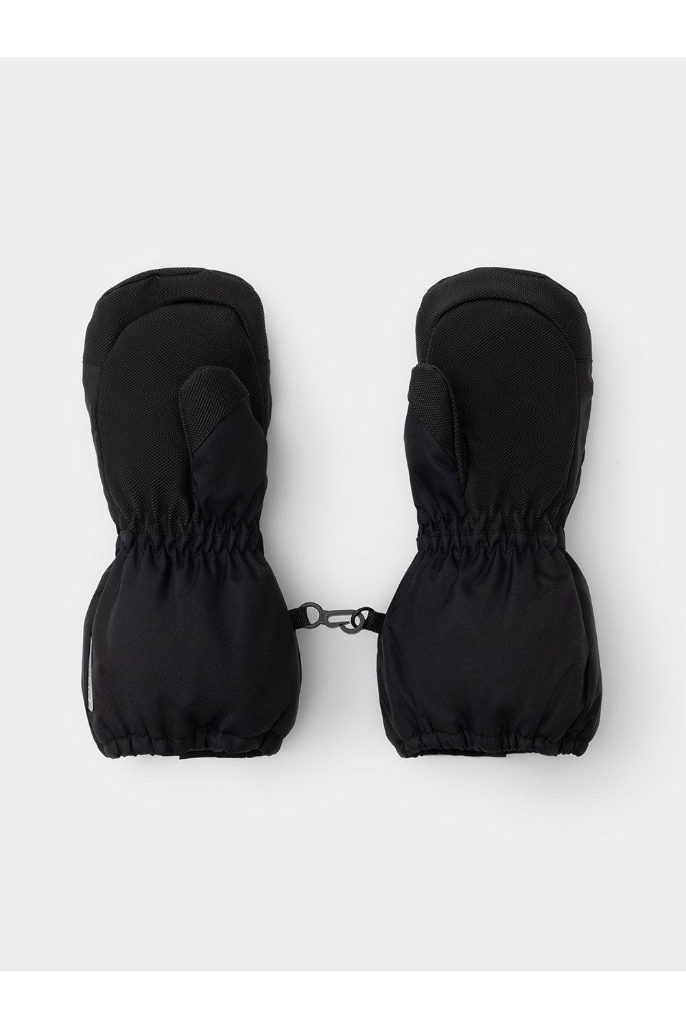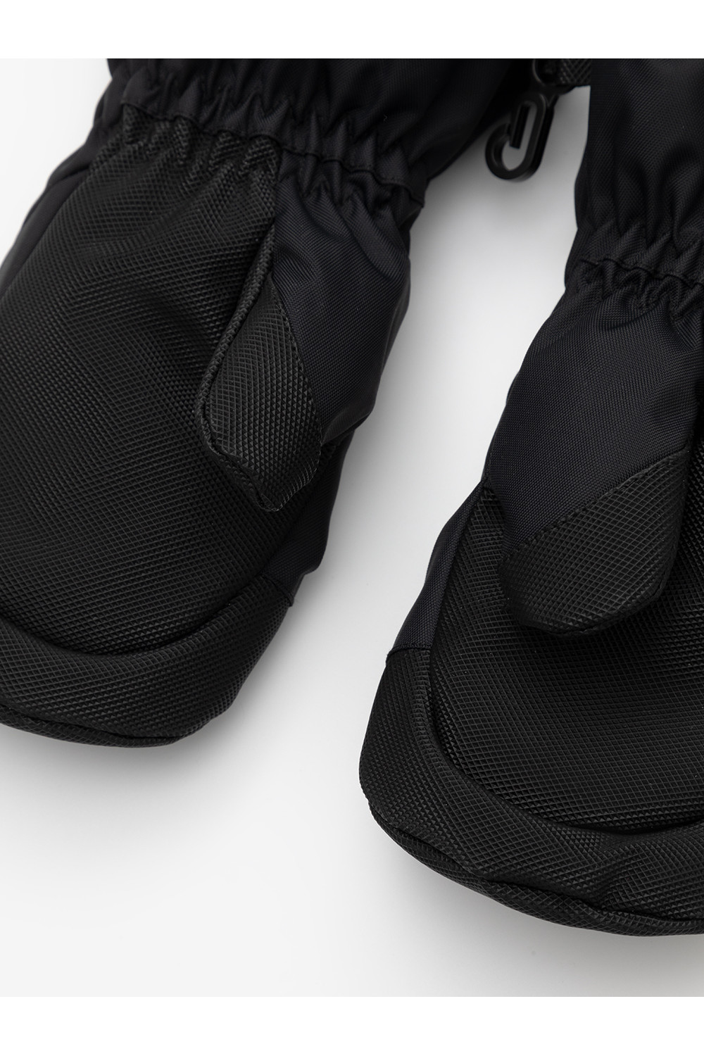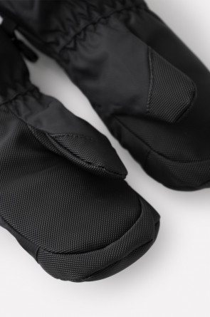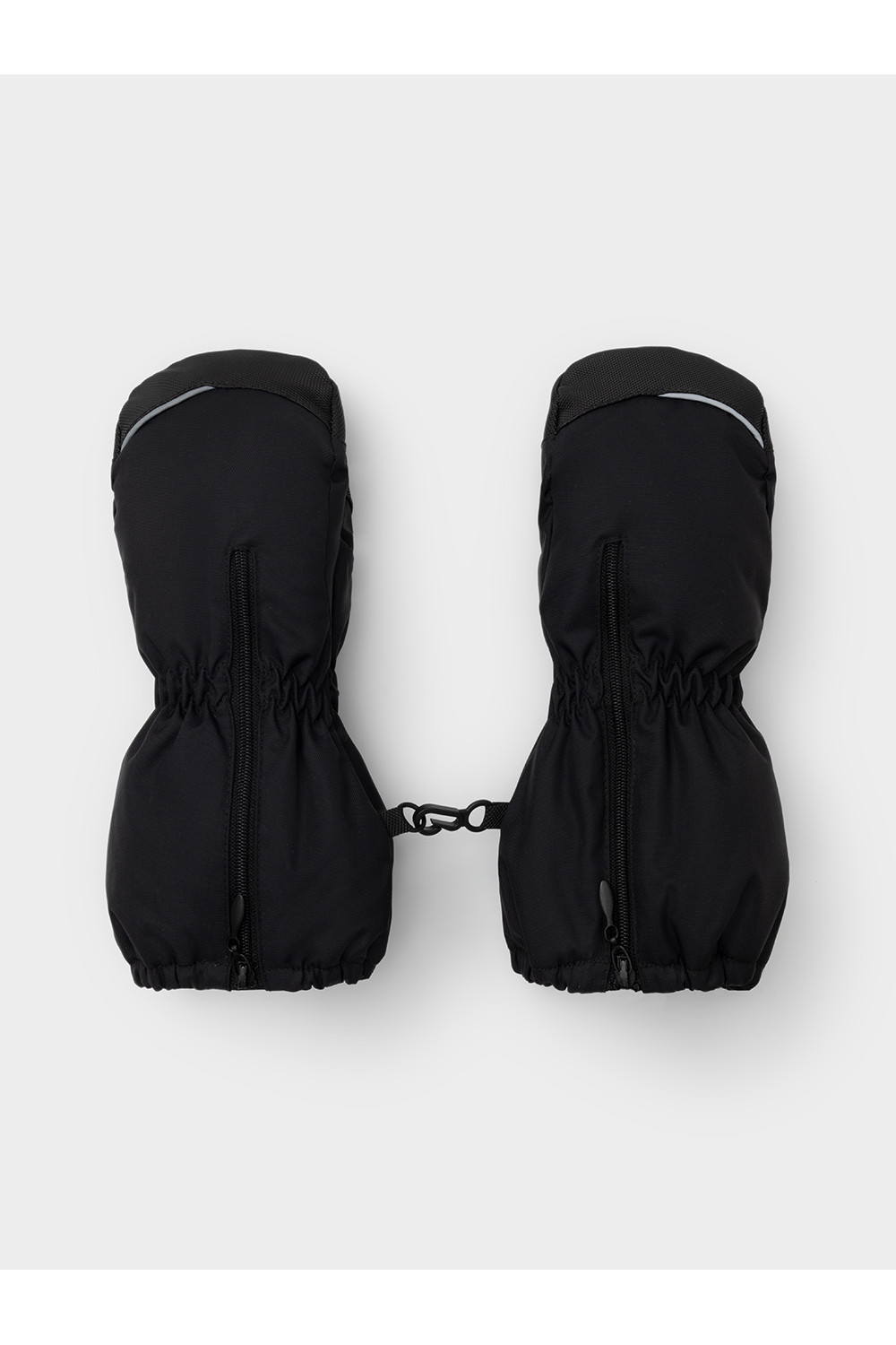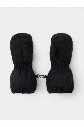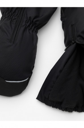 Детские утеплённые рукавицы из однотонной мембранной ткани со вставками из искусственной кожи. Удлинённые манжеты на молнии. Мягкий подклад из флиса. Пластиковый карабин для скрепления рукавиц между собой. Светоотражающие элементы.
