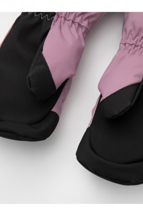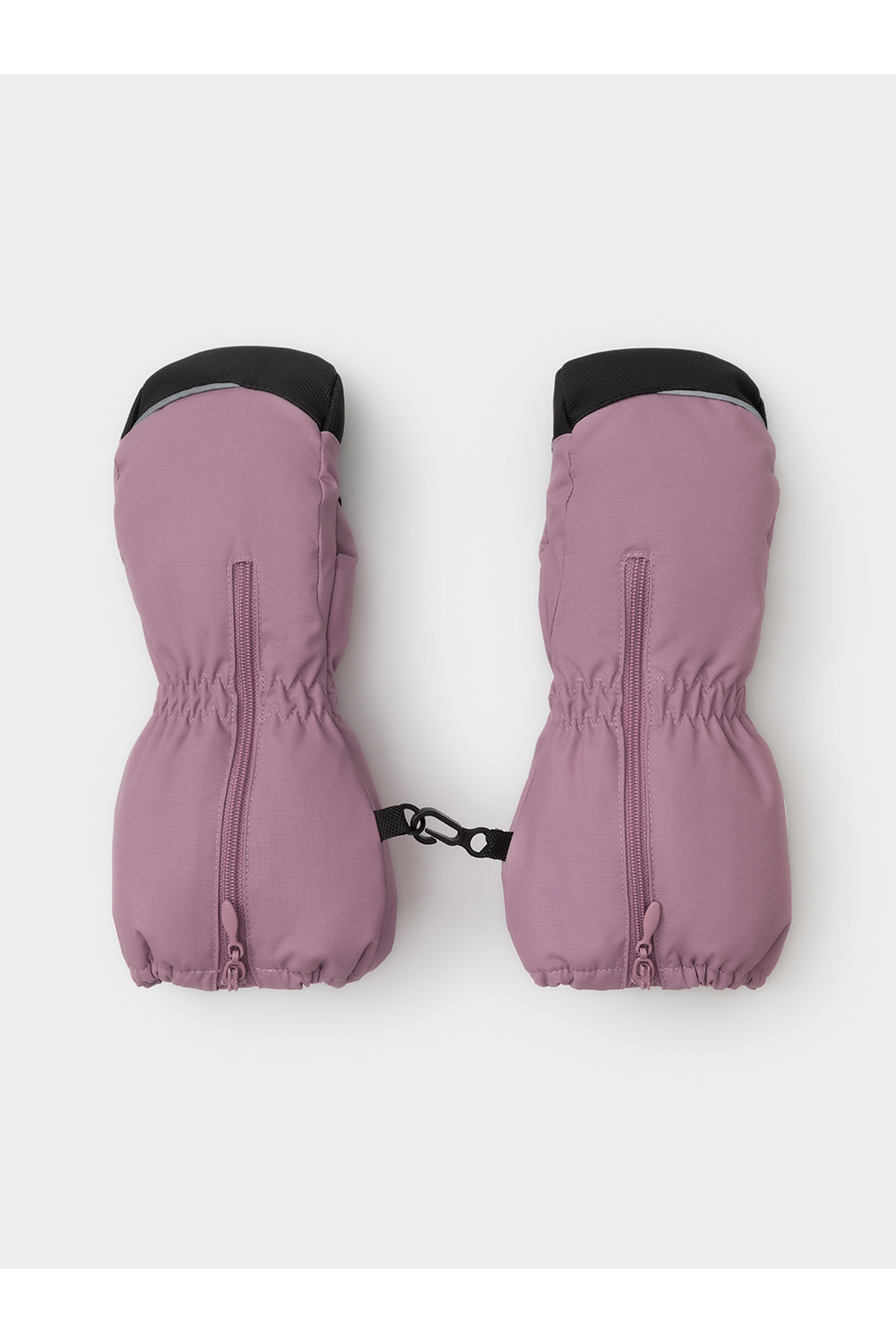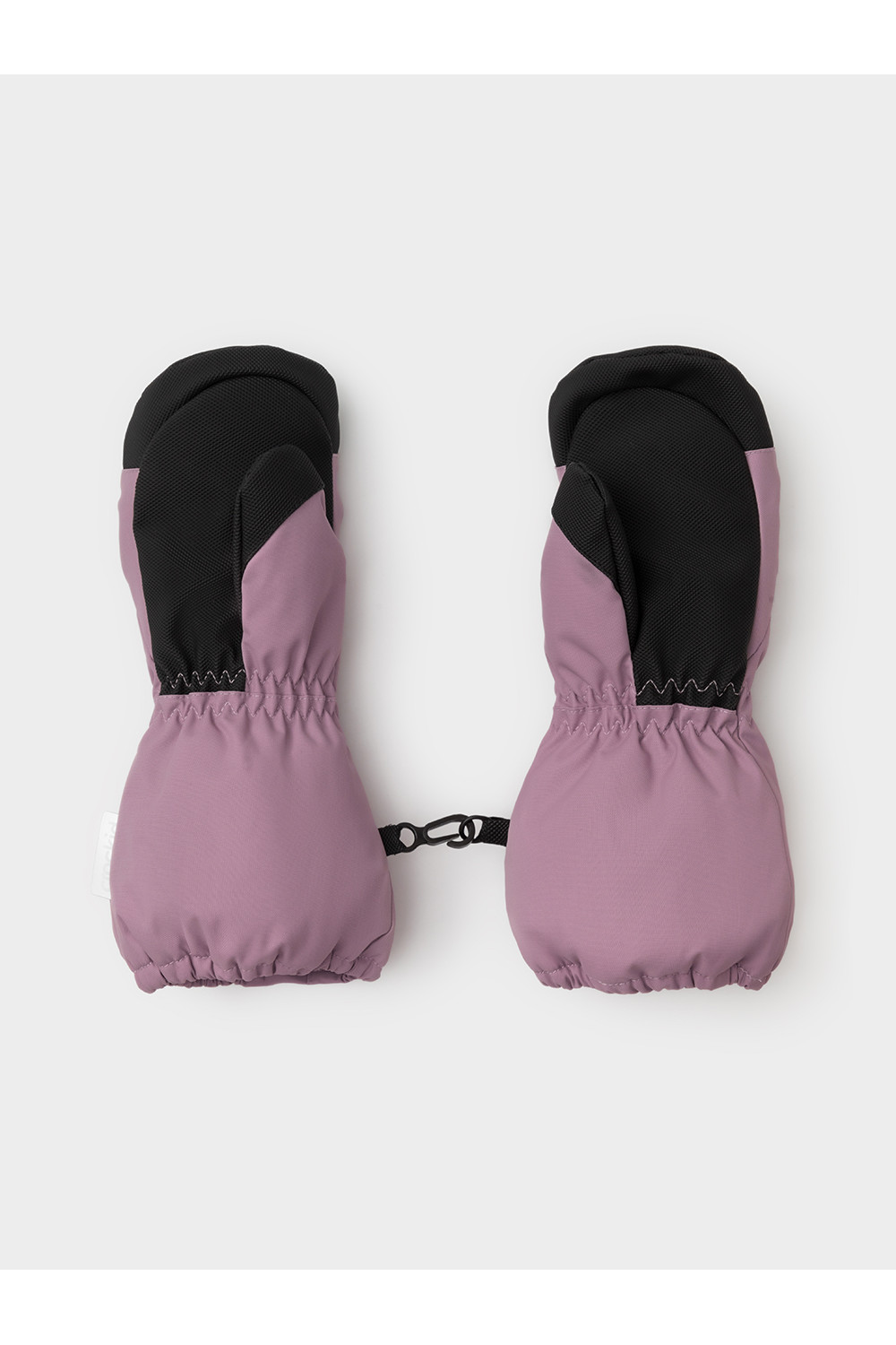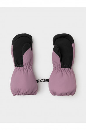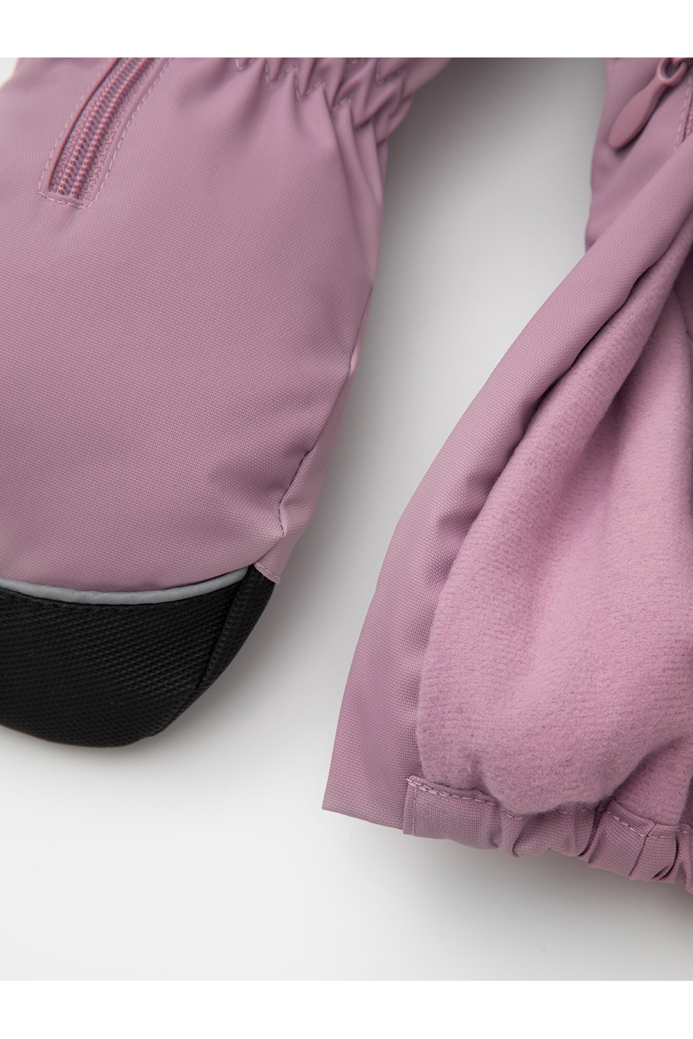Детские утеплённые рукавицы из однотонной мембранной ткани со вставками из искусственной кожи. Удлинённые манжеты на молнии. Мягкий подклад из флиса. Пластиковый карабин для скрепления рукавиц между собой. Светоотражающие элементы.