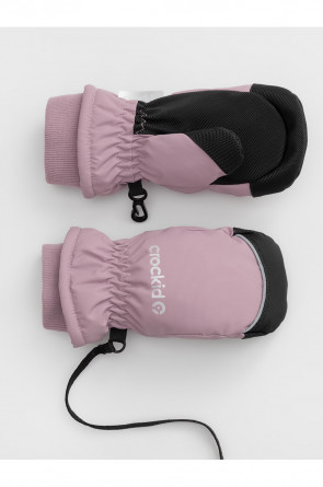 Утеплённые детские рукавицы из мембранной ткани со вставками из искусственной кожи. Эластичная внутренняя манжета из мягкого материала плотно прилегает к запястью и надёжно защищает руки от ветра и снега. Внутри подклад из флиса. Пластиковый карабин и шнур скрепляют рукавицы между собой. Светоотражающие элементы служат для дополнительной безопасности в тёмное время суток.