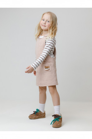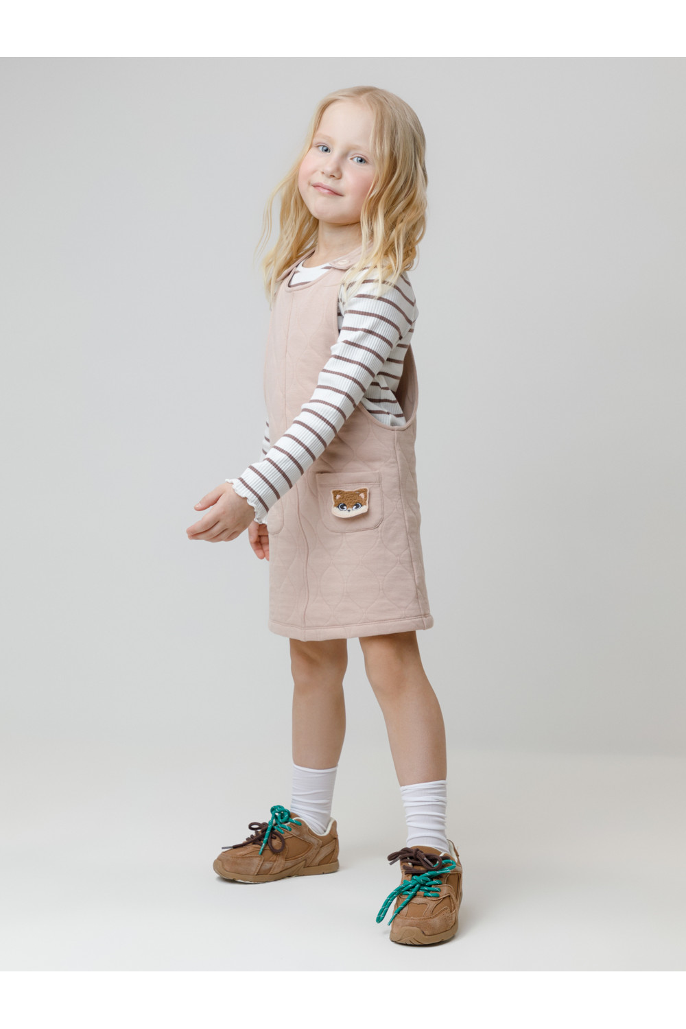 Сарафан на лямках из капитония с двумя накладными карманами. Капитоний – это стёганое трикотажное полотно с утеплителем из полиэстеровой нити. Лямки застегиваются на пуговицы. Все трикотажные полотна производятся в соответствии с нормами швейцарского сертификата ЭкоТекс.