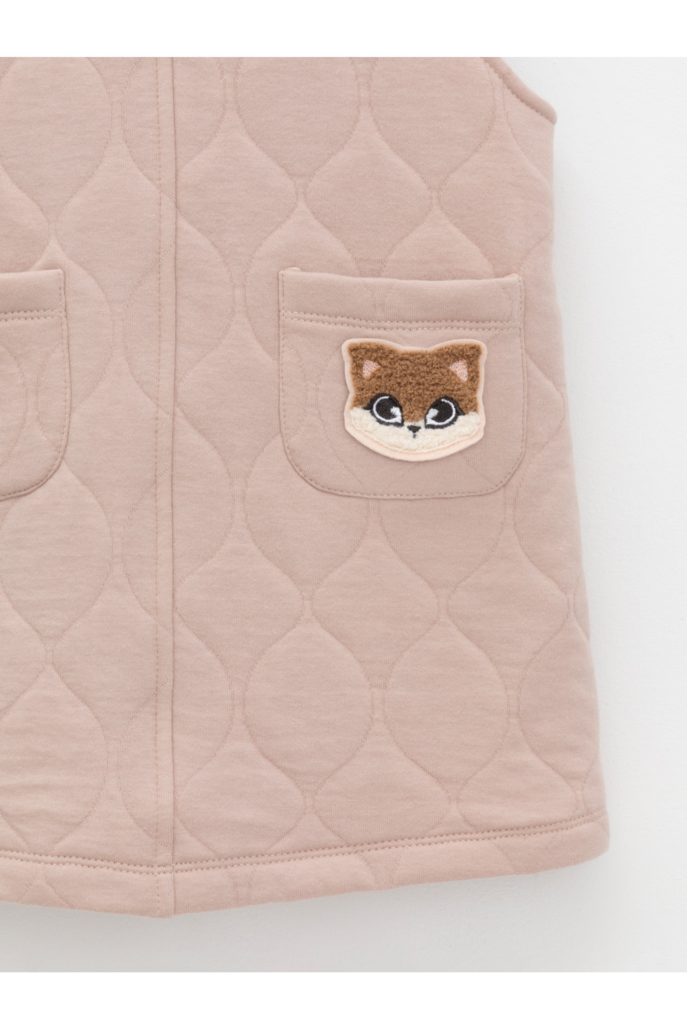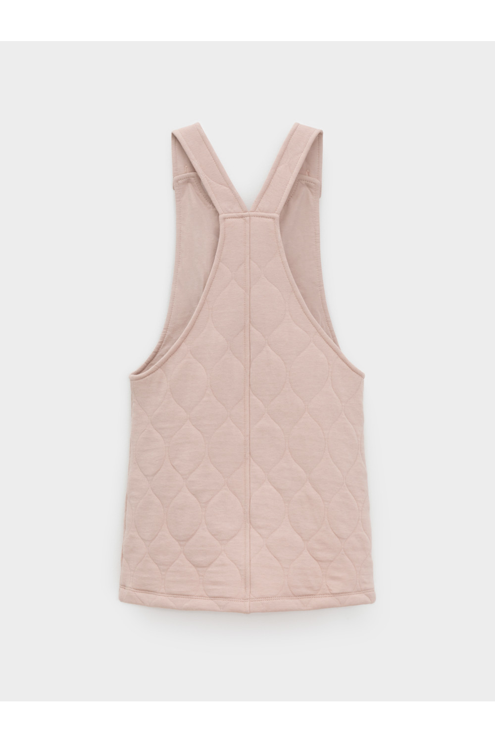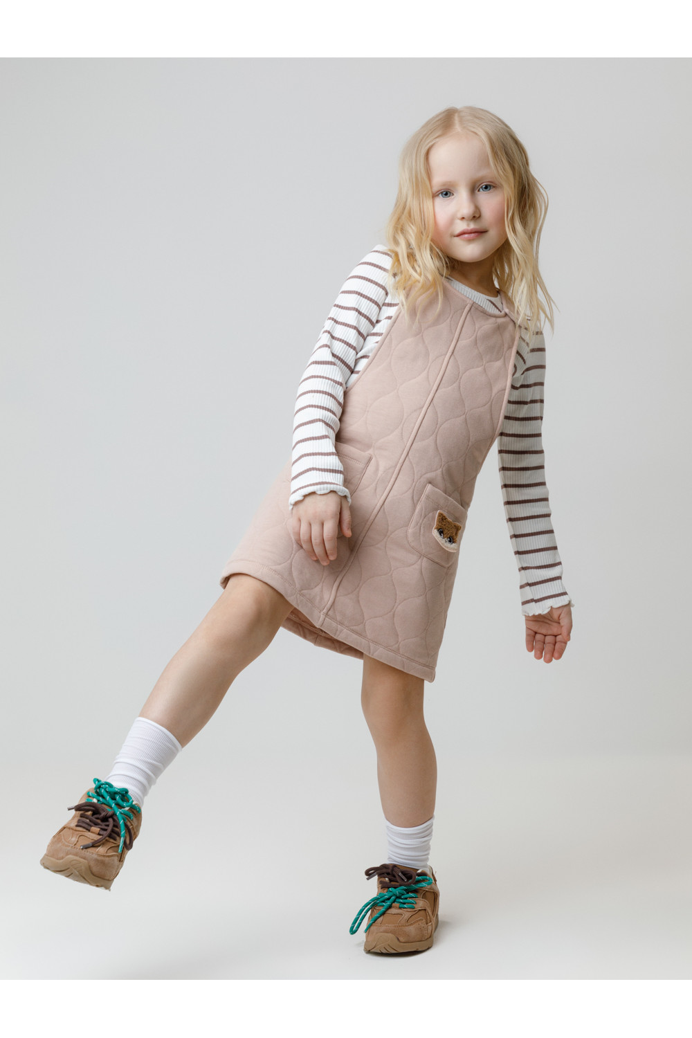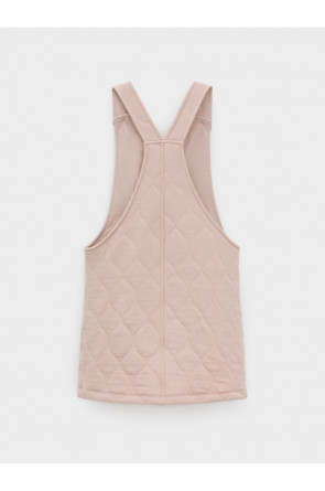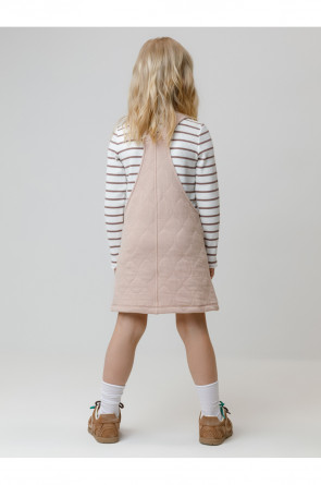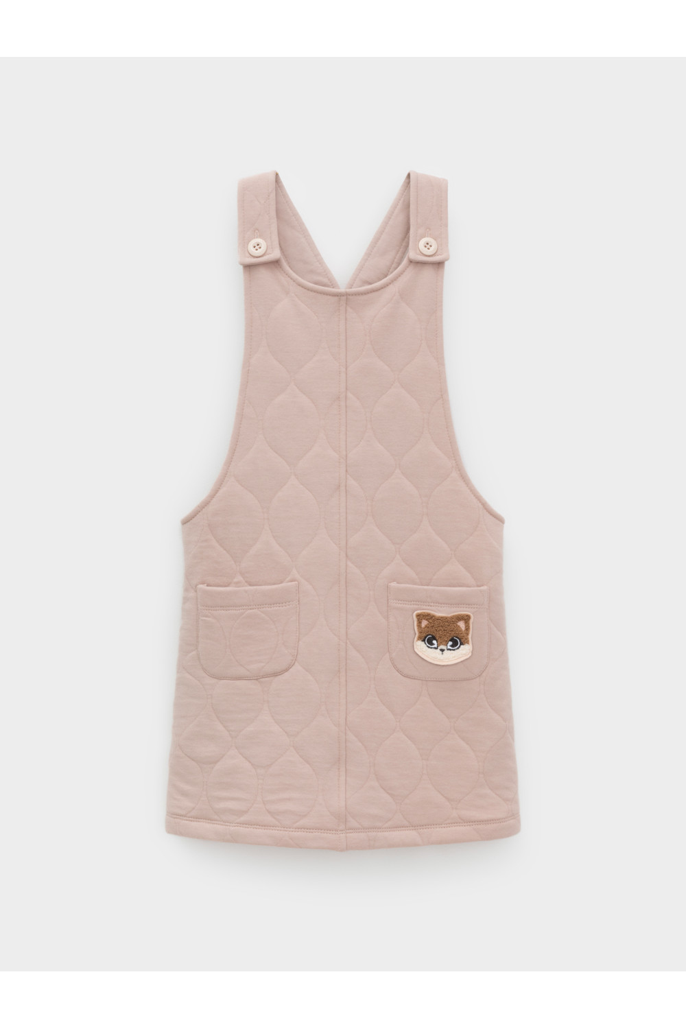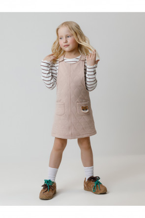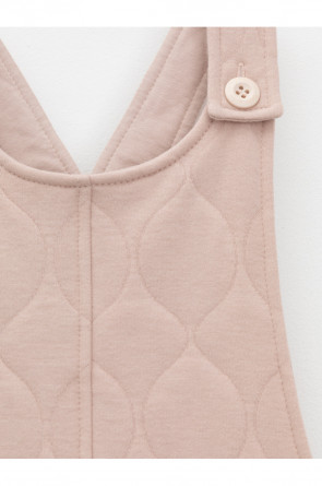 Сарафан на лямках из капитония с двумя накладными карманами. Капитоний – это стёганое трикотажное полотно с утеплителем из полиэстеровой нити. Лямки застегиваются на пуговицы. Все трикотажные полотна производятся в соответствии с нормами швейцарского сертификата ЭкоТекс.