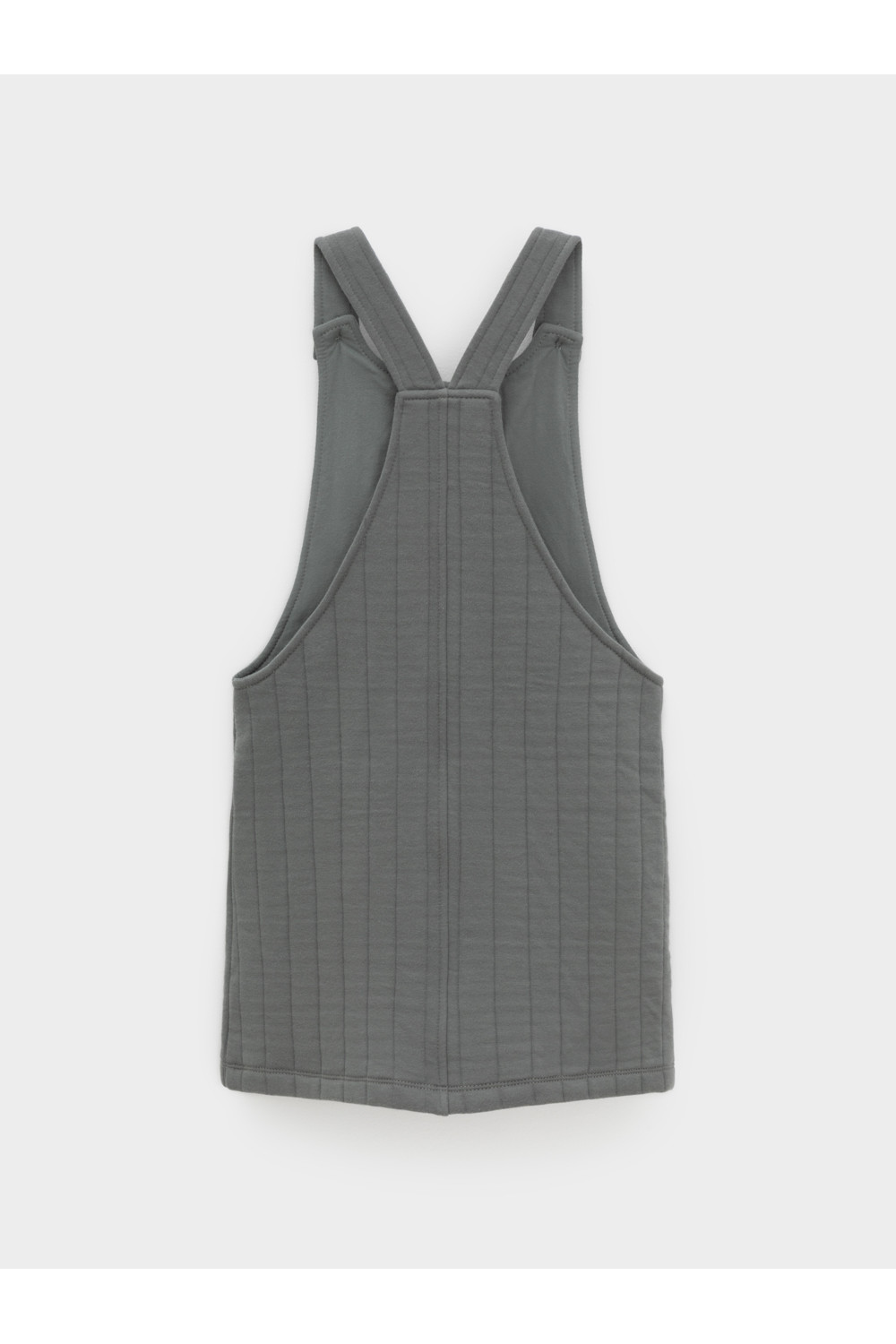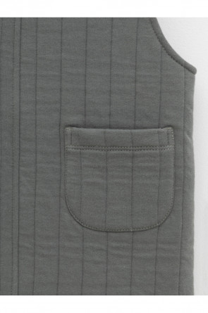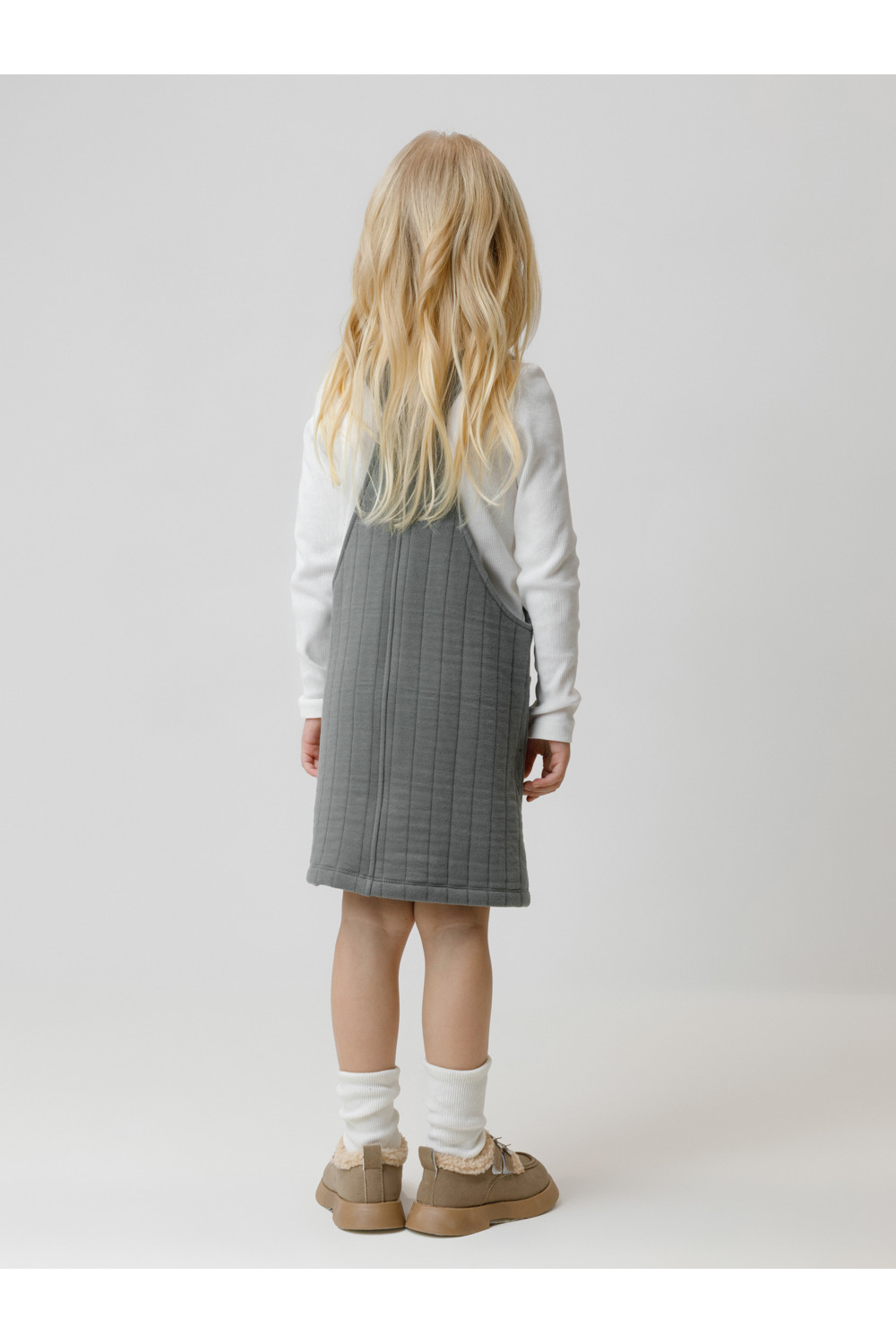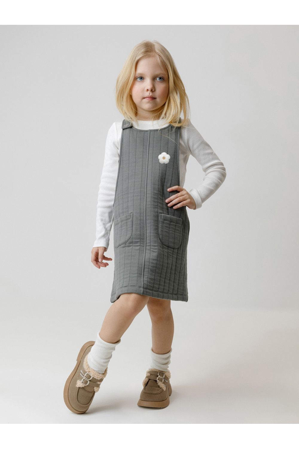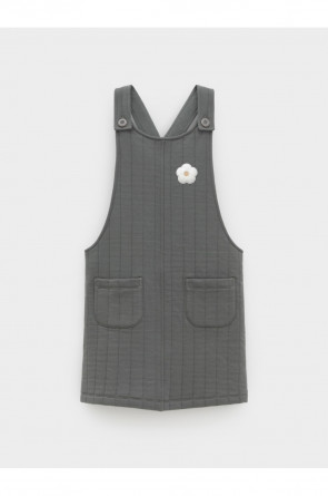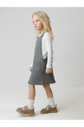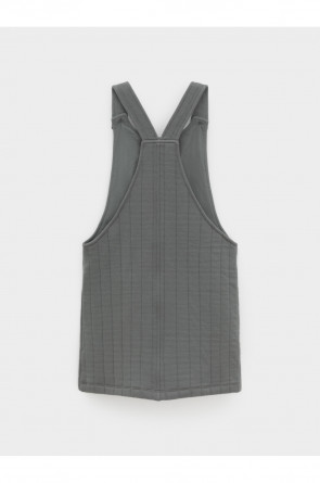 Сарафан на лямках из капитония с двумя накладными карманами. Капитоний – это стёганое трикотажное полотно с утеплителем из полиэстеровой нити. Лямки застегиваются на пуговицы. Все трикотажные полотна производятся в соответствии с нормами швейцарского сертификата ЭкоТекс.