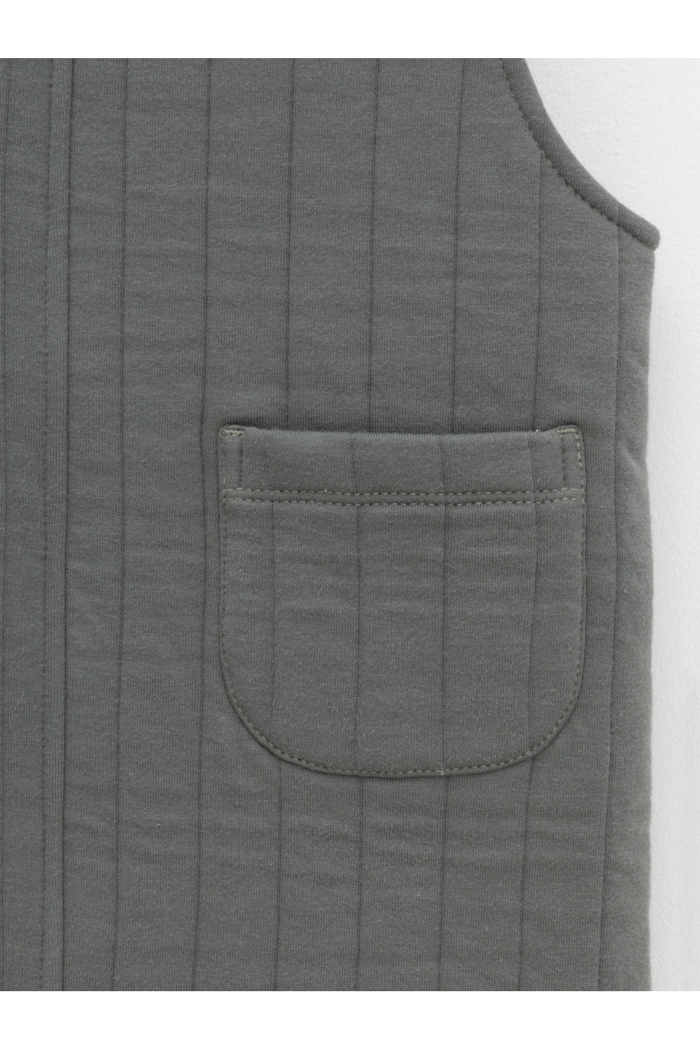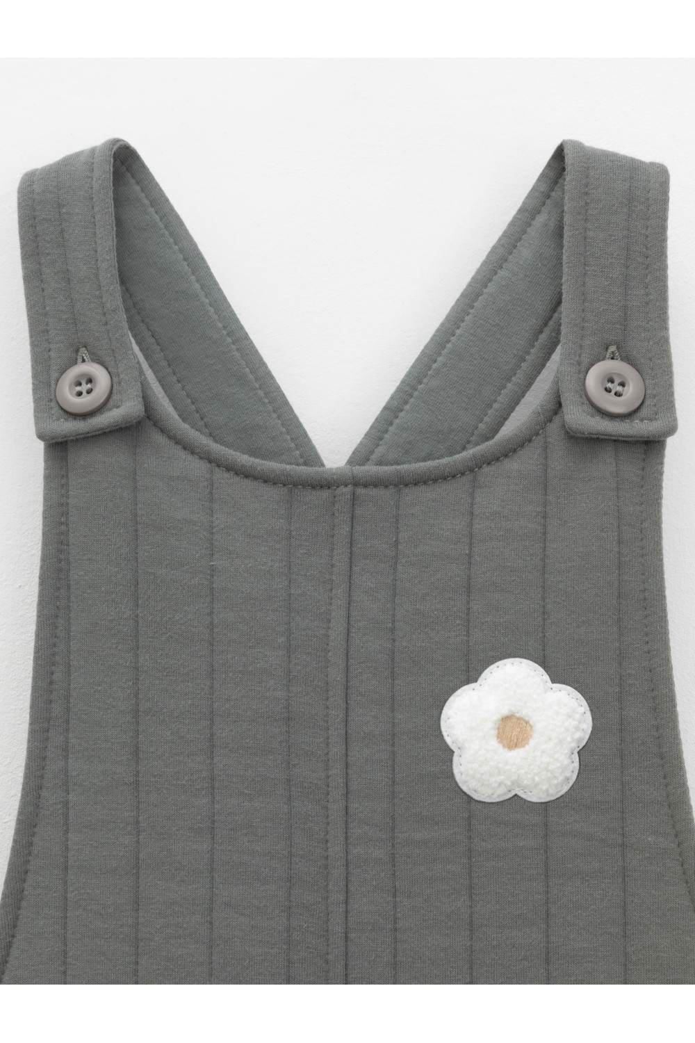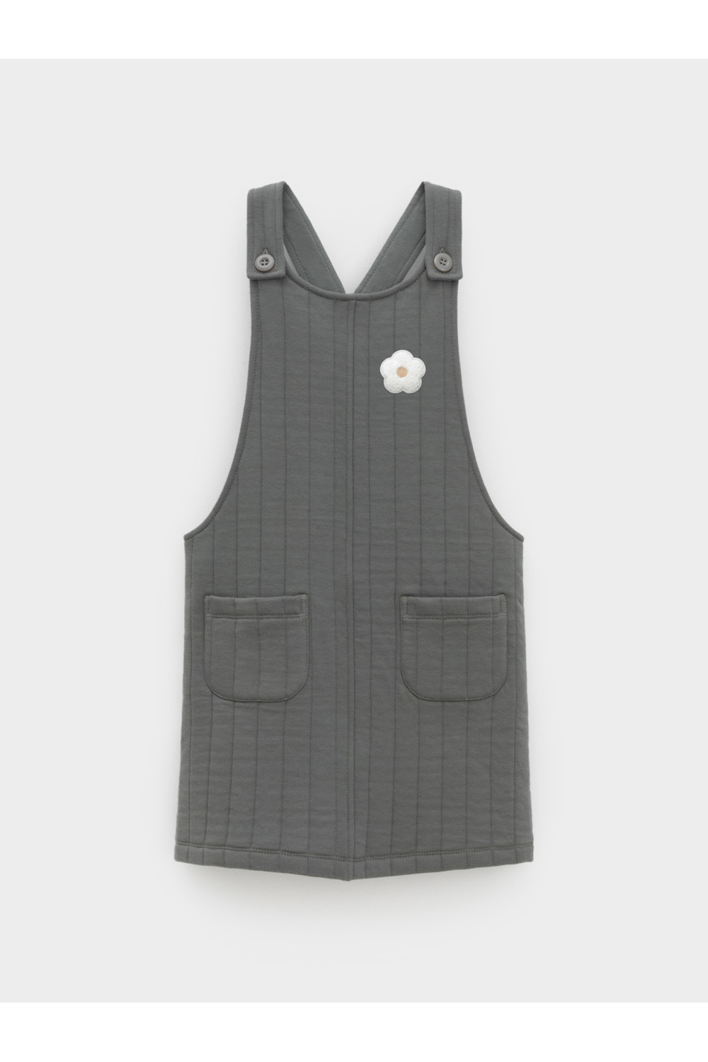 Сарафан на лямках из капитония с двумя накладными карманами. Капитоний – это стёганое трикотажное полотно с утеплителем из полиэстеровой нити. Лямки застегиваются на пуговицы. Все трикотажные полотна производятся в соответствии с нормами швейцарского сертификата ЭкоТекс.