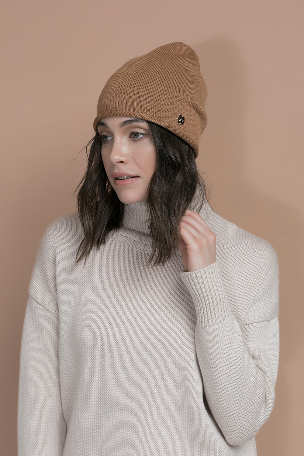 Однотонная вязаная шапка из хлопка и акрила. Впереди украшена металлической шильдой с фирменным логотипом VN.