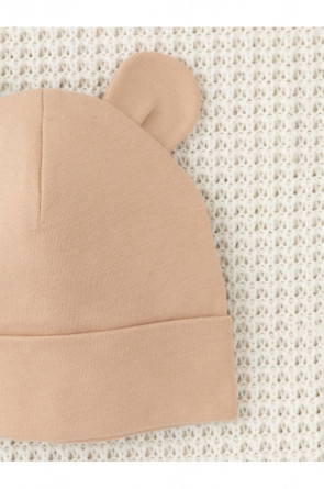 Шапка с отворотом для новорождённых из мягкого эластичного трикотажа интерлок, произведённого из натурального хлопка. Украшена декоративными ушками. Все трикотажные полотна производятся в соответствии с нормами Швейцарского сертификата ЭкоТекс.