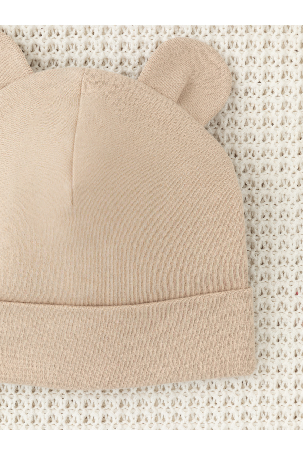 Шапка с отворотом для новорождённых из мягкого эластичного трикотажа интерлок, произведённого из натурального хлопка. Украшена декоративными ушками. Все трикотажные полотна производятся в соответствии с нормами Швейцарского сертификата ЭкоТекс.